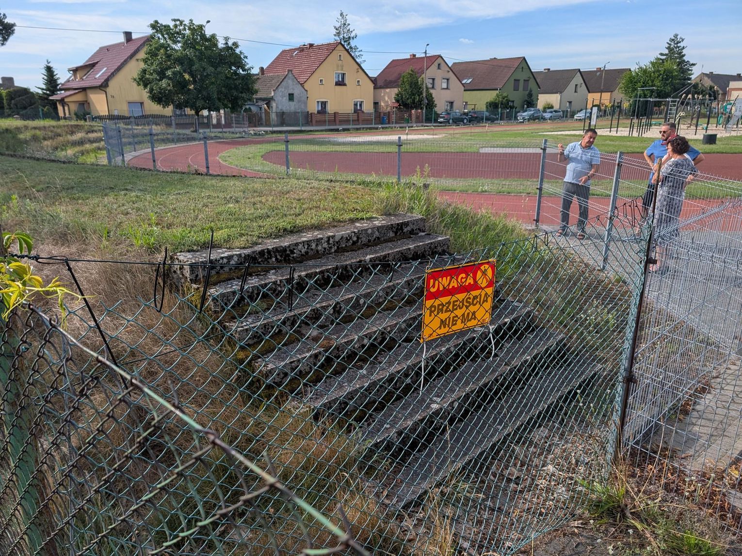 Przedstawiciele gminy Oława - w tym wójt Artur Piotrowski - oraz Szkoły Podstawowej w Bystrzycy sprawdzali dzisiaj, czy na opuszczonym fragmencie szkolnego boiska, które kiedyś funkcjonowało jako trybuny, będzie można urządzić ogród sensoryczny. Zastanawiano się także, jak to zrobić.