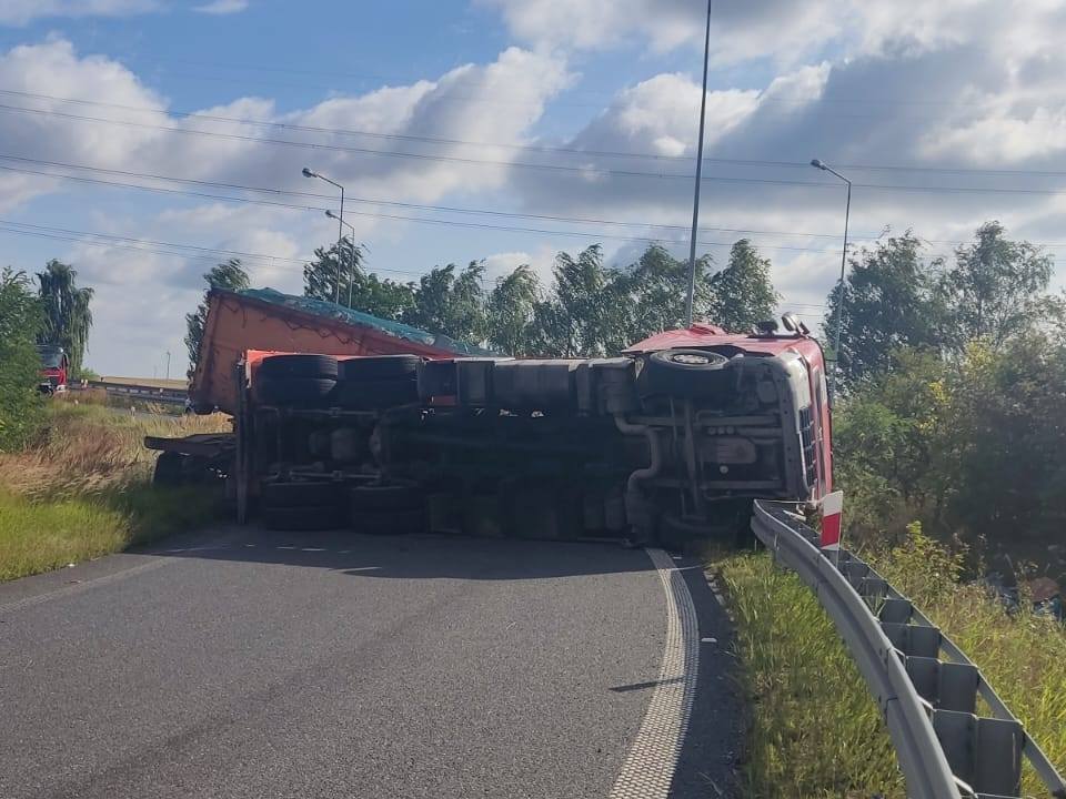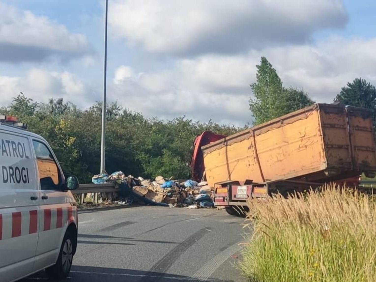 Na chwilę obecną z nieustalonych przyczyn doszło do wywrócenia się samochody ciężarowego, z którego wysypały się śmieci.
