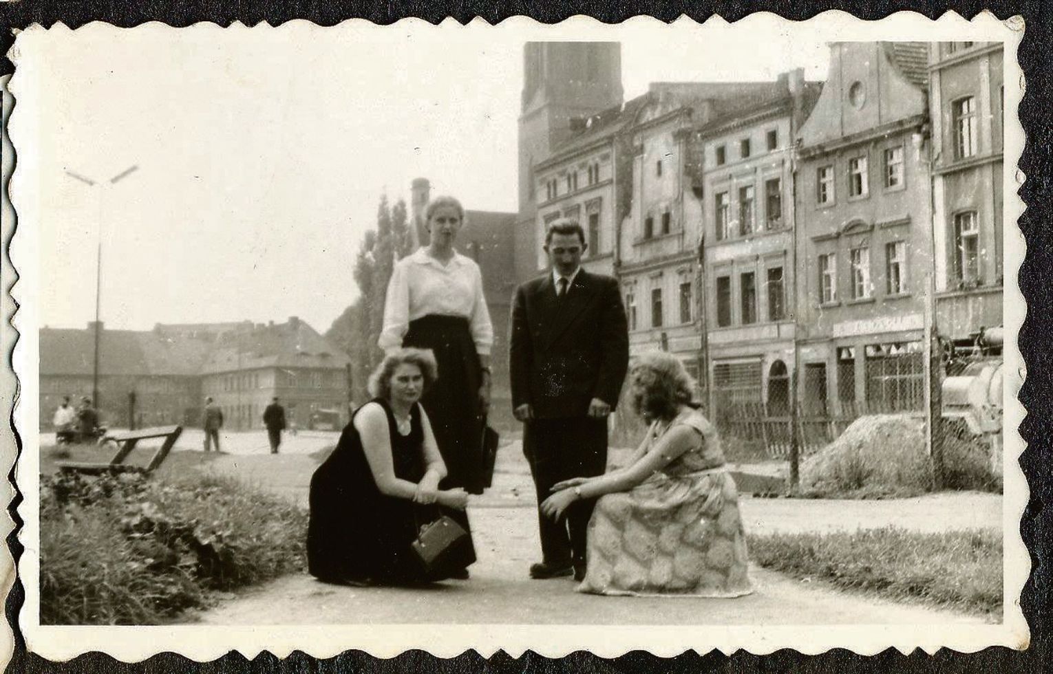 Zdjęcie nr 1 zrobione jest na oławskim Rynku na przełomie lat pięćdziesiątych i sześćdziesiątych. Na zdjęciu widzimy siostry Żbikowskie i Mariana Kobla. Wtedy był trawnik w Rynku zrobiony na placu w miejscu zniszczonych przedwojennych budynków, a dziś w tym samym miejscu stoi budynek Rynek 32. Po prawej na ulicy Wrocławskiej widać ogrodzenie placu budowy i dużą betoniarkę - to remont budynku przy ulicy Wrocławskiej 6, który w czasie wojny został wypalony i gruzy były do pierwszego piętra. W głębi widać pustą oczyszczoną z gruzu pierzeję zachodnią i część pierzei południowej, dziś stoi tu budynek ze sklepem meblowym na parterze.