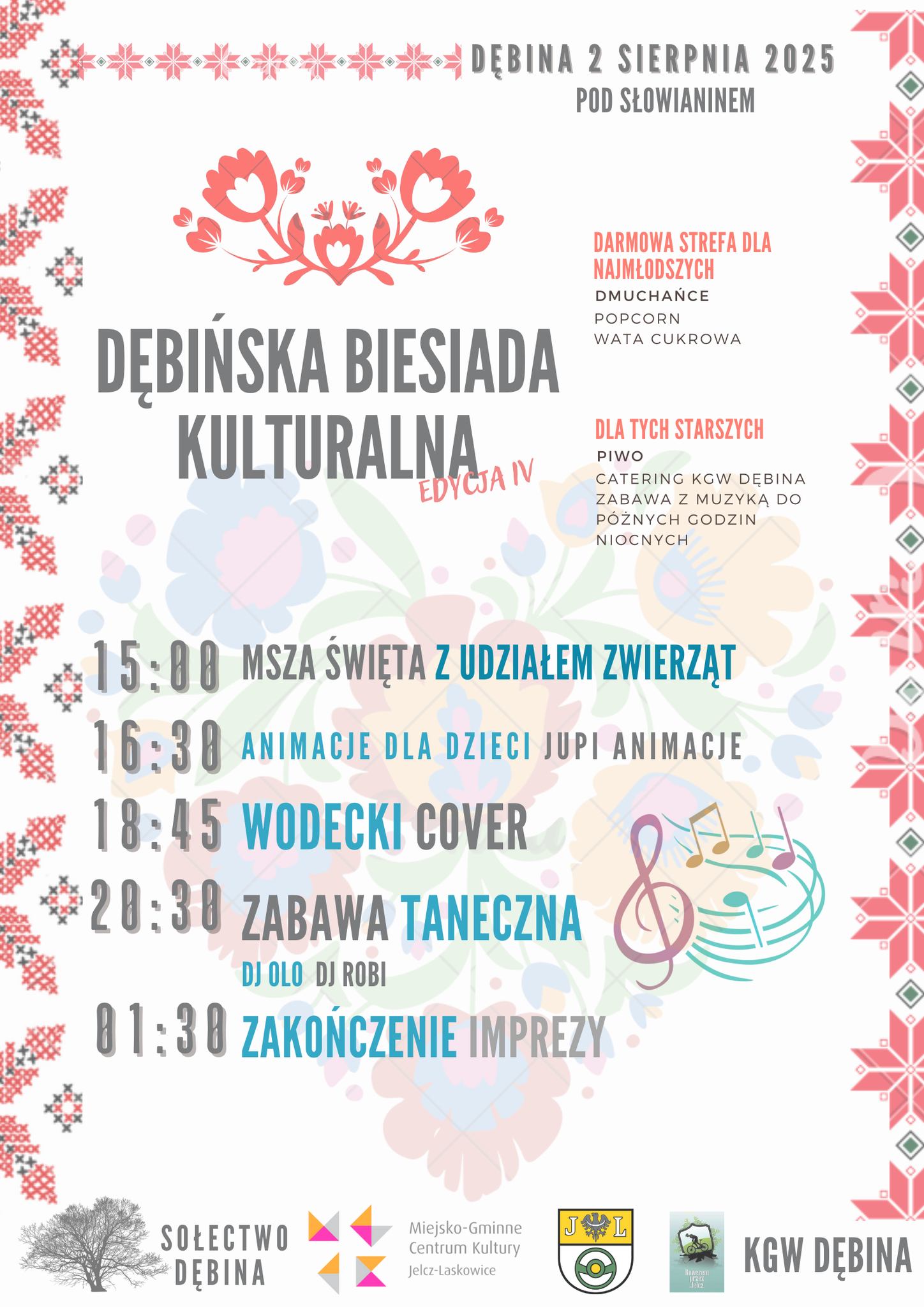 Organizatorzy z sołectwa Dębina informują: - Z nieukrywaną radością informujemy, że zbliża się coroczne święto naszej miejscowości. W sobotę 2 sierpnia zapraszamy na IV edycję Dębińskiej Biesiady Kulturalnej. Na miejscu bezpłatna strefa dla dzieci oraz lokalne dania i przekąski przygotowane przez KGW Dębina. Rozpoczynamy o godzinie 15:00 coroczną mszą świętą z Udziałem zwierząt, kończymy zabawą taneczną w późnych godzinach nocnych. Serdecznie zapraszamy zarówno mieszkańców jak i wszystkich, którzy chcieliby spędzić z nami te długo wyczekiwane, wakacyjne chwile. Do zobaczenia pod "Słowianinem".