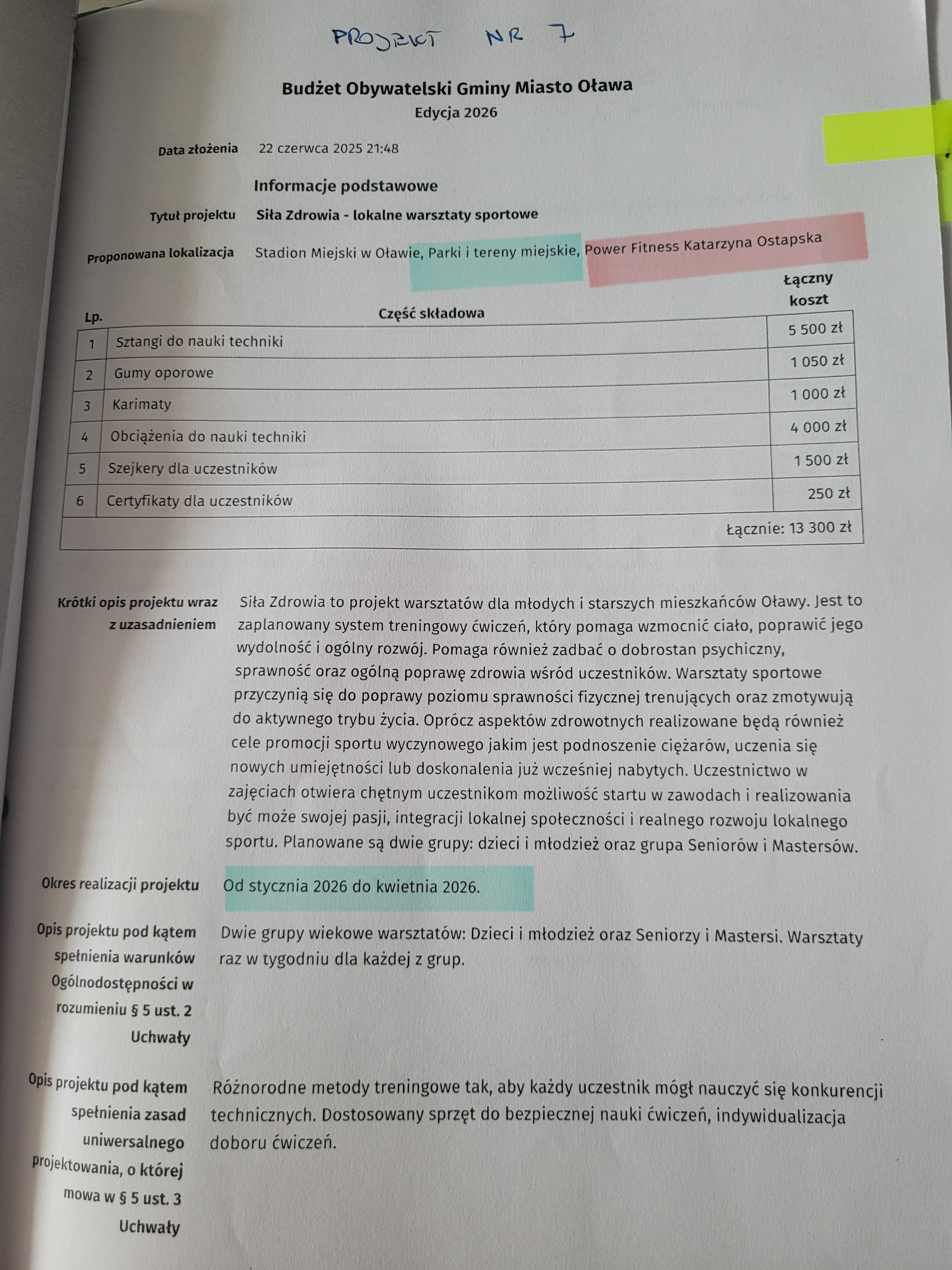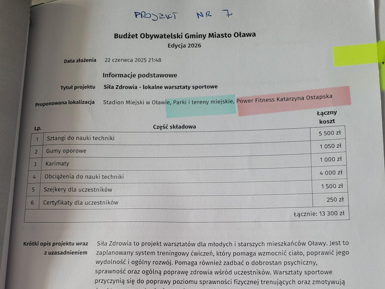 Pani Katarzyna stwierdziła również, że nie zgłaszałem żadnych zastrzeżeń do jej projektu. Niestety, w tym miejscu mija się z prawdą. Moje zastrzeżenia dotyczyły m.in. lokalizacji i zakresu projektu. Przykładowo, jako miejsce realizacji projektu wpisano m.in. "Stadion Miejski w Oławie, Parki i tereny miejskie, Power Fitness Katarzyna Ostapska". Zwraca uwagę również termin realizacji projektu – styczeń-kwiecień 2026 r. Biorąc pod uwagę warunki pogodowe w tym okresie, planowane ćwiczenia ze sztangą w parkach miejskich lub na stadionie wydają się być pomysłem, który z pewnością wymagałby od uczestników ogromnej determinacji i ciepłej herbaty, którą z chęcią zorganizuję, o ile jacyś chętni się wówczas znajdą.