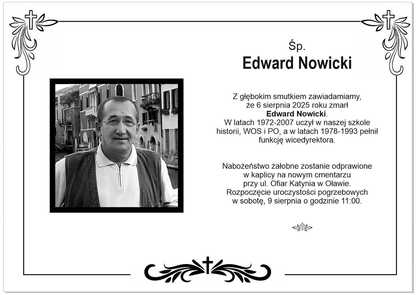 Nabożeństwo żałobne odprawione zostanie 9 sierpnia 2025 o godz.11.00 w kaplicy na tzw. nowym cmentarzu przy ul. Ofiar Katynia w Oławie. Po nabożeństwie nastąpi wyprowadzenie Zmarłego na miejsce wiecznego spoczynku.