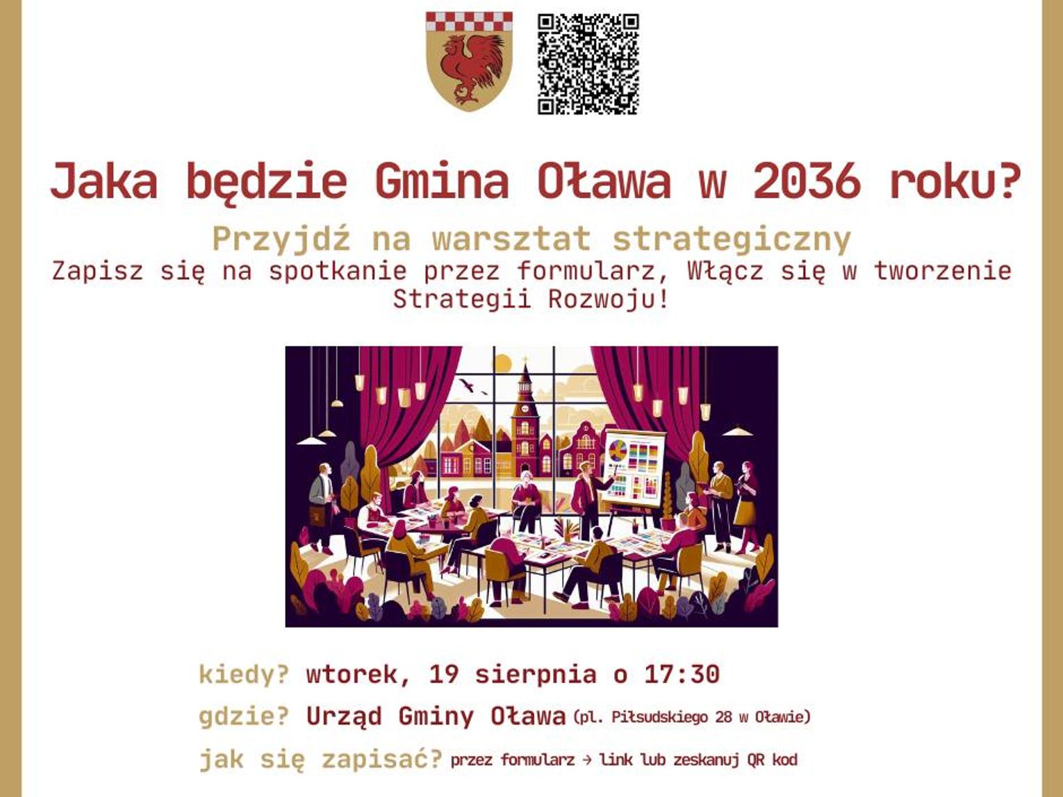 We wtorek, 19 sierpnia 2025 roku, w godzinach 17:30–19:30, w sali obrad Urzędu Gminy przy pl. Piłsudskiego 28 w Oławie odbędą się warsztaty strategiczne. Podczas spotkania uczestnicy będą mogli porozmawiać o potencjale i problemach gminy, a także wspólnie zastanowić się nad najlepszymi kierunkami jej rozwoju w perspektywie najbliższych kilkunastu lat. To okazja, aby wpłynąć na ustalenie priorytetów i działań, które zostaną uwzględnione w strategii.