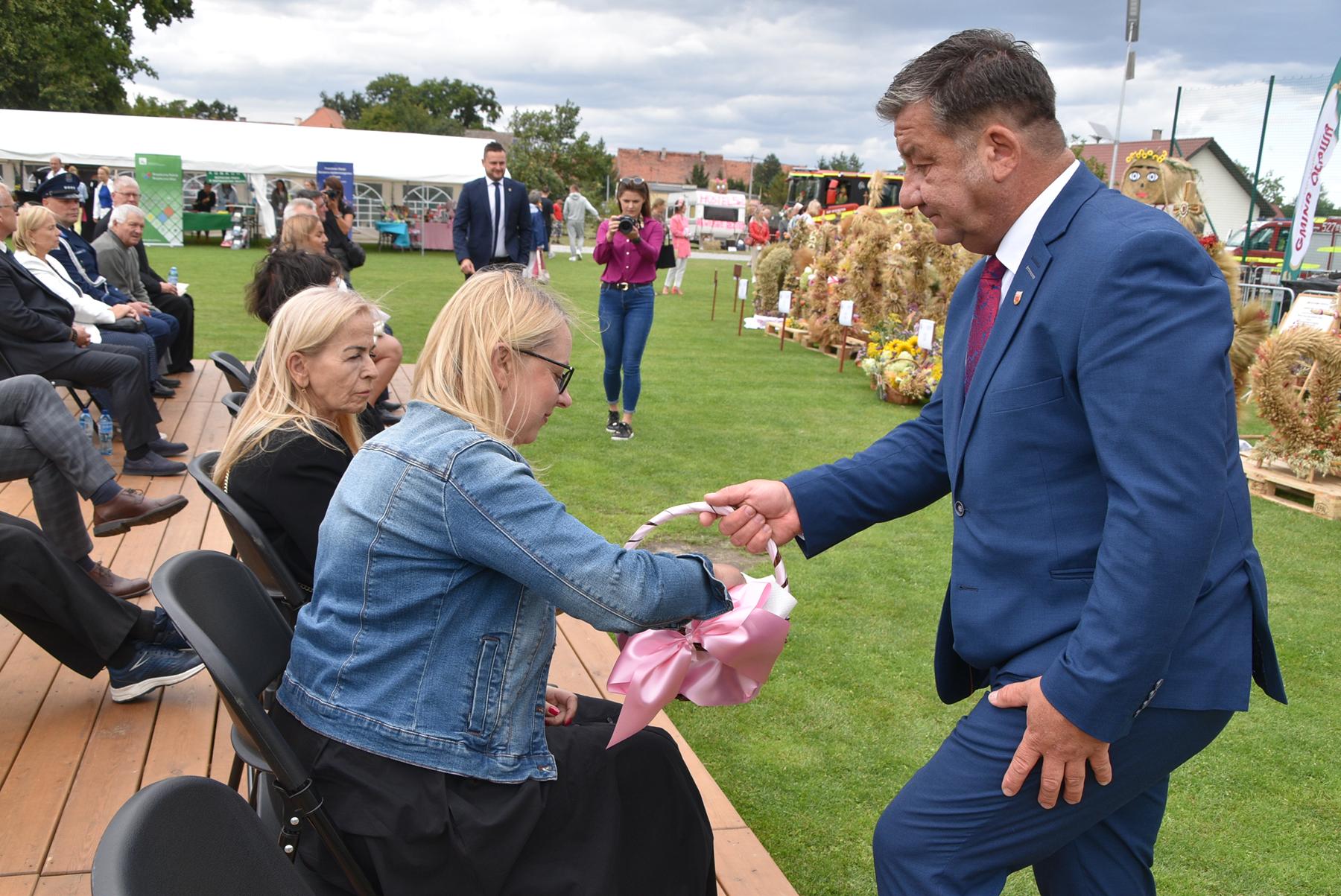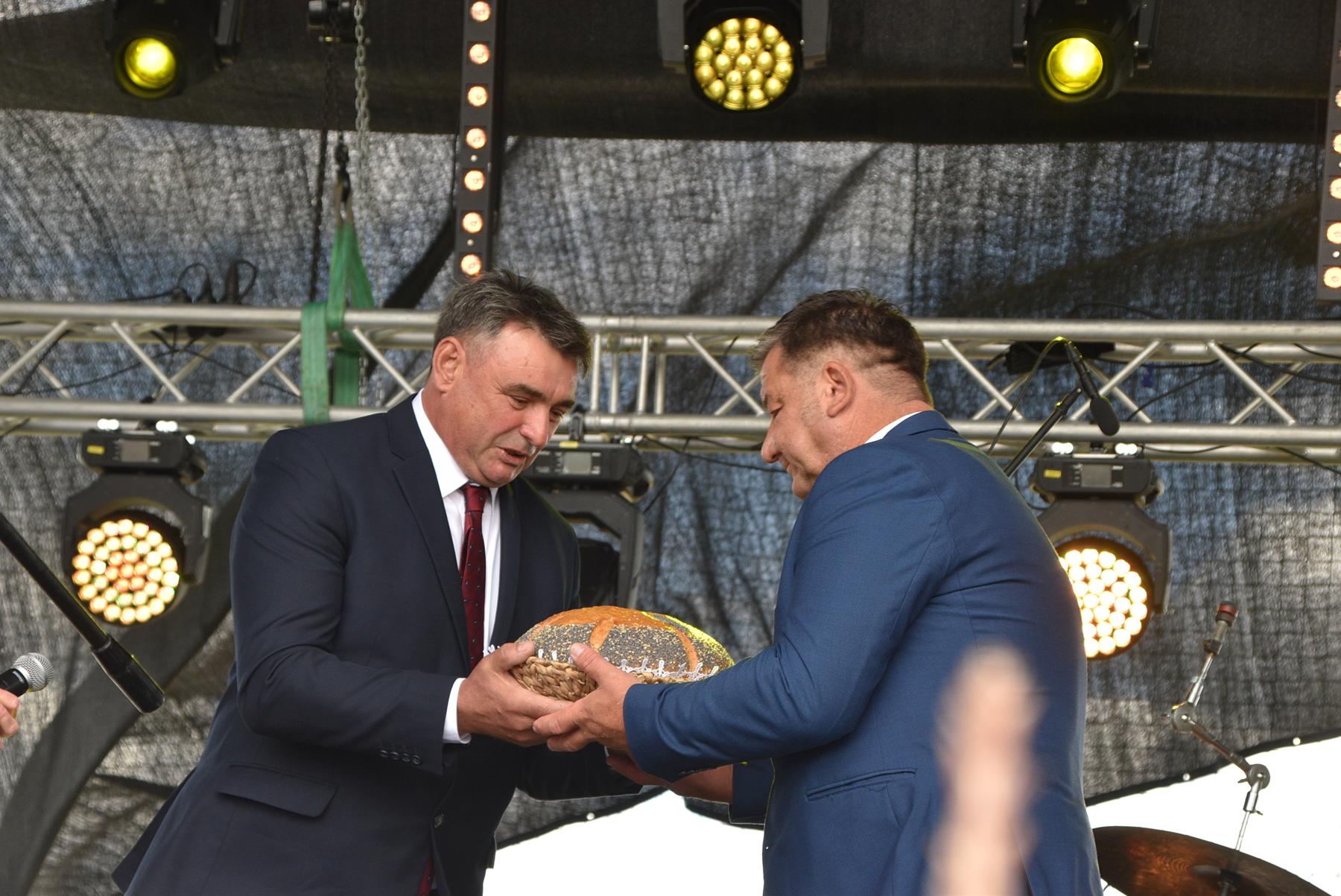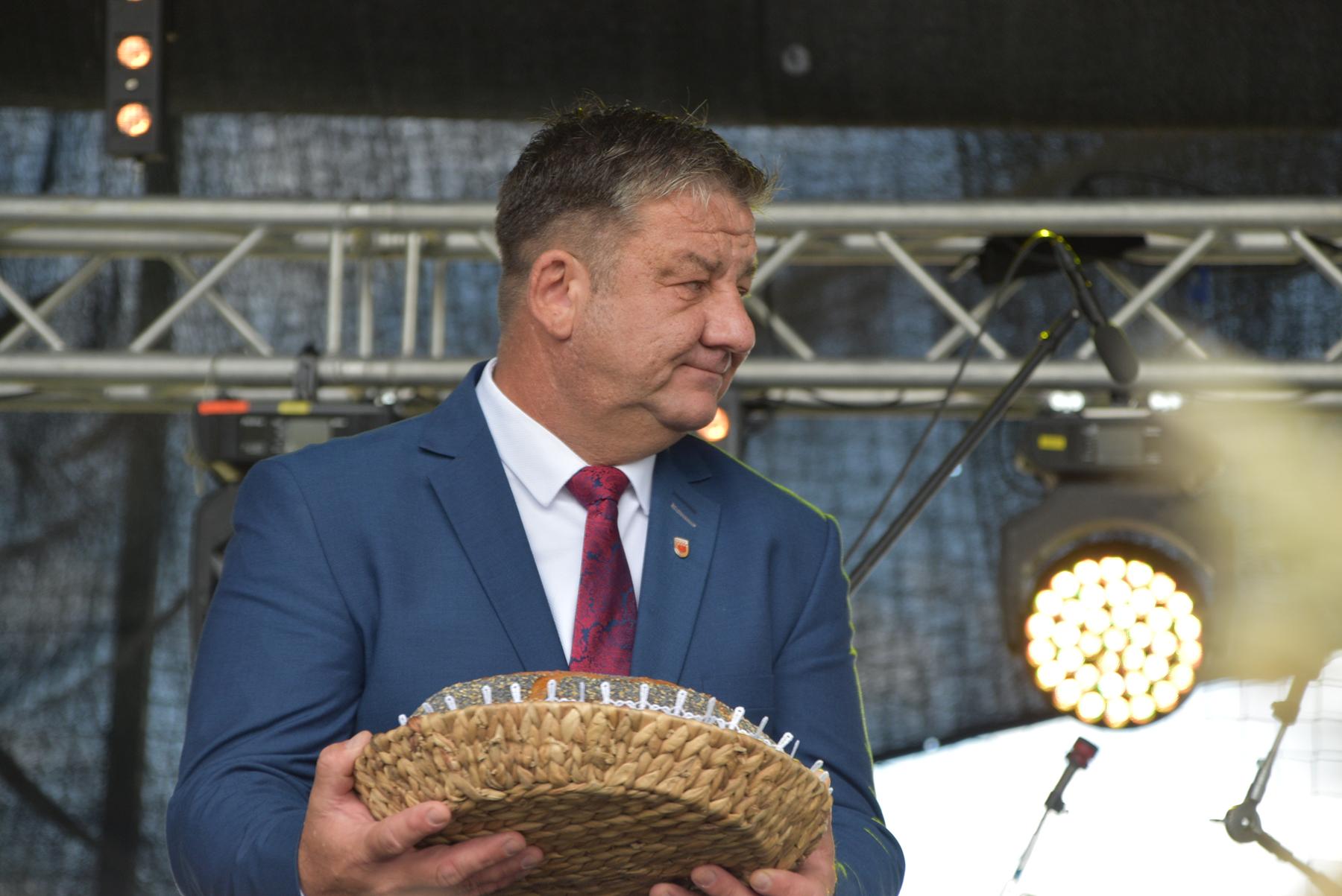 I dalej: - Święto plonów to czas jednocześnie wdzięczności i modlitwy, ale także refleksji nad znaczeniem ciężkiej pracy rolników, podczas żniw, jak i podczas całego roku. To radość i odpoczynek po pracy. Witam wszystkich przybyłych mieszkańców gminy Oława, a w szczególności rolników, sadowników, ogrodników i pszczelarzy. Witam zaproszonych gości. (...) Dzisiejszy dzień to okazja do szczerych podziękowań gospodarzom za ogrom ich codziennej pracy, i Bogu za pomoc w uzyskaniu jej owoców. Wszyscy korzystamy z owoców pracy na roli. Począwszy od ziaren, a skończywszy na chlebie, który spożywa każda rodzina. Dziś pełen refleksji nad wartością chleba, upatrując w nim symbolu urodzaju, ale też jedności i szacunku, chciałbym, aby ten bochen, którym się podzielimy, łączył nas, mieszkańców gminy w jedno. Przed chwilą otrzymałem z rąk starostów dożynek pani Aleksandry Łakomiak i pana Krzysztofa Pikora pachnący bochen chleba, upieczony z tegorocznego ziarna, które wzrastało i dojrzewało na ziemi Gminy Oława. Dziękuję za ten wymowny dar. Pragnę w imieniu swoim, Rady Gminy Oława, sołtysów oraz mieszkańców naszej gminy powiedzieć rolnikom DZIĘKUJĘ - za trud waszej ciężkiej pracy, za miłość do rolnictwa, którą przelewacie na każdą uprawianą ziemię i każdą hodowaną roślinę. Zachęcam wszystkich, abyśmy nie tylko dzisiaj, ale każdego dnia doceniali pracę naszych rolników, którzy są fundamentem naszej społeczności. Dożynki to także czas refleksji nad takimi wartościami jak solidarność, współdziałania i szacunek. Tak jak dziś dzielimy się tym bochnem dożynkowym, tak i przez cały rok pamiętajmy, aby dzielić się z tymi, którzy go potrzebują. Niech wspólnota chleba jednoczy nas także wokół wszystkich ważnych spraw. Bądźmy razem, solidarnie wspierajmy się w trudnych chwilach, nie dajmy się zwieść podziałom i nienawiści. Tak jak rolnik z szacunkiem uprawia ziemię, tak i my z szacunkiem pielęgnujmy relację z innymi ludźmi dla wspólnego dobra. (..,.)