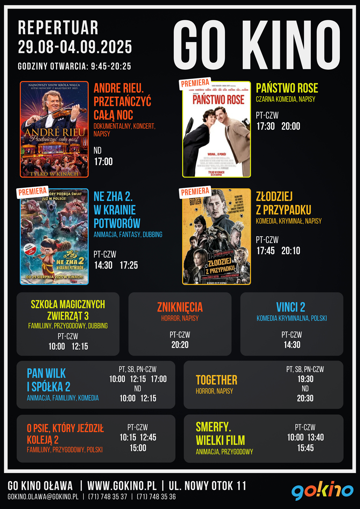 Repertuar od 29 sierpnia do 4 września 025 r. W tym tygodniu trzy premiery, a wśród nich czarna komedia pt. "Państwo Rose", reżyseria Jay Roach