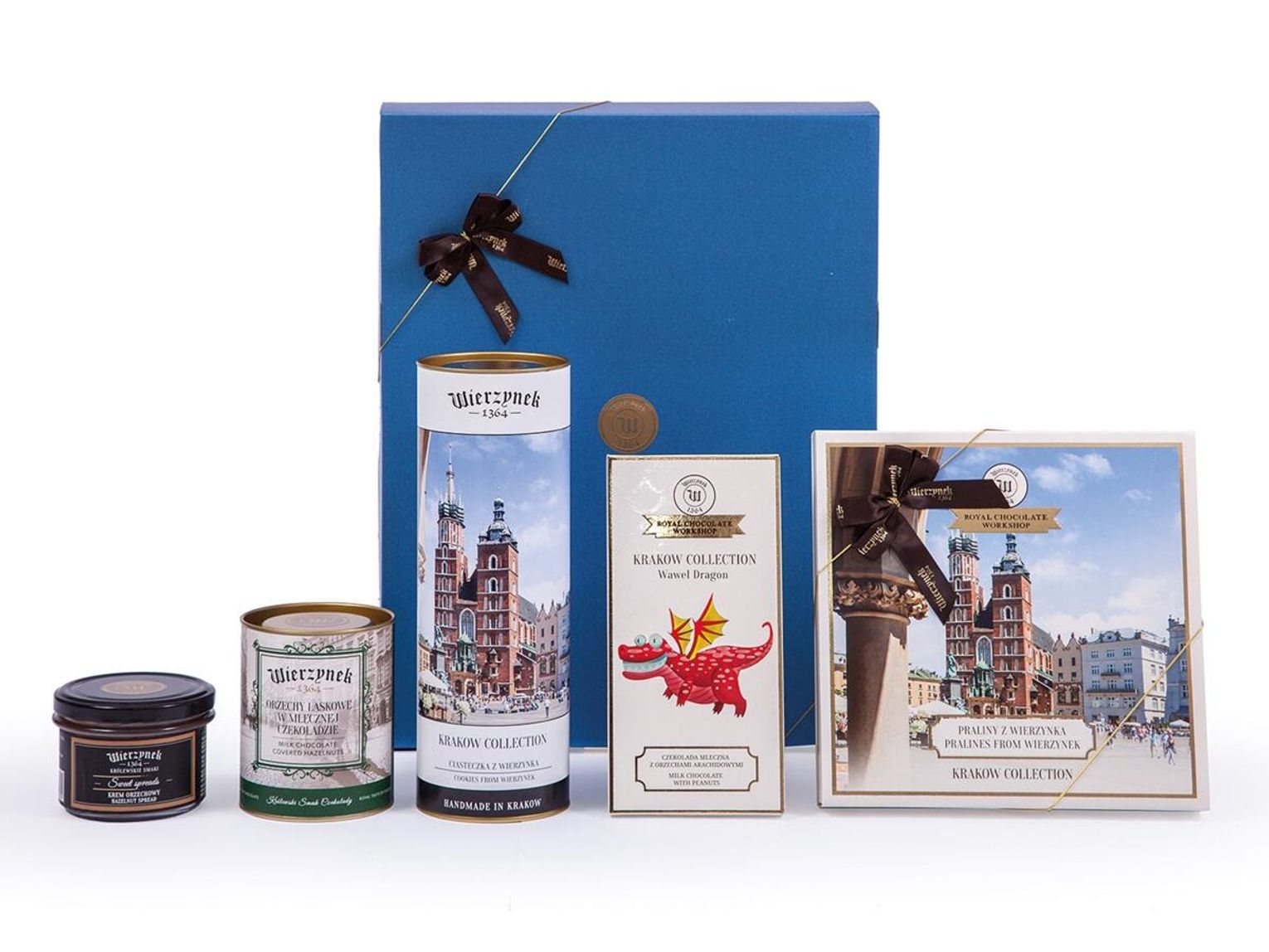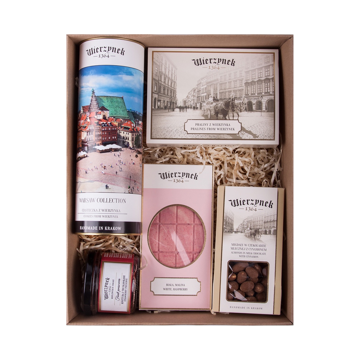 Zestaw upominkowy może być wypełniony różnymi produktami spożywczymi. Każdy element kompozycji jest starannie dobrany, aby całość prezentowała się w sposób spójny i harmonijny. W zestawie znajdują się wyselekcjonowane słodycze rzemieślnicze pochodzące z lokalnych manufaktur – np. tabliczka czekolady mlecznej, deserowej lub białej z orzechami, bakaliami czy owocami, praliny, ciastka, słodkie smarowidła czy tematyczne figurki z czekolady. Świetnym rozwiązaniem są także zestawy prezentowe zawierające produkty pochodzące z konkretnej kuchni świata – np. Włoch. W takiej kompozycji może znaleźć się dobrej jakości makaron, sos pomidorowy do makaronu, oliwa z oliwek extra virgin, suszone pomidory czy starannie dobrane zioła włoskie.