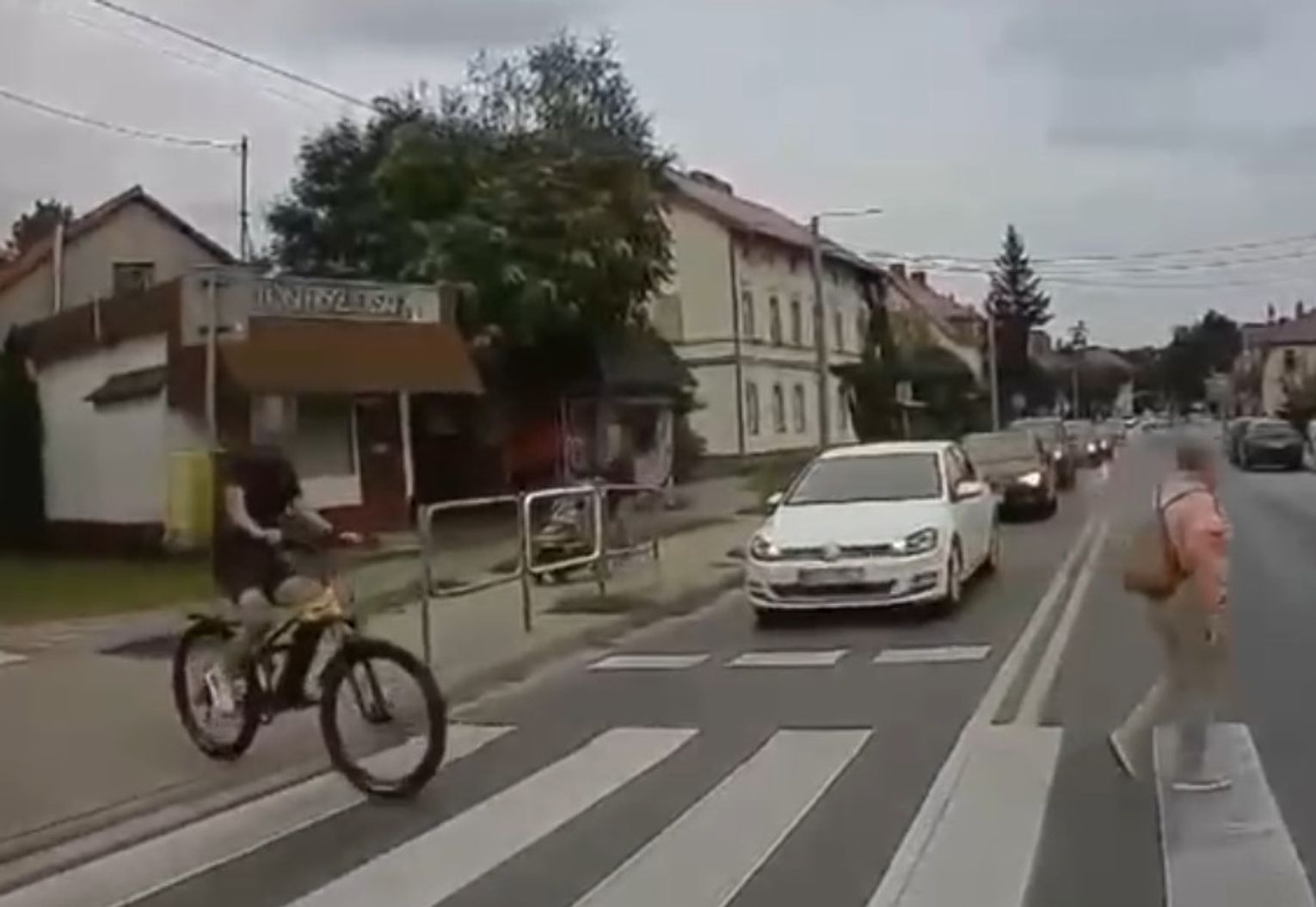 To wydarzyło się wczoraj na ulicy Strzelnej. Po jednej stronie jest tam ścieżka rowerowa, ale prowadzi prosto, tymczasem rowerzysta nagle zjechał w lewo na przejście dla pieszych, czym złamał prawo. Gdyby pojechał 20 metrów dalej prosto, miałby przy Galerii Oławskiej oznaczone przejście dla pieszych i rowerzystów, przez które można przejeżdża rowerem.