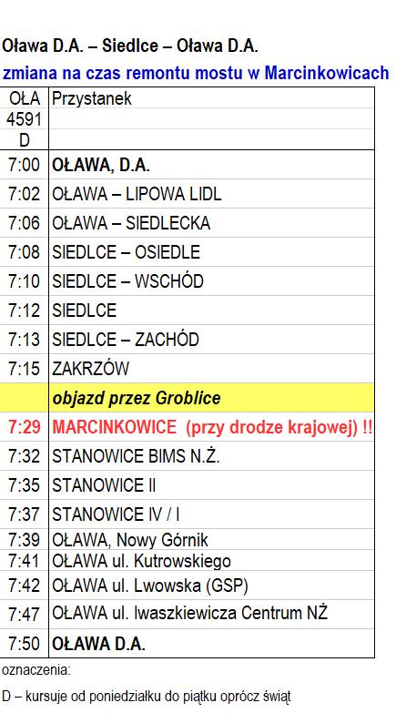 Z uwagi na dojazd uczniów do szkół, kurs o godz. 7:05 Oława – Siedlce – Zakrzów - Marcinkowice - Oława zostanie przyspieszony na godz. 7:00.