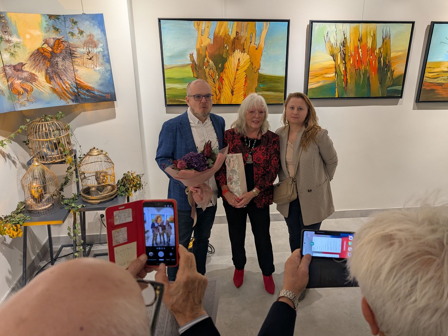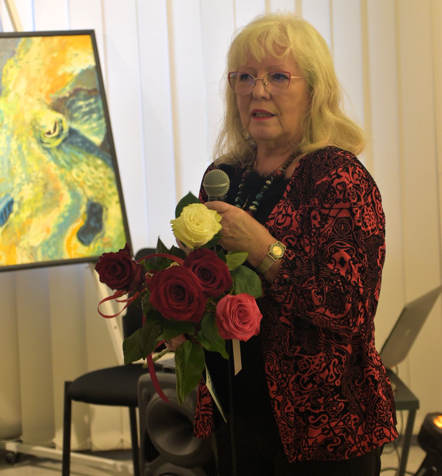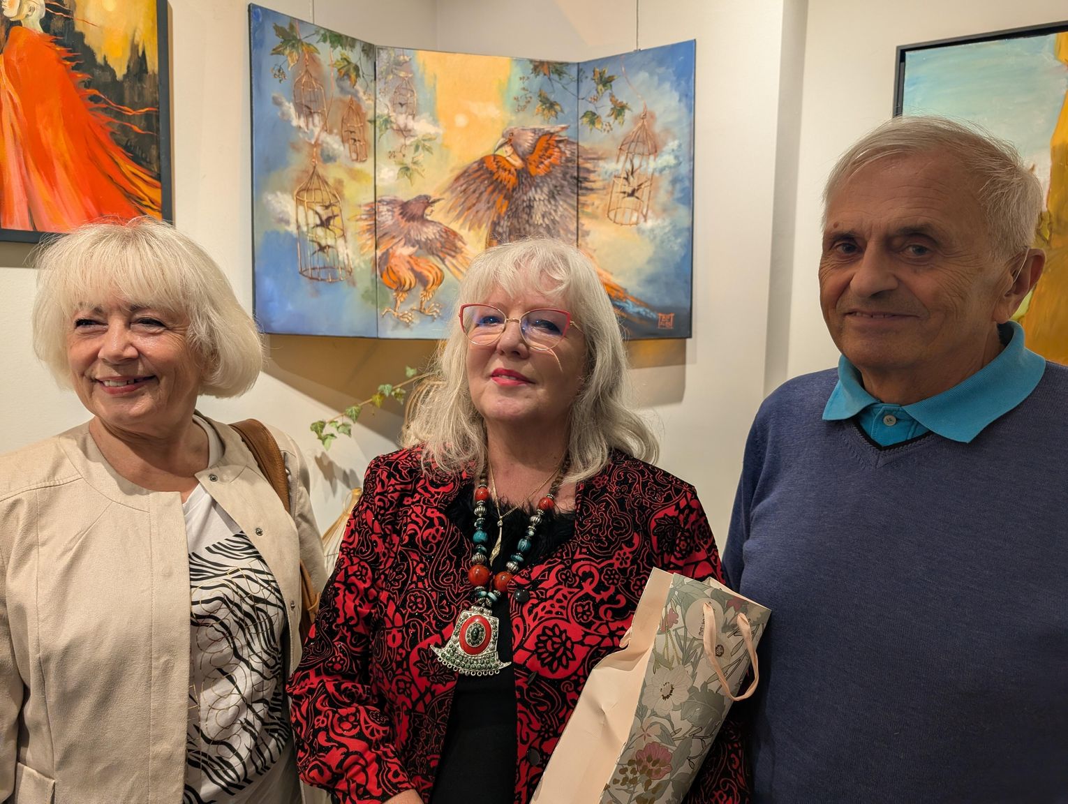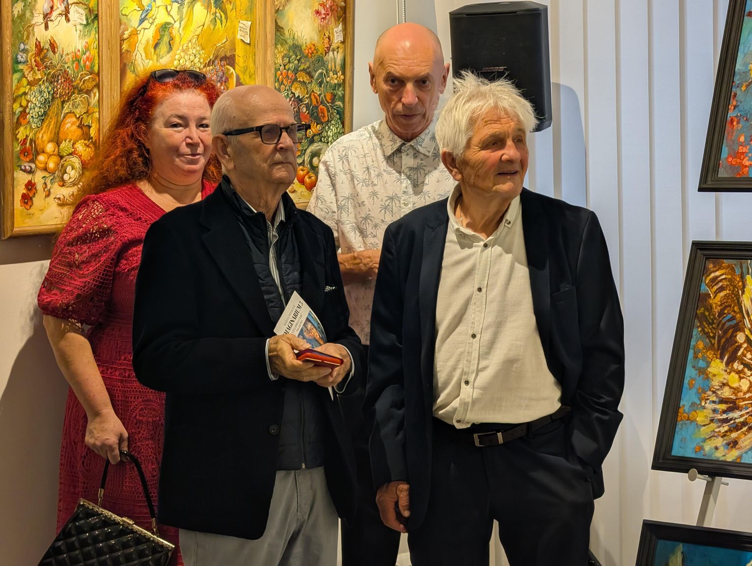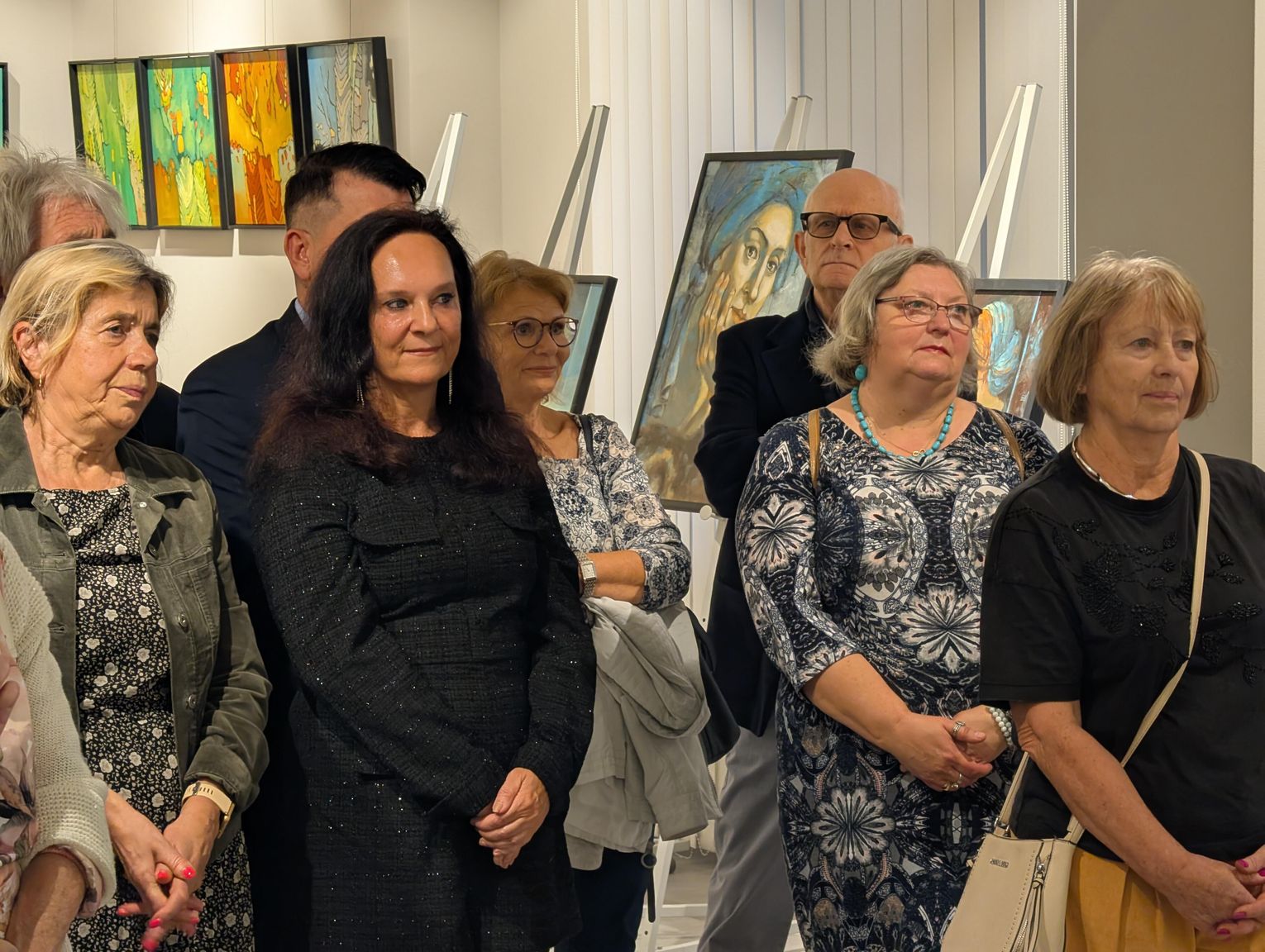 Pani Bożena mówiła, że maluje cyklami, a podstawowym tematem jest upływający czas. - Czas ima się nas wszystkich, ja odczuwam to szczególnie, bo sporo lat już za mną - powiedziała. - Za tydzień kończę osiemdziesiątkę, więc się bardzo cieszę z tego, że mogę przez cały tydzień obchodzić z Wami swój jubileusz. Dziękuję Wam za obecność.