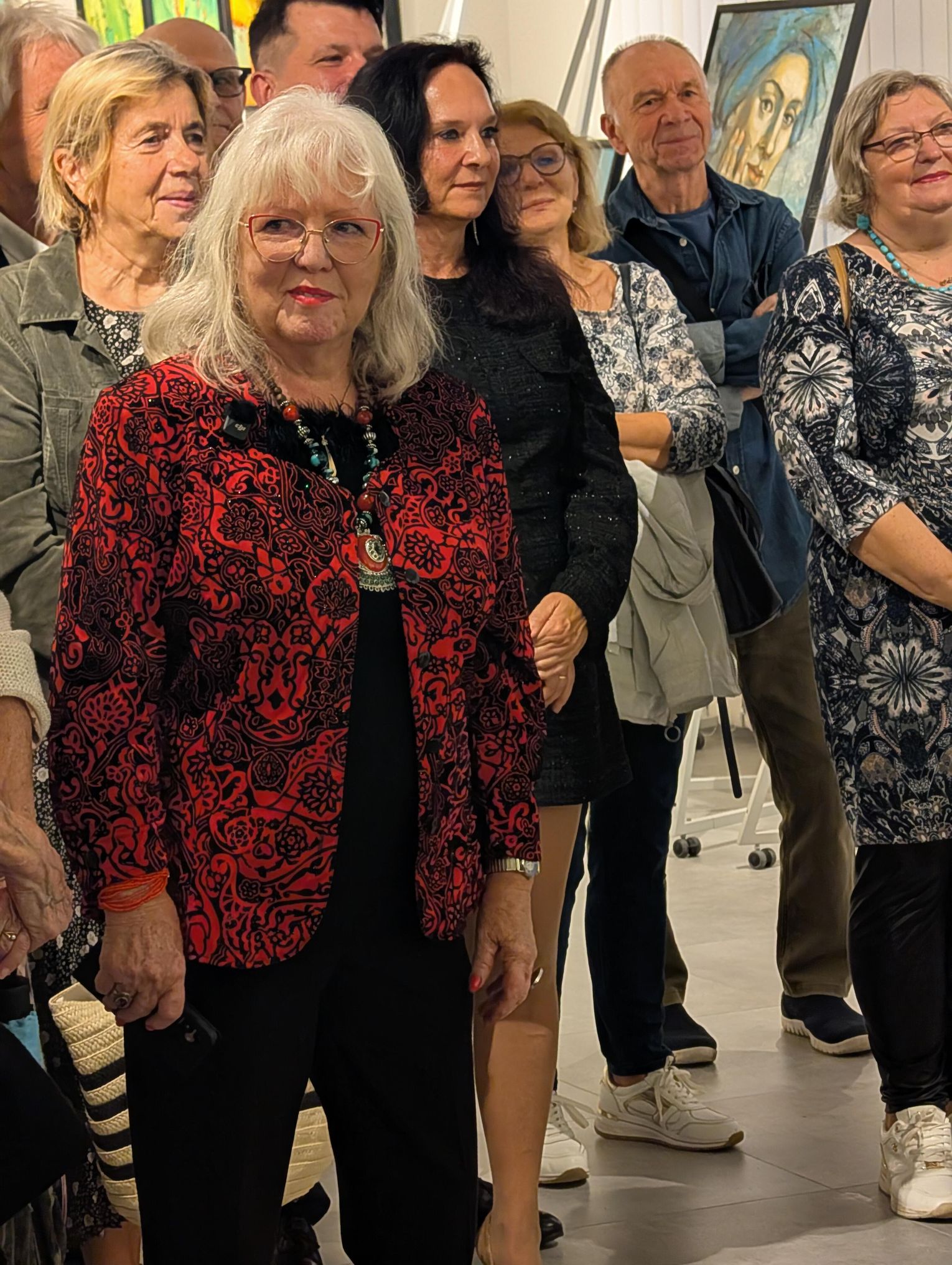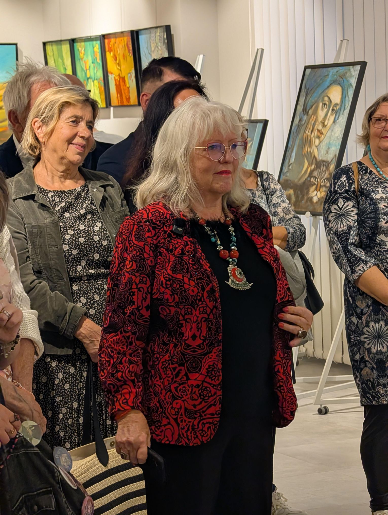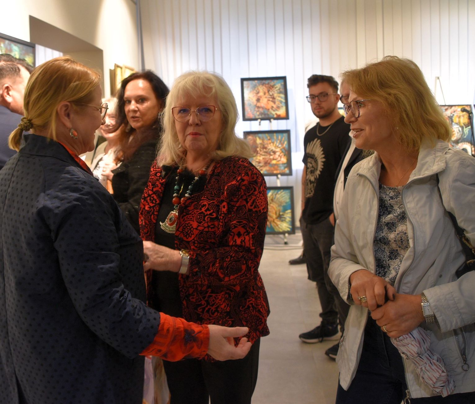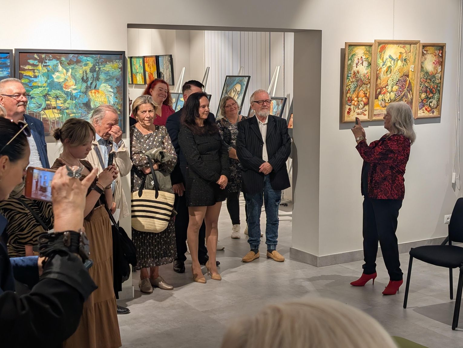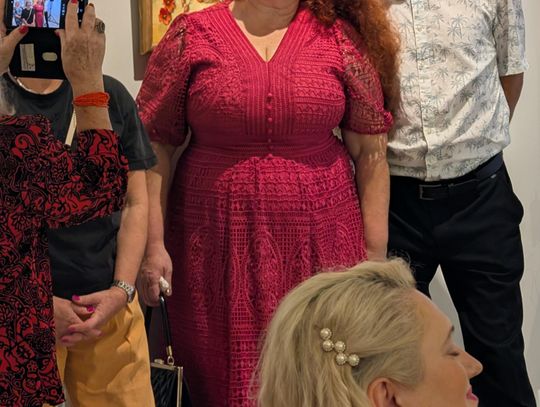 Pani Bożena mówiła, że maluje cyklami, a podstawowym tematem jest upływający czas. - Czas ima się nas wszystkich, ja odczuwam to szczególnie, bo sporo lat już za mną - powiedziała. - Za tydzień kończę osiemdziesiątkę, więc się bardzo cieszę z tego, że mogę przez cały tydzień obchodzić z Wami swój jubileusz. Dziękuję Wam za obecność.