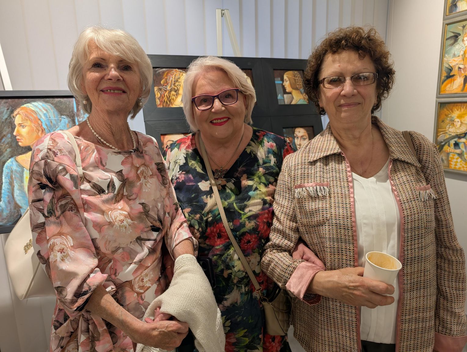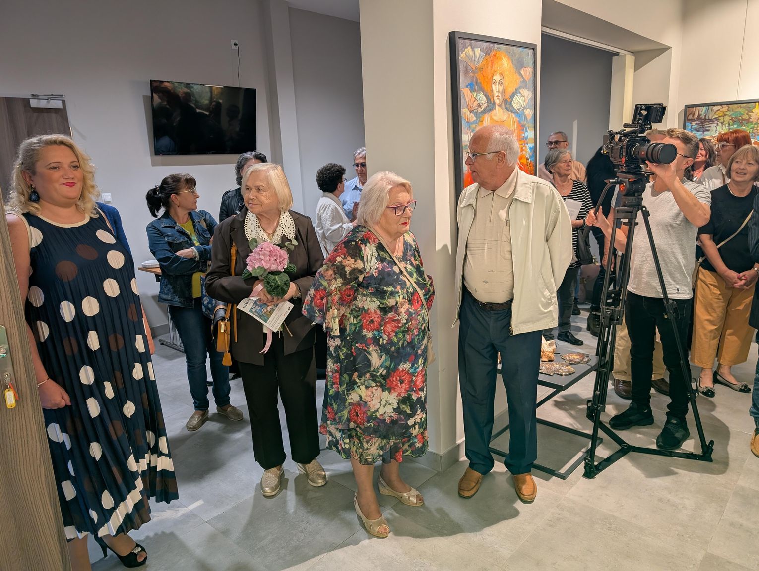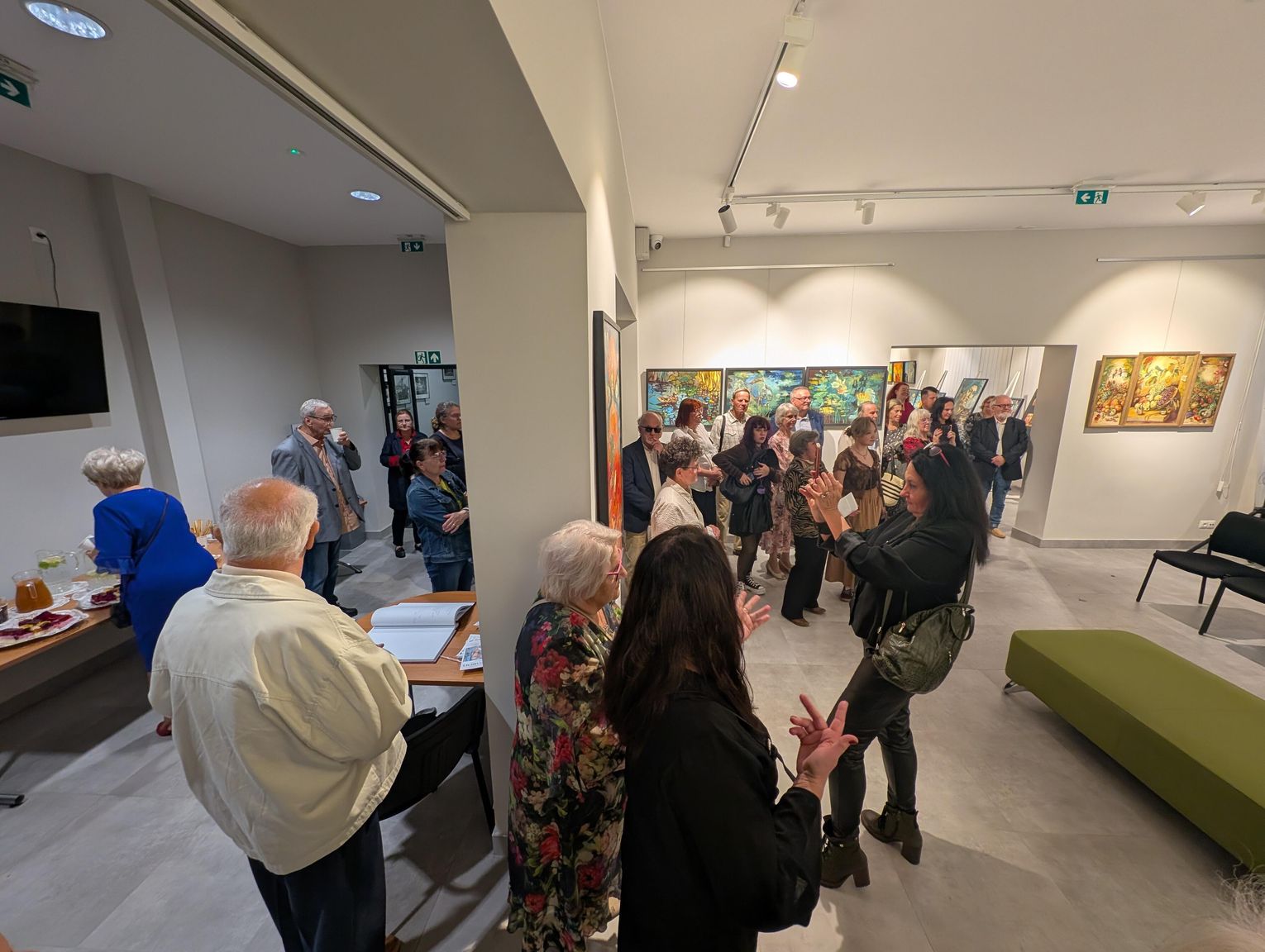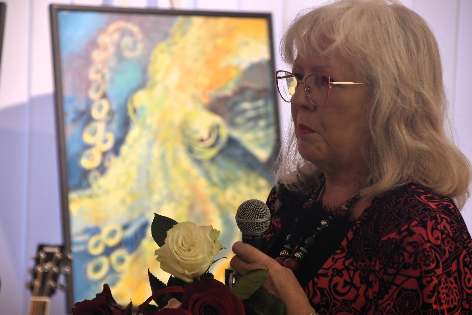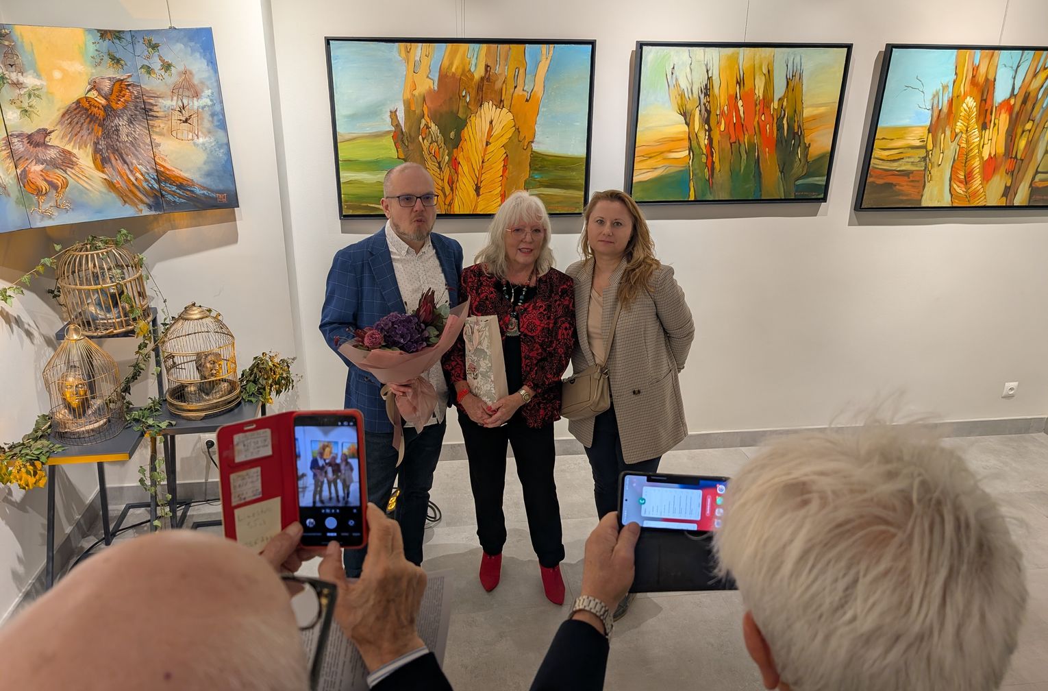 Pani Bożena mówiła, że maluje cyklami, a podstawowym tematem jest upływający czas. - Czas ima się nas wszystkich, ja odczuwam to szczególnie, bo sporo lat już za mną - powiedziała. - Za tydzień kończę osiemdziesiątkę, więc się bardzo cieszę z tego, że mogę przez cały tydzień obchodzić z Wami swój jubileusz. Dziękuję Wam za obecność.