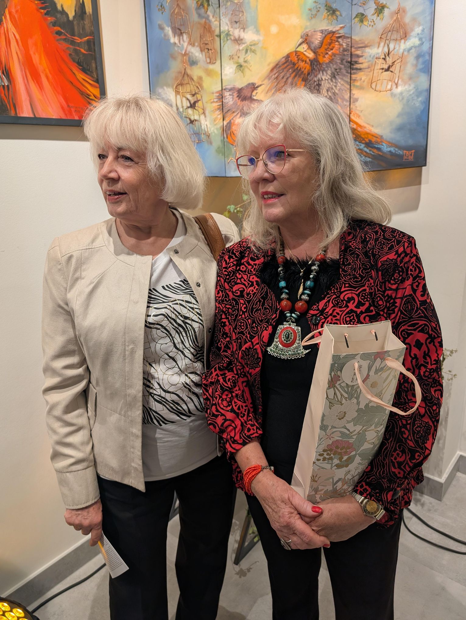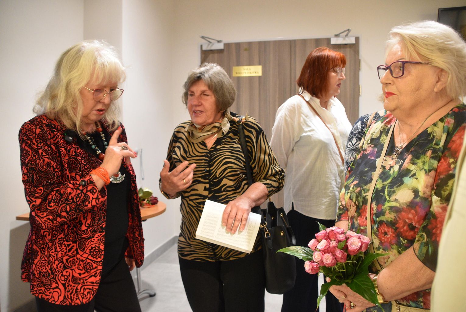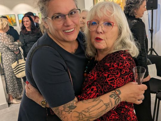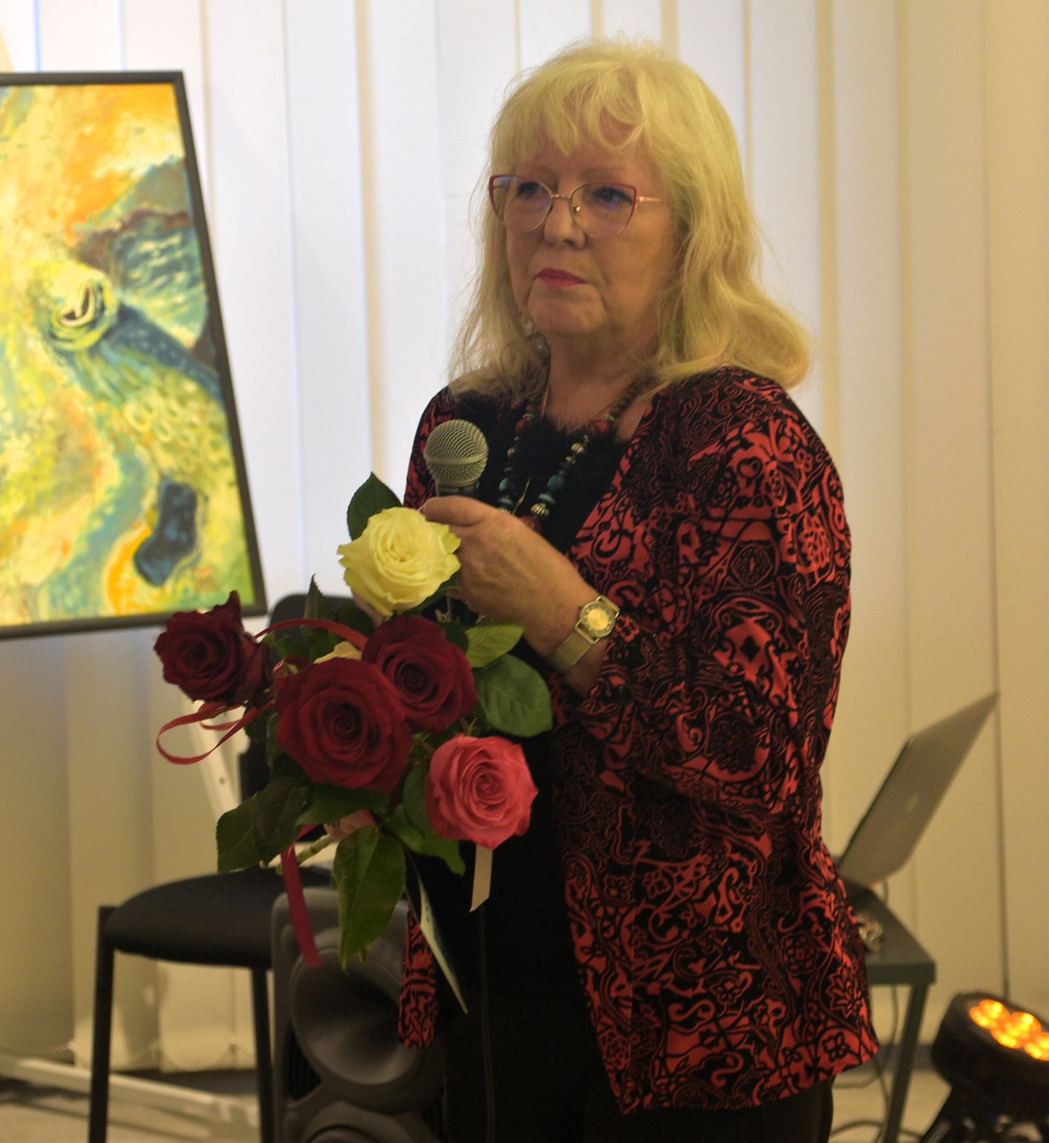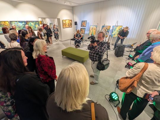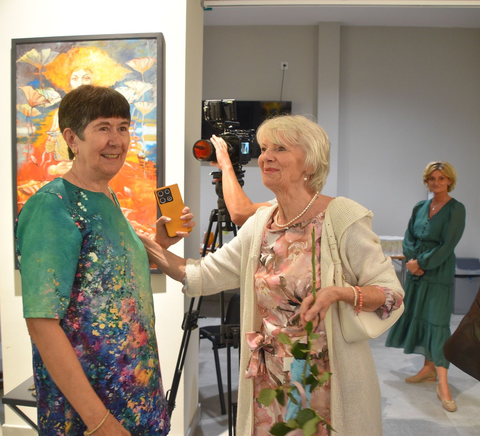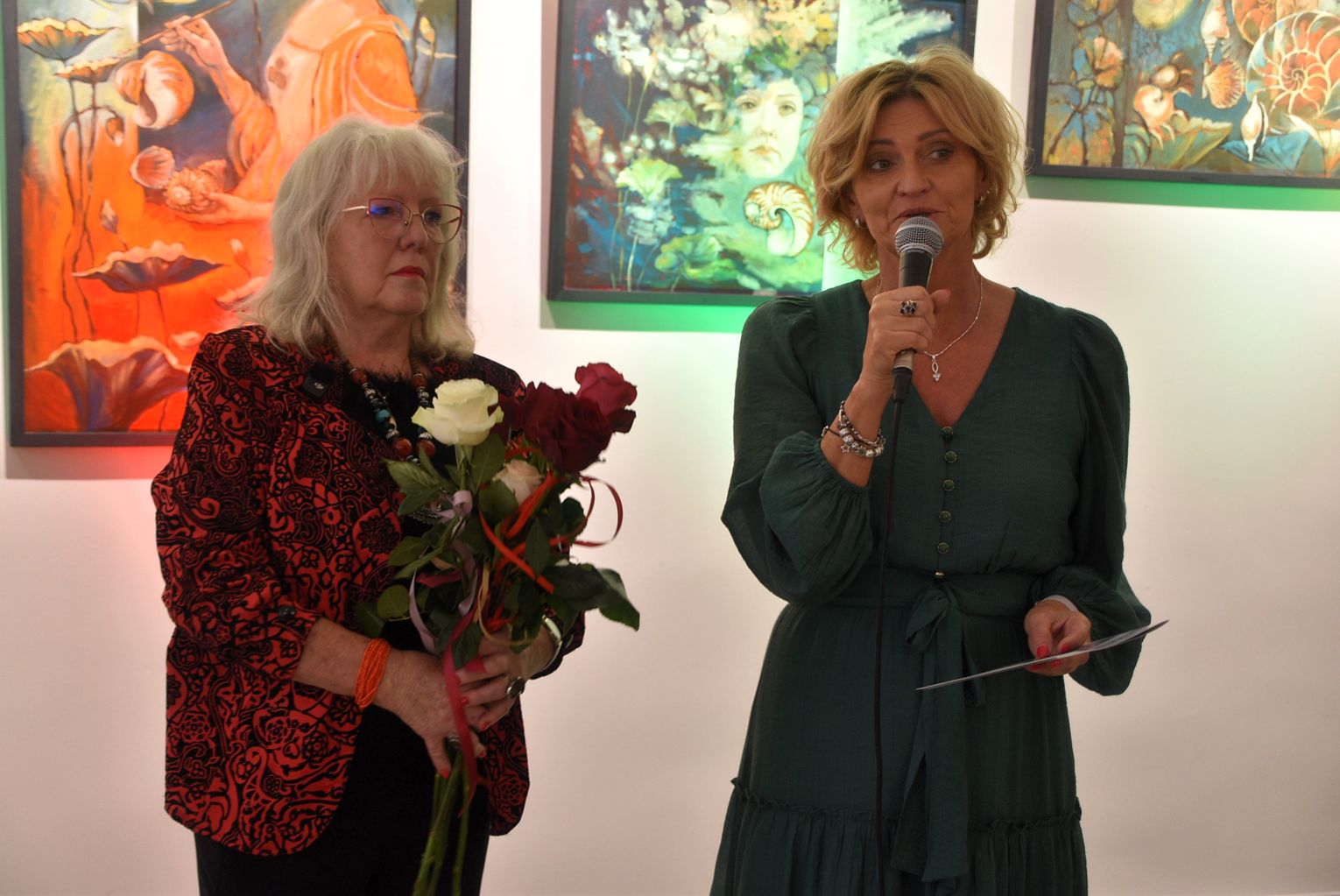 Pani Bożena mówiła, że maluje cyklami, a podstawowym tematem jest upływający czas. - Czas ima się nas wszystkich, ja odczuwam to szczególnie, bo sporo lat już za mną - powiedziała. - Za tydzień kończę osiemdziesiątkę, więc się bardzo cieszę z tego, że mogę przez cały tydzień obchodzić z Wami swój jubileusz. Dziękuję Wam za obecność.