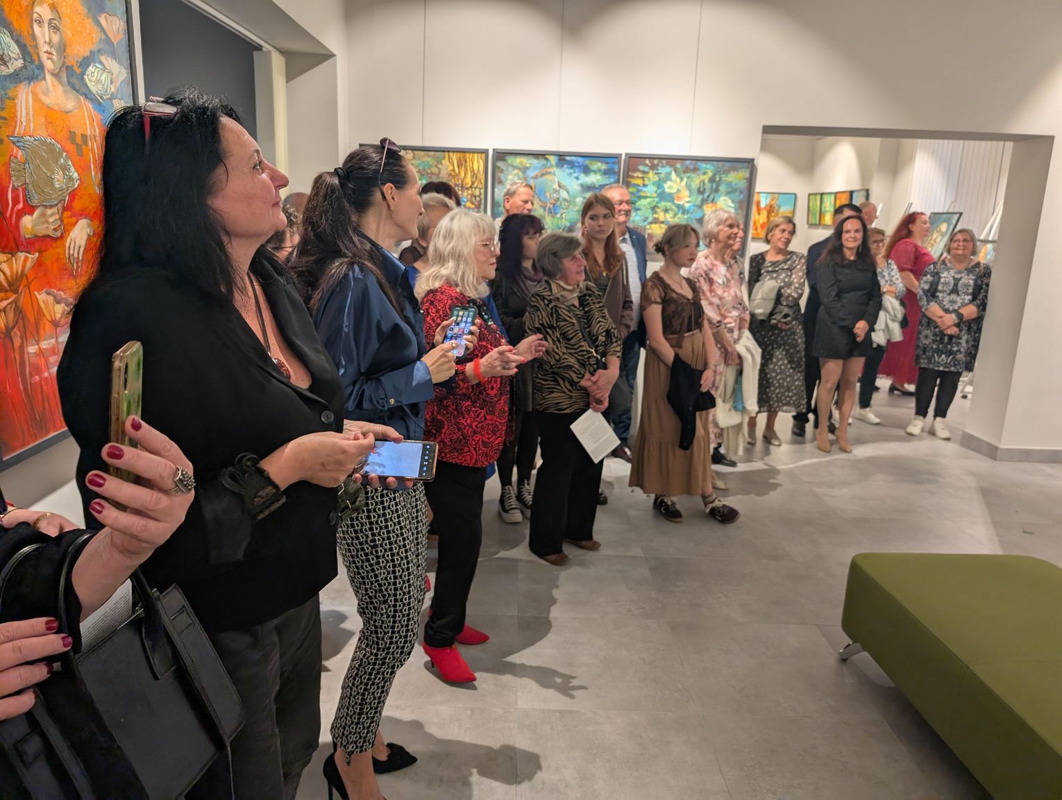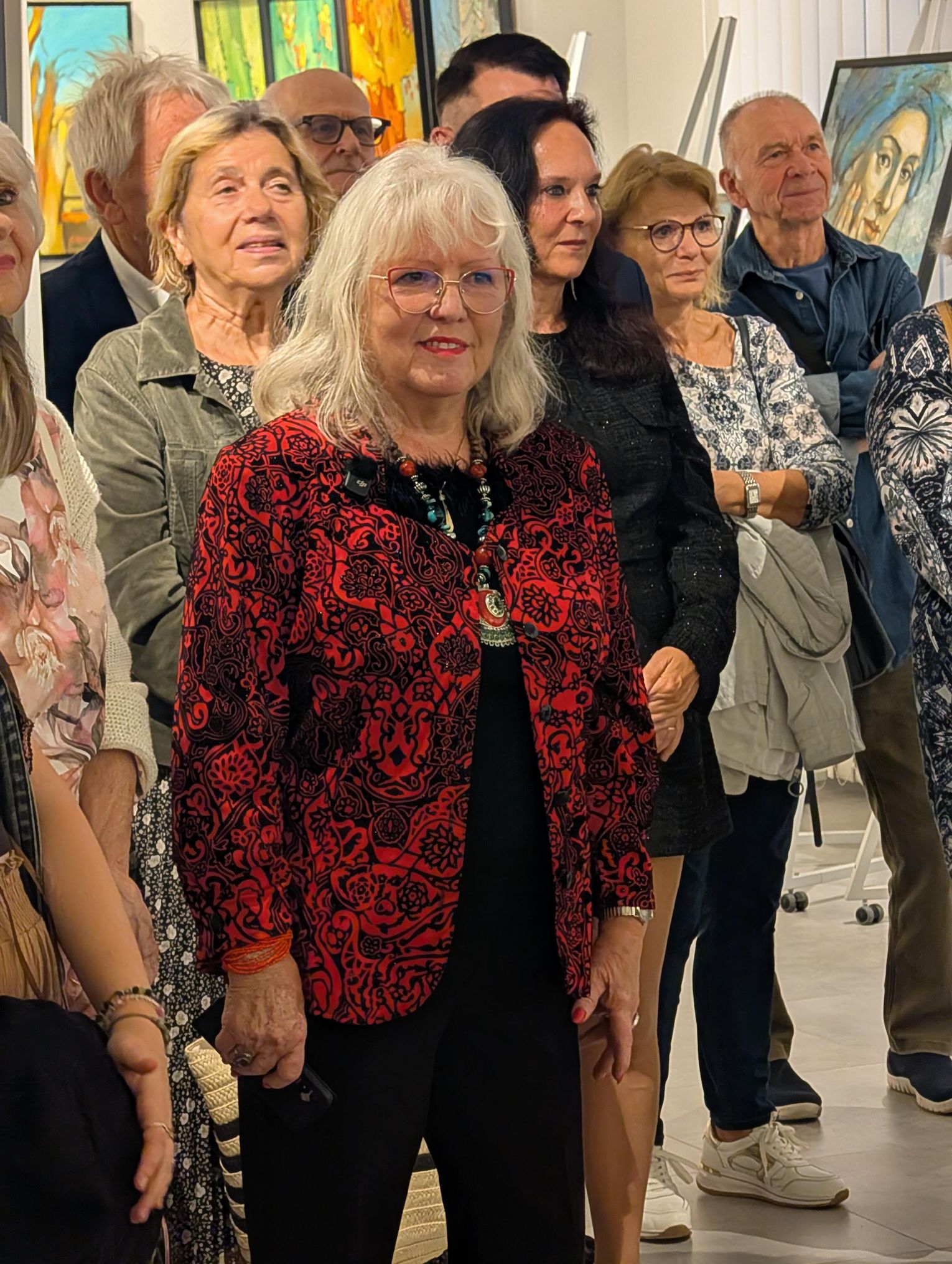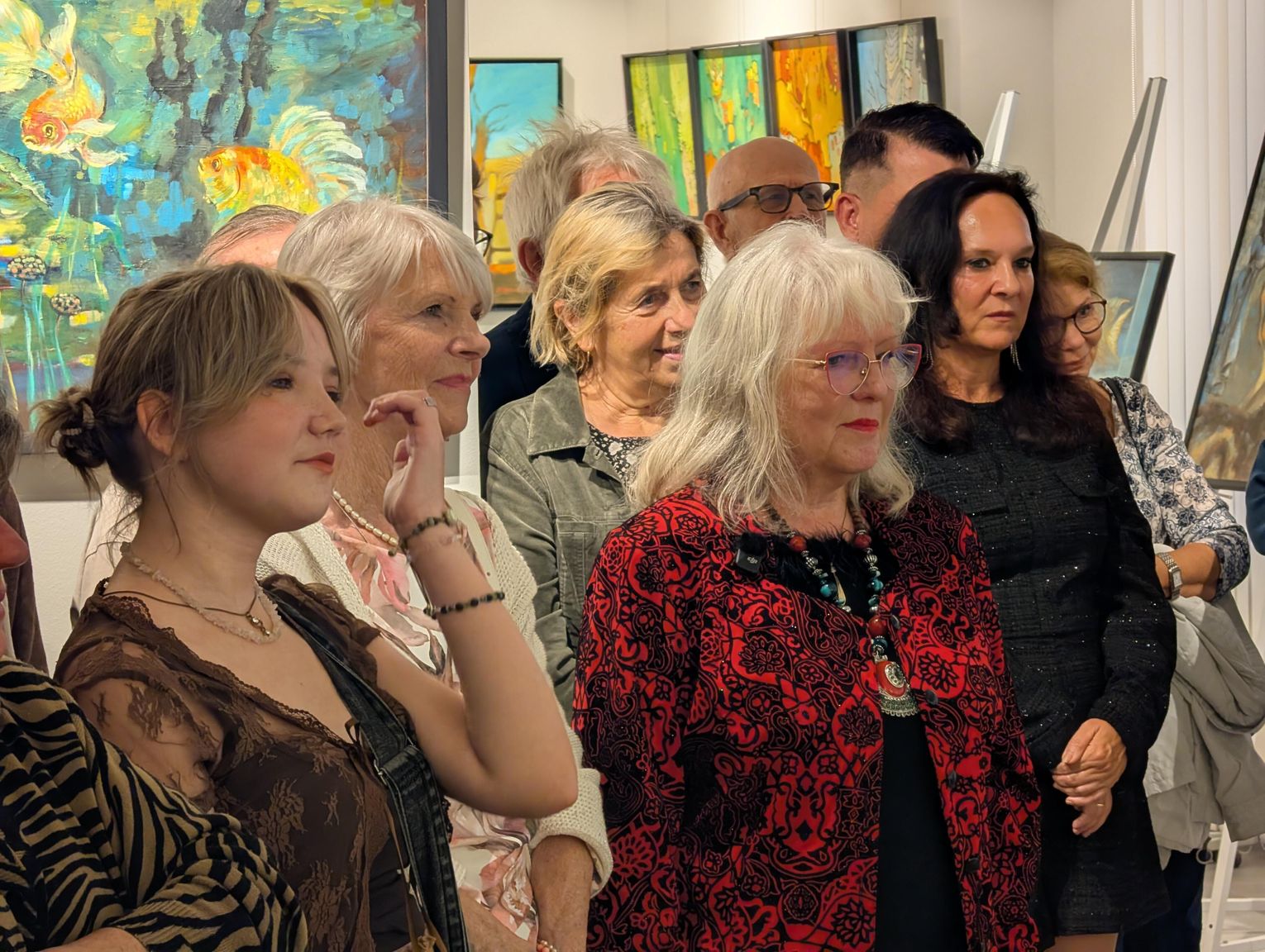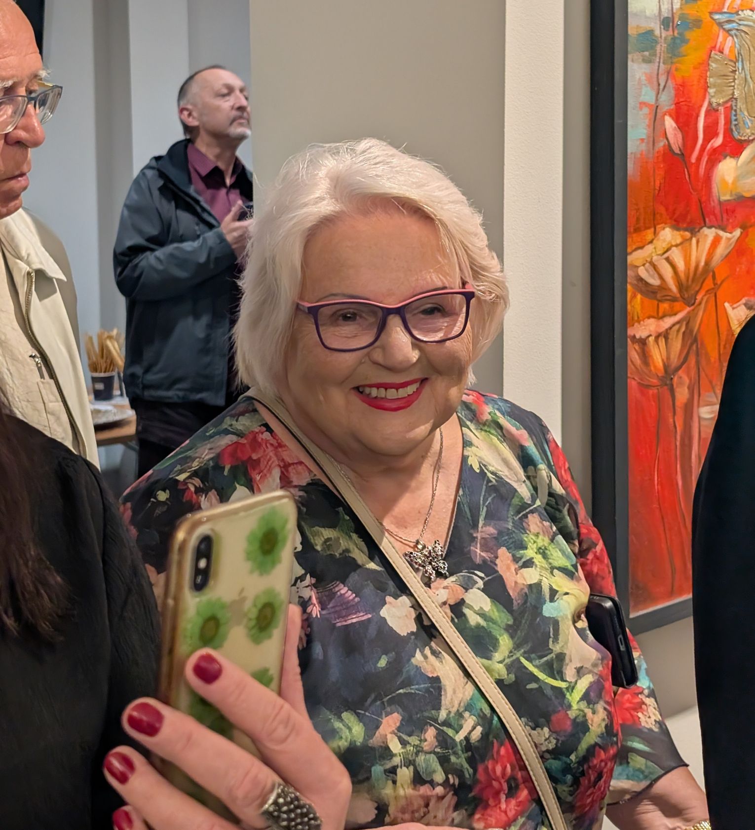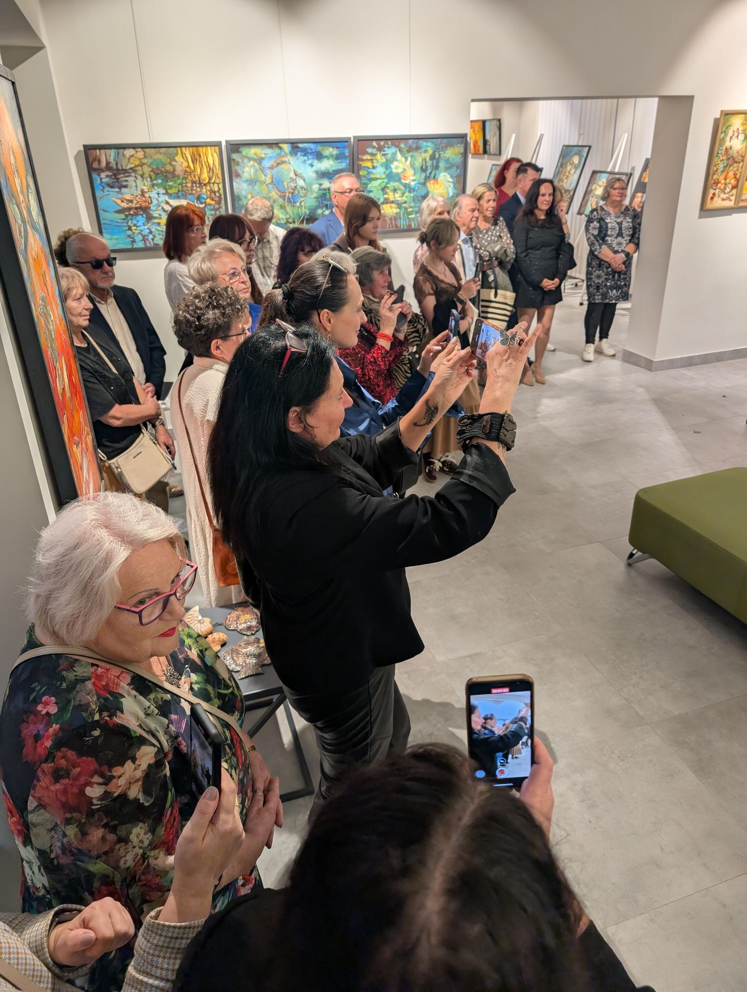 Pani Bożena mówiła, że maluje cyklami, a podstawowym tematem jest upływający czas. - Czas ima się nas wszystkich, ja odczuwam to szczególnie, bo sporo lat już za mną - powiedziała. - Za tydzień kończę osiemdziesiątkę, więc się bardzo cieszę z tego, że mogę przez cały tydzień obchodzić z Wami swój jubileusz. Dziękuję Wam za obecność.