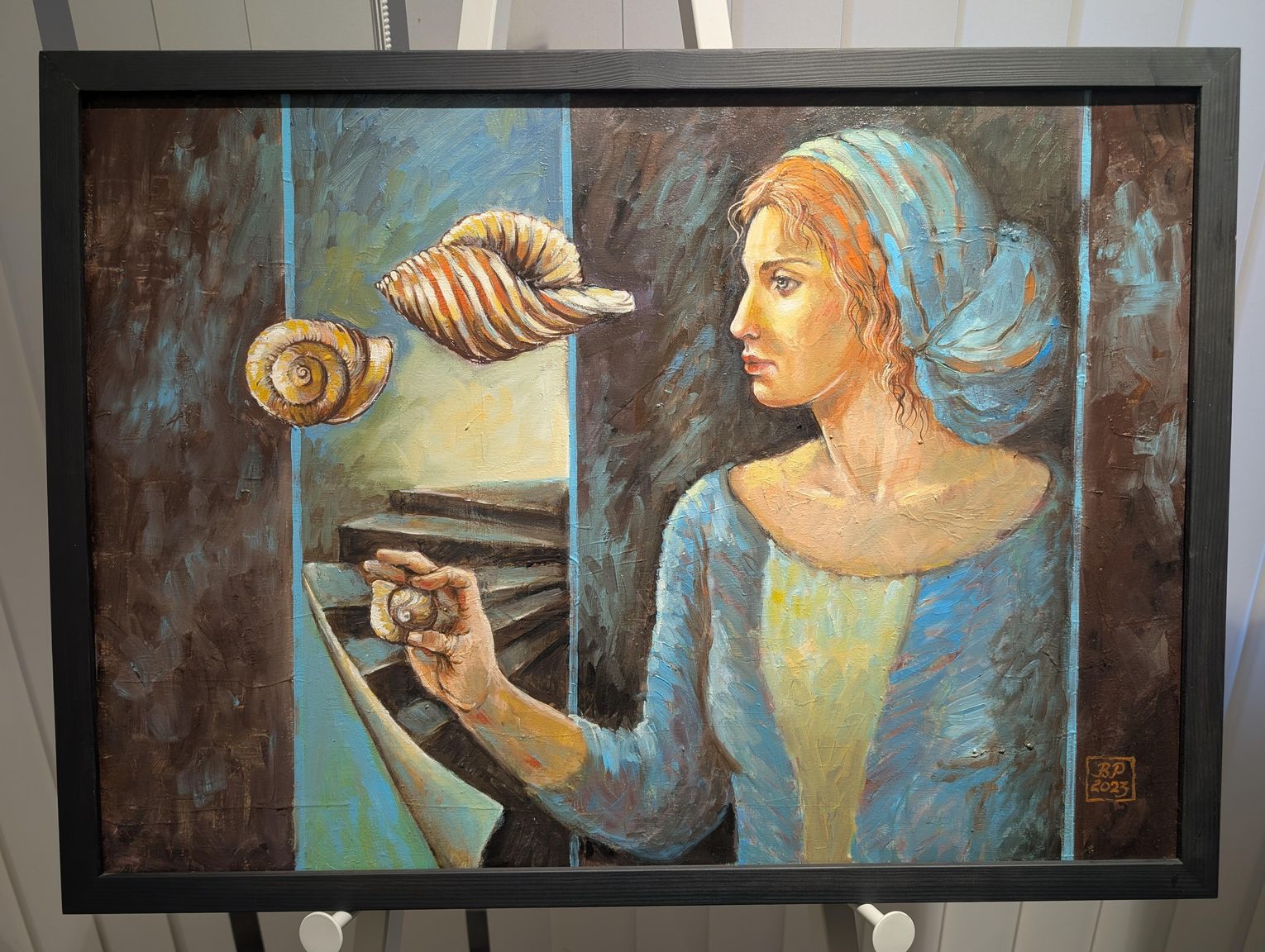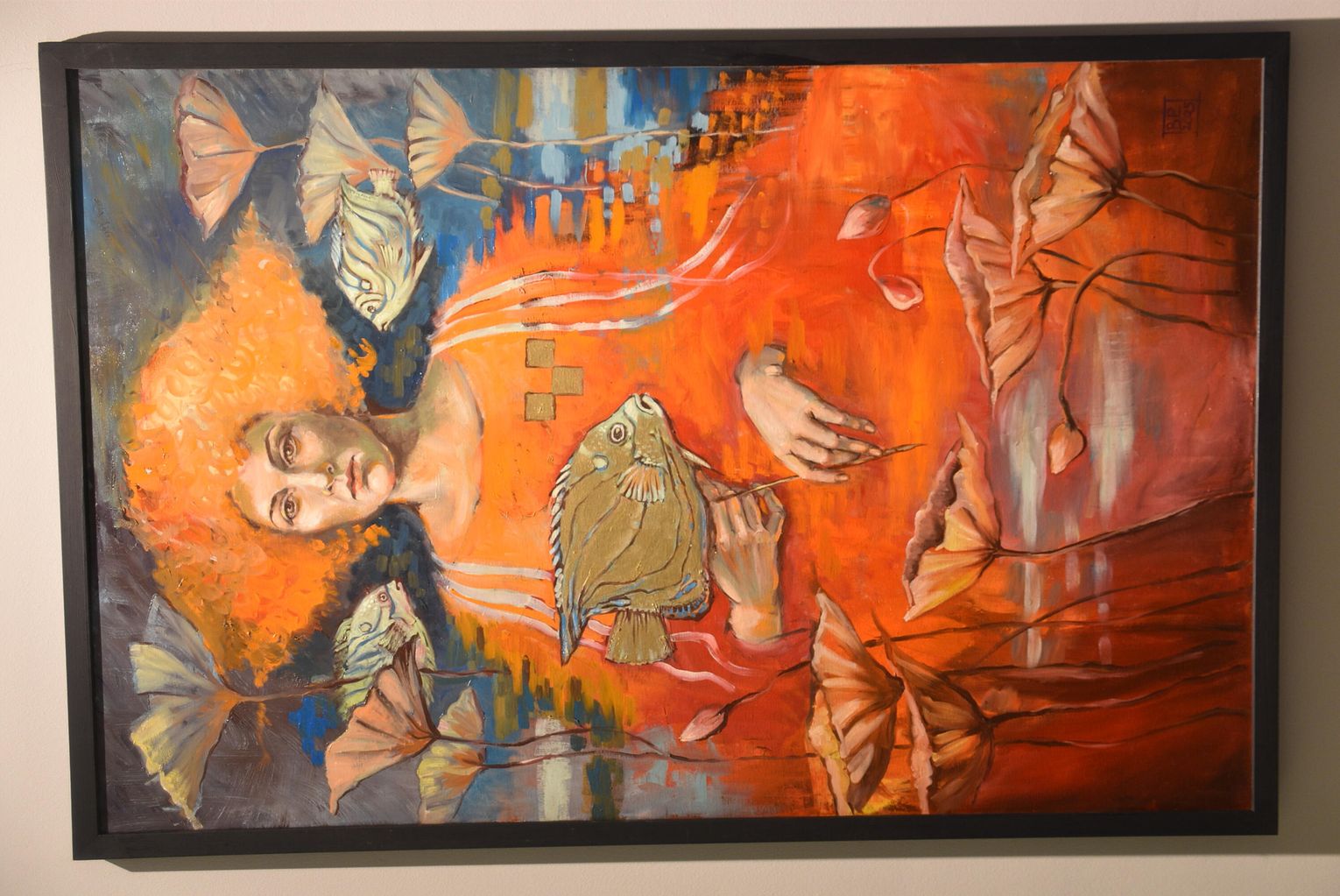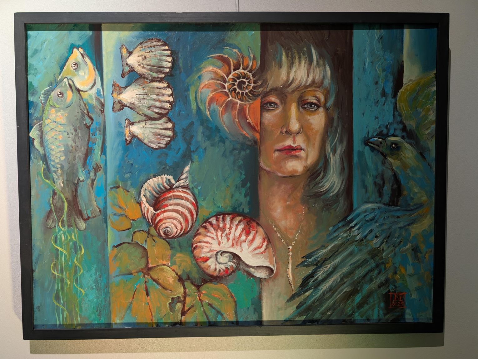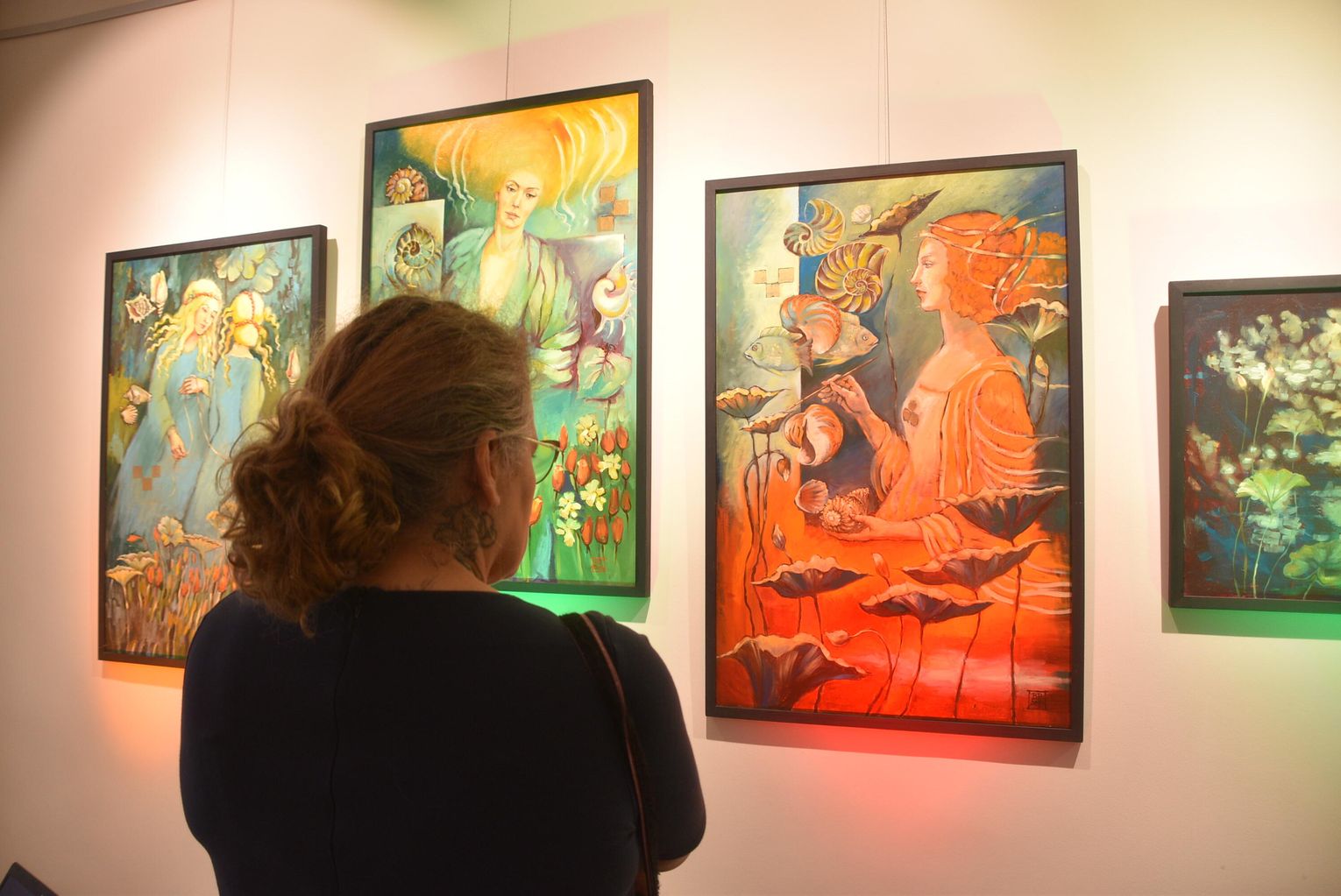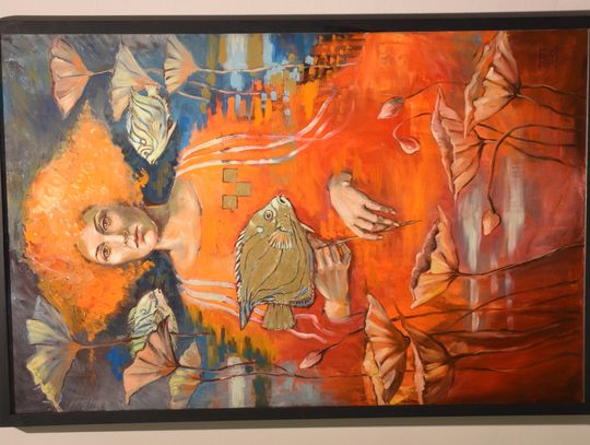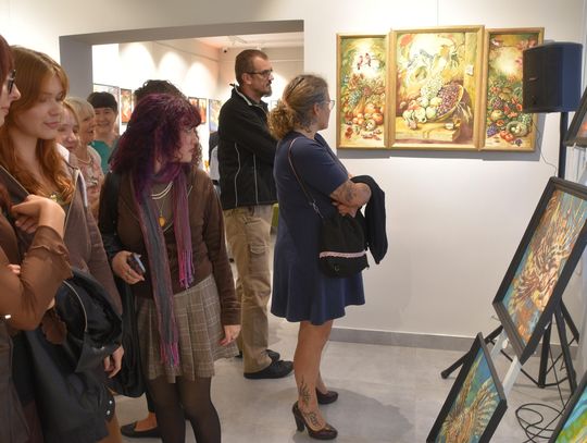 - Bardzo mi miło Was wszystkich dzisiaj gościć - mówiła Bożena Potoczny. - To, co widzicie na wystawie, to efekt w zasadzie ostatniego roku pracy, z wyjątkiem kilku prac, które dla mnie są już "zabytkami". Najstarszy jest obraz "Rajski ogród" - tematycznie związany z tym wszystkim, co mnie otacza. Pierwsze muszle, które zaczęłam malować, też tam są, przywiezione dawno temu przez członków mojej rodziny. Są one dla mnie nieustającym natchnieniem do malowanie takiego mojego własnego wewnętrznego Ogrodu i Oceanu Zieloności. Mieszkam w takim Ogrodzie, który jest na jednym z obrazów tutaj. Obrazy to oczywiście nie są dosłowne kopie rzeczy, które widzę wokół siebie, są to po prostu kompozycje malarskie, które opowiadają o moim wnętrzu, o tym, co wyobrażam sobie na temat tego, co mnie otacza. Ten Ocean Zieloności, to jest ta pierwsza sala. Ocean jest wieloznaczny. Ocean to jest moje marzenie - dosłownie nie byłam nad żadnym oceanem. W Ogrodzie własnym mam za to swoje prywatne wielkie morze, czyli małe jeziorko, w którym pływają złote rybki, spełniają moje marzenia. Jest tu też wspomnienie moich chyba 15 akwariów, które kiedyś miałam w domu. I te skalary w środku to też jakieś wspomnienie po tej dosłownie ścianie akwariów. Na obrazach są także kaczuchy, które mnie odwiedzają co roku. Nie wiem, czy to te same... Najbardziej znaczące dla mnie prace to są te, które nazywam Oceanem Zieloności - są dla mnie kwintesencją próby namalowania dziania się malowania, procesu malowania. Są to takie autotematyczne kompozycje, nazwałem je Metamorfozami, bo w sposób dosłowny są metamorficzne - pod spodem są stare obrazy, które w większości malowałam na ASP, a potem przestały mnie bawić, zostały zupełnie zmienione. Gdyby jeszcze ktoś popatrzył, co jest pod spodem, jak zmieniała się koncepcja danej postaci... Ale to pewnie tylko Rentgen opowiedziałby, gdyby ktoś za pomocą jego promieni chciał zobaczyć, co tam jest pod spodem...