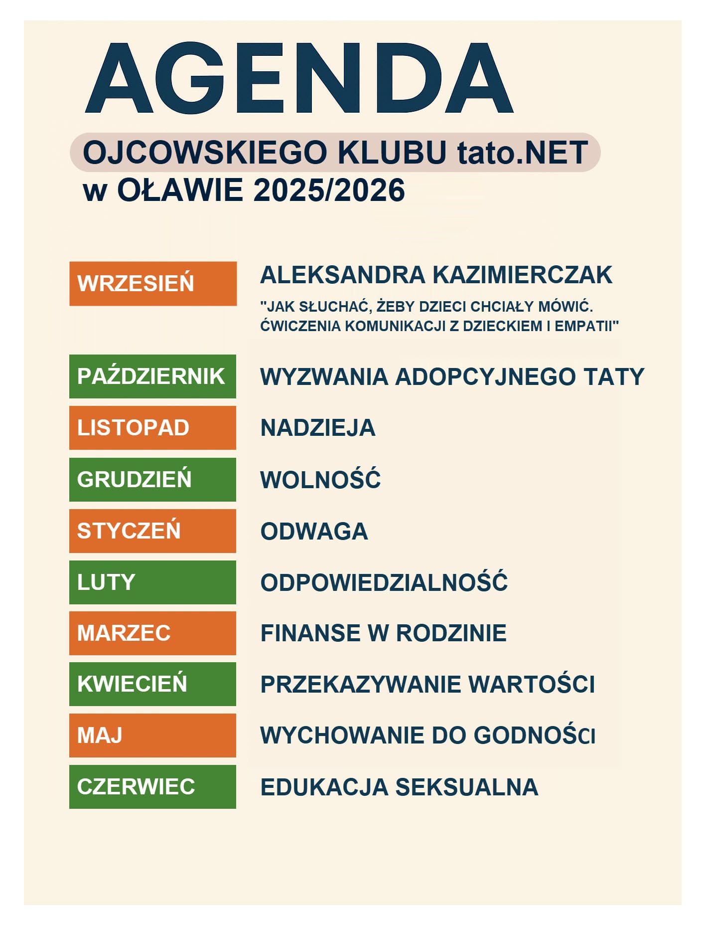 - Minęły wakacje i pora wrócić do rozwoju naszej ojcowskiej pasji - czytamy w mediach społecznościowych Ojcowskiego Klubu Oława. - A jest niewiele lepszych ku temu okazji niż czerpanie z doświadczeń innych ojców i poruszanie się w tematyce bliskiej czekającym nas wyzwaniom. Stąd już od września ruszamy z impetem w nowy sezon Ojcowskiego Klubu Tato.Net. Na podstawie propozycji tato.net oraz głosowania zaangażowanych ojców ustaliliśmy agendę na nowy sezon i już dziś zapraszamy Cię Tato na nasze spotkania. Kiedy? W każdą trzecią środę miesiąca w godz. 19.30-21.30 w Oławskim Centrum Rozwoju Społecznego. Wstęp wolny.