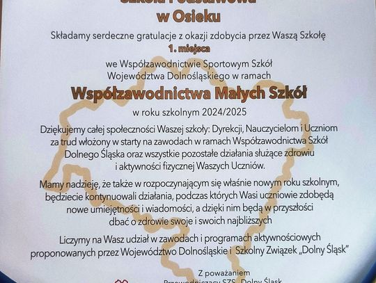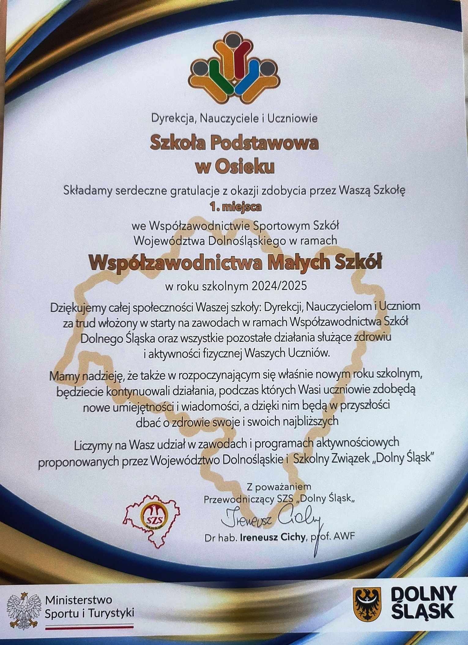 W kategorii małych szkół, ogromny sukces odniosła Szkoła Podstawowa im. Karola Wojtyły z Osieka, która zajęła I miejsce. Uczniowie, wraz z nauczycielką wychowania fizycznego, Marią Adamowicz, otrzymali pamiątkowy puchar, list gratulacyjny oraz bon na zakup sprzętu sportowego.