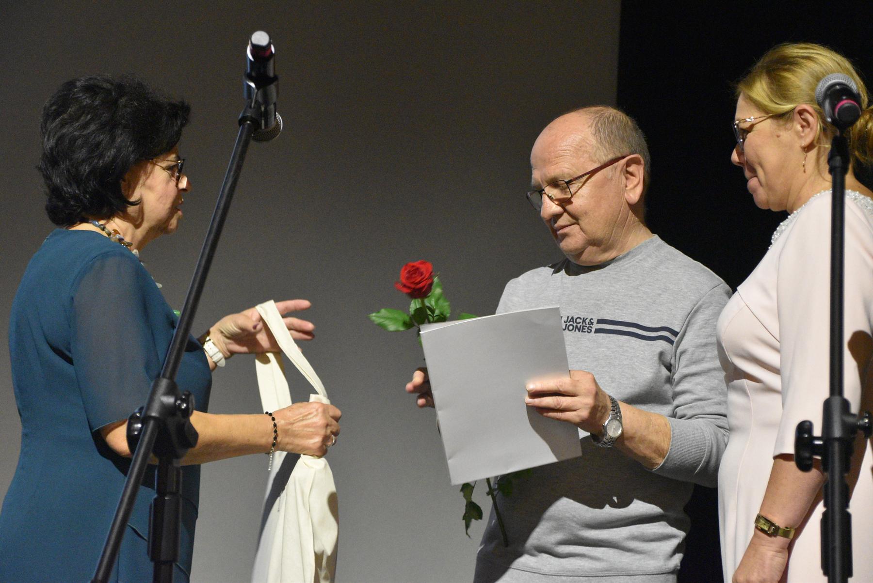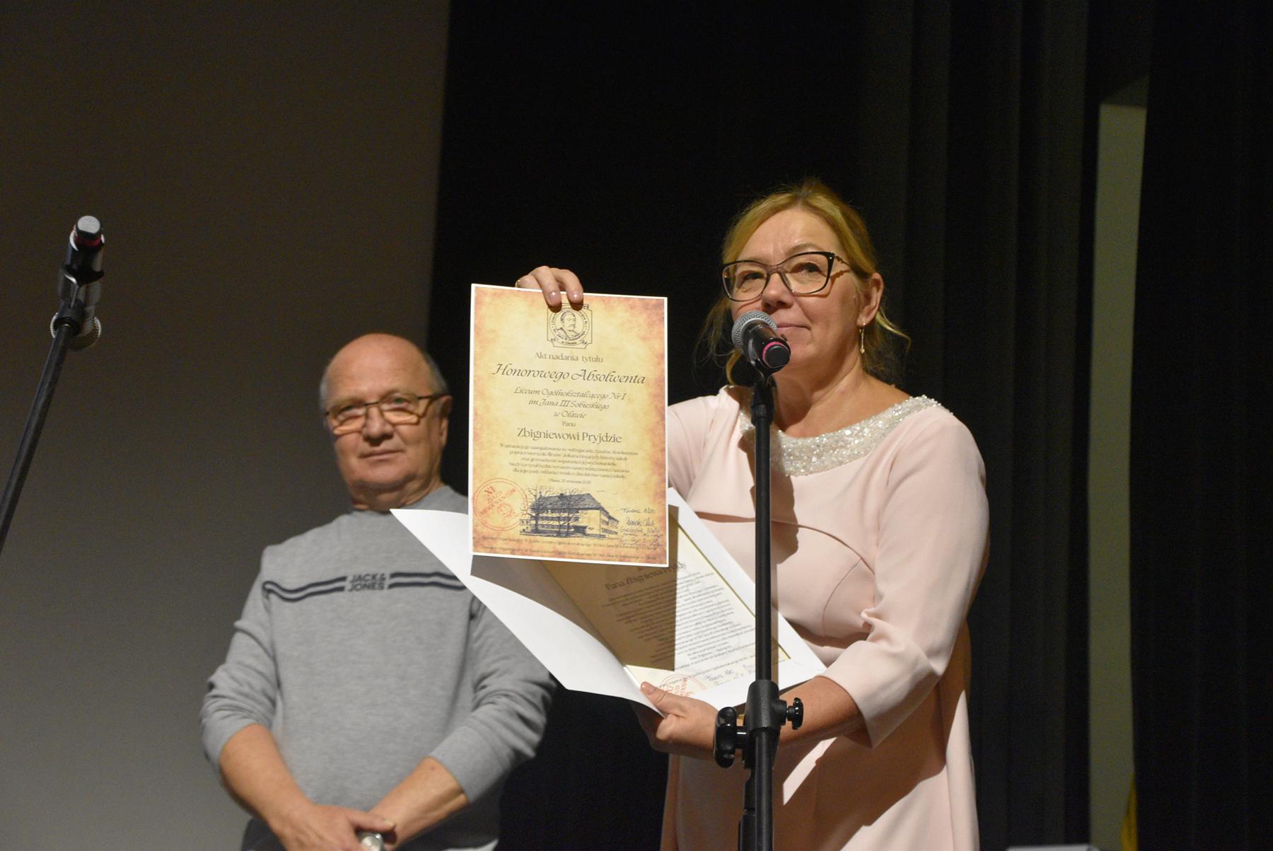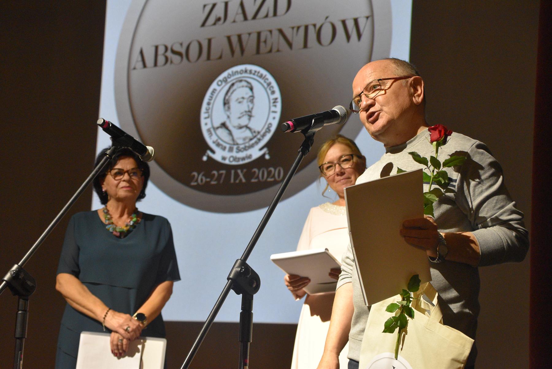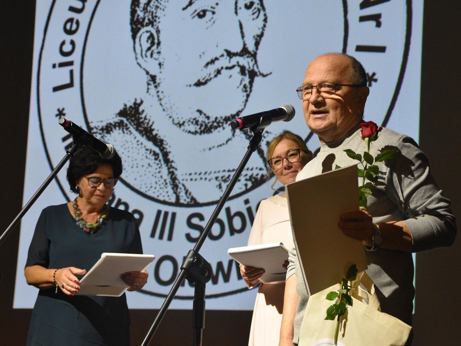 Fragment z laudacji: - W świecie, w którym wszystko tak szybko przemija, w którym wspomnienia bledną, a chwile ulatują niepostrzeżenie, są ludzie, którzy potrafią zatrzymać czas. Pan Zbigniew Pryjda jest jednym z nich. Choć nie był uczniem naszej szkoły, zna ją jak mało kto. Przez lata z oddaniem i pasją dokumentował życie naszej społeczności, zjazdy absolwentów, spotkania, jubileusze. Dzięki jego pracy wspomnienia nie tylko są ulotnymi obrazami w pamięci, lecz żyją w kadrach, które wzruszają, bawią i przypominają, kim jesteśmy. Pan Zbigniew nie tylko rejestrował wydarzenia, on je współtworzył. Z dyskrecją, profesjonalizmem i ogromnym sercem. Jego obecność stała się nieodłącznym elementem naszych uroczystości, a jego obiektyw - lustrem, w którym odbija się historia naszej szkoły. Dlatego dziś z uznaniem i wdzięcznością nadajemy panu Zbigniewowi Pryjdzie tytuł "Honorowego Absolwenta Liceum Ogólnokształcącego nr 1 im. Jana III Sobieskiego w Oławie". Niech to wyróżnienie będzie wyrazem wdzięczności za lata współpracy, za troskę o pamięć i za to, że dzięki Panu możemy nie tylko wspominać przeszłość, ale także przeżywać ją na nowo. Panie Zbigniewie, Dziękujemy!