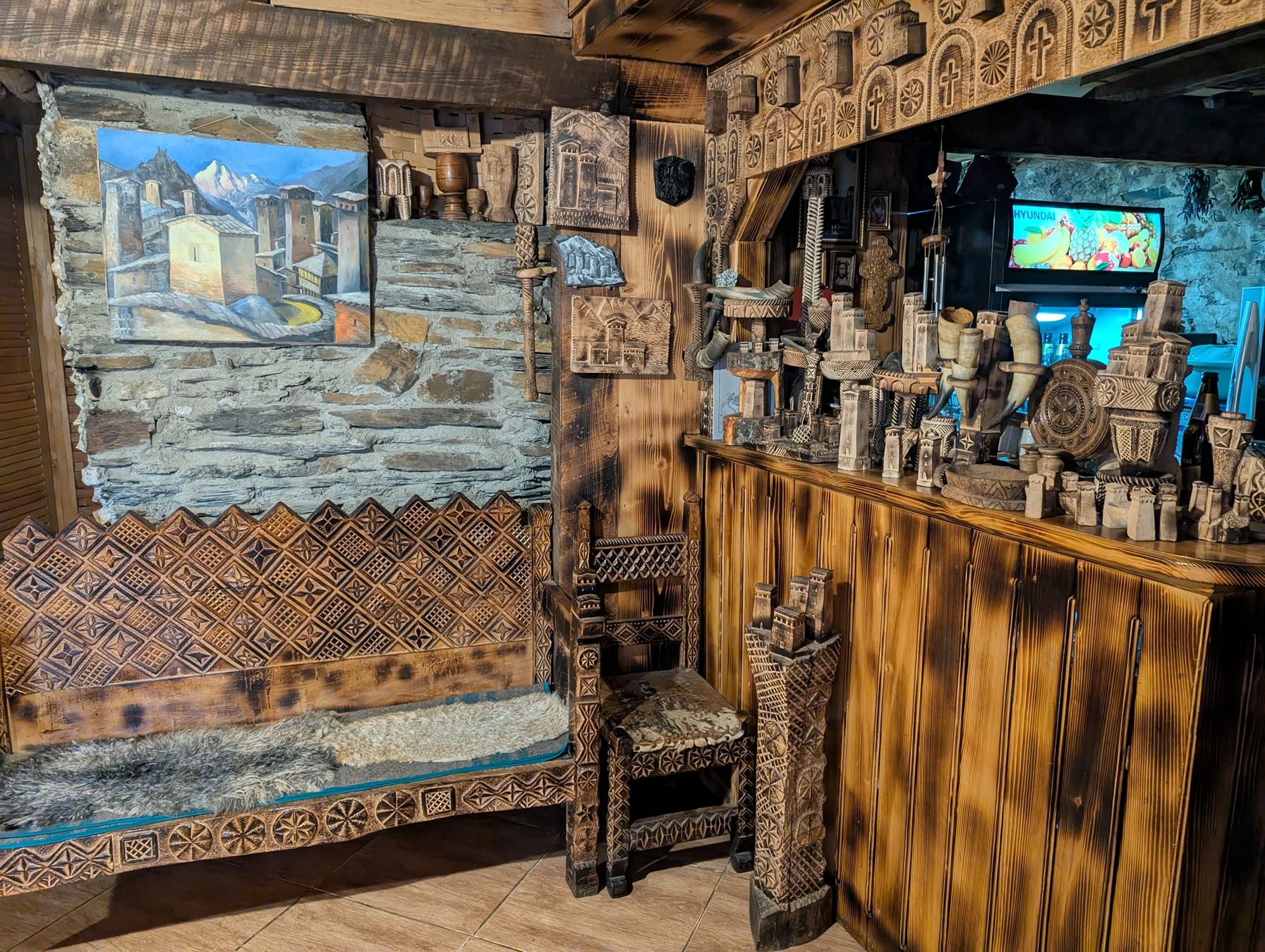Ludowa sztuka "na żywo", bo to normalna jadalnia, tyle że u miejscowego artysty-rzeźbiarza