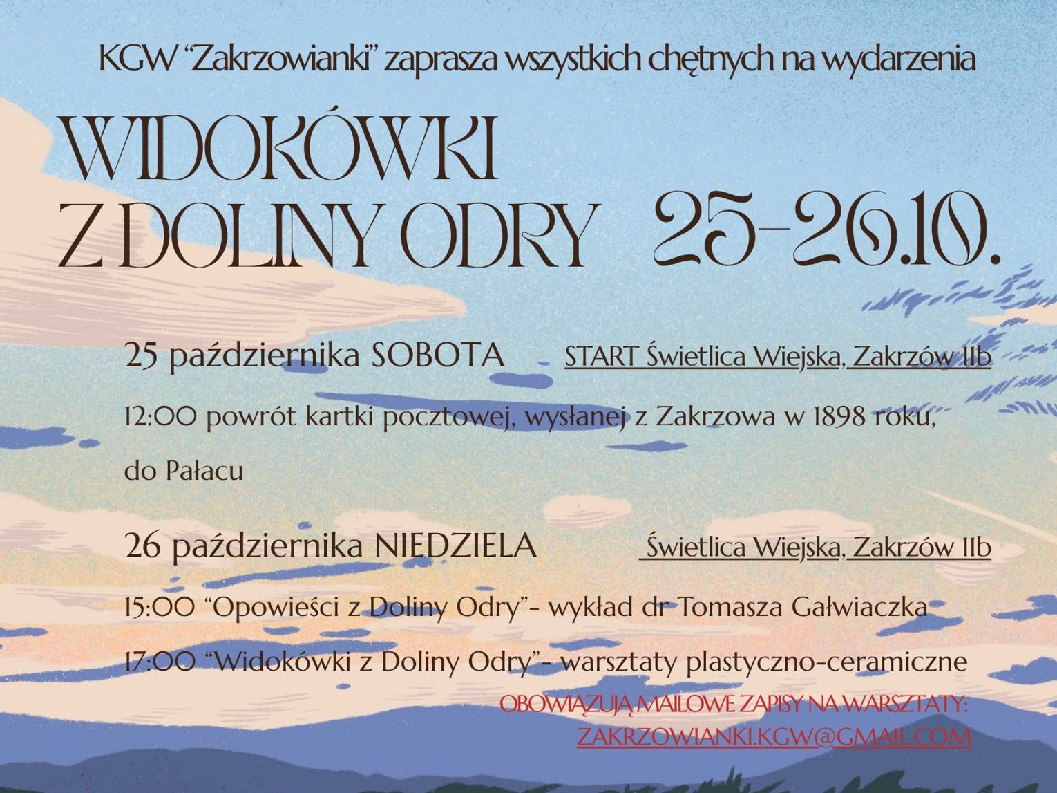 25 października, godz. 12:00 - spacer spod Wiejskiej Świetlicy w Zakrzowie do Pałacu, wraz z powracającą tam po 127 latach kartką pocztową,