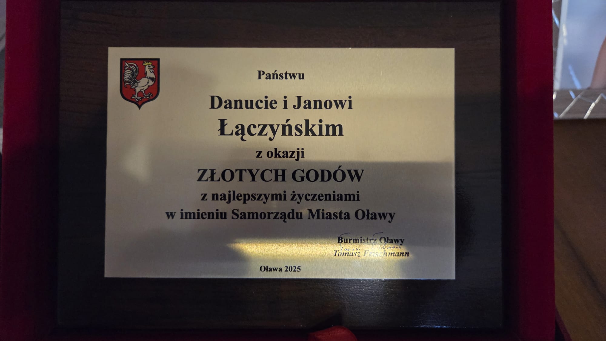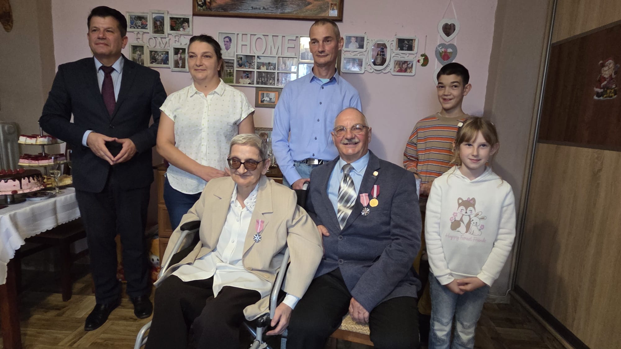 Burmistrz Oławy Tomasz Frischmann w imieniu własnym o lokalnej społeczności gratulował takiego jubileuszu i życzył jubilatom wszystkiego najlepszego. Wręczył dostojnym jubilatom Medal za Długoletnie Pożycie Małżeńskie, które nadaje Prezydent RP. Jubilaci dostali także od burmistrza grawerton z życzeniami.