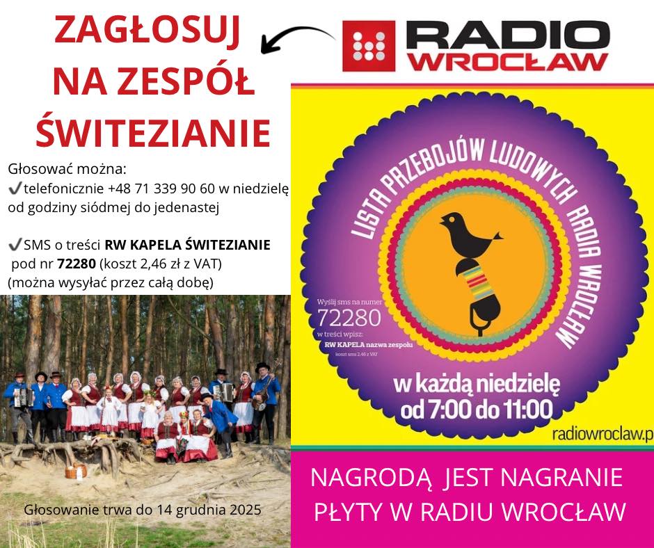 Nagrodą w tej zabawie jest nagranie płyty w Radiu Wrocław. Każdy głos się liczy! Głosować telefonicznie można w niedzielę od godziny siódmej do jedenastej, a SMS-y można wysyłać przez całą dobę pod numer 72280 w treści wpisując RW Kapela i nazwę zespołu ŚWITEZIANIE. Koszt to 2,46 groszy. Głosowanie trwa do 14 grudnia!