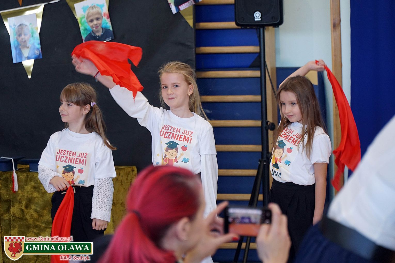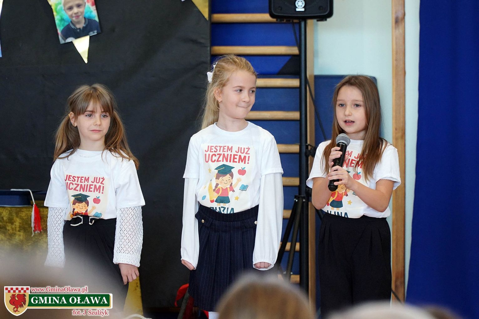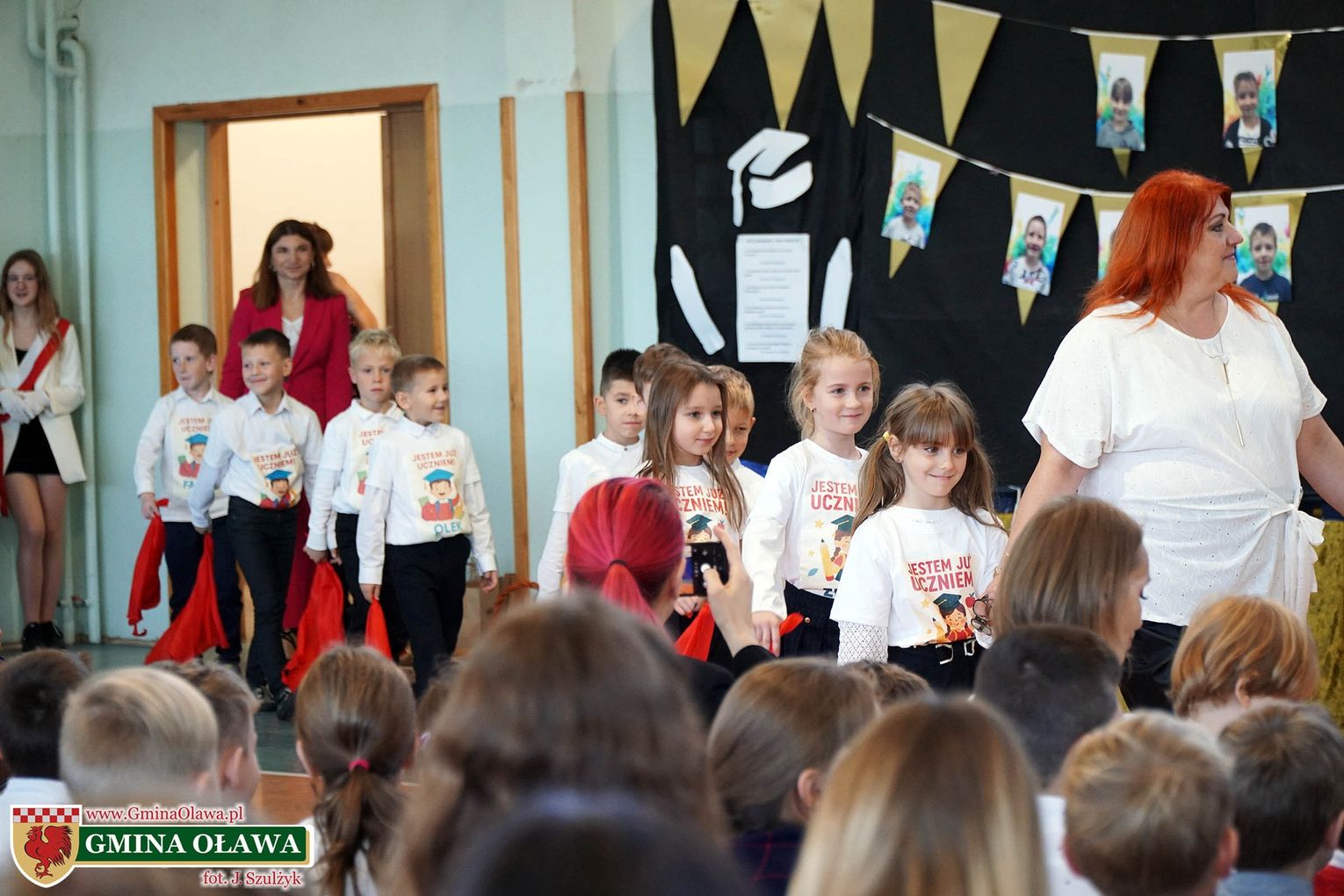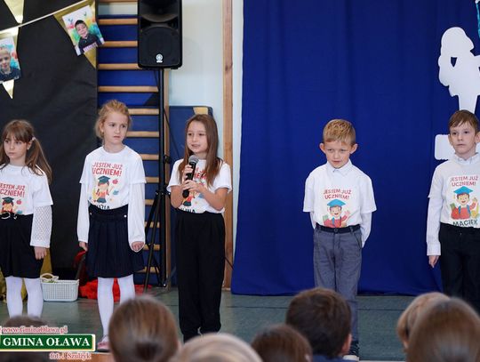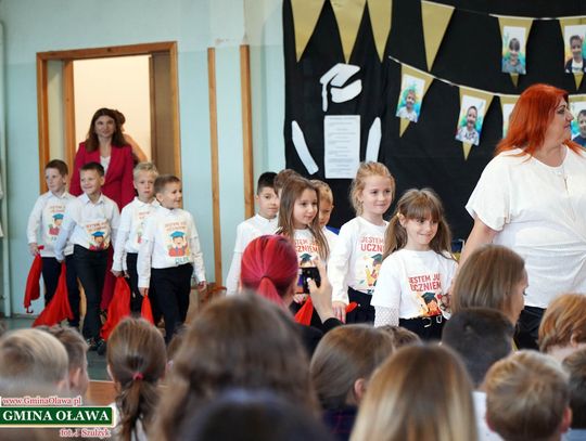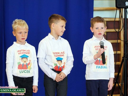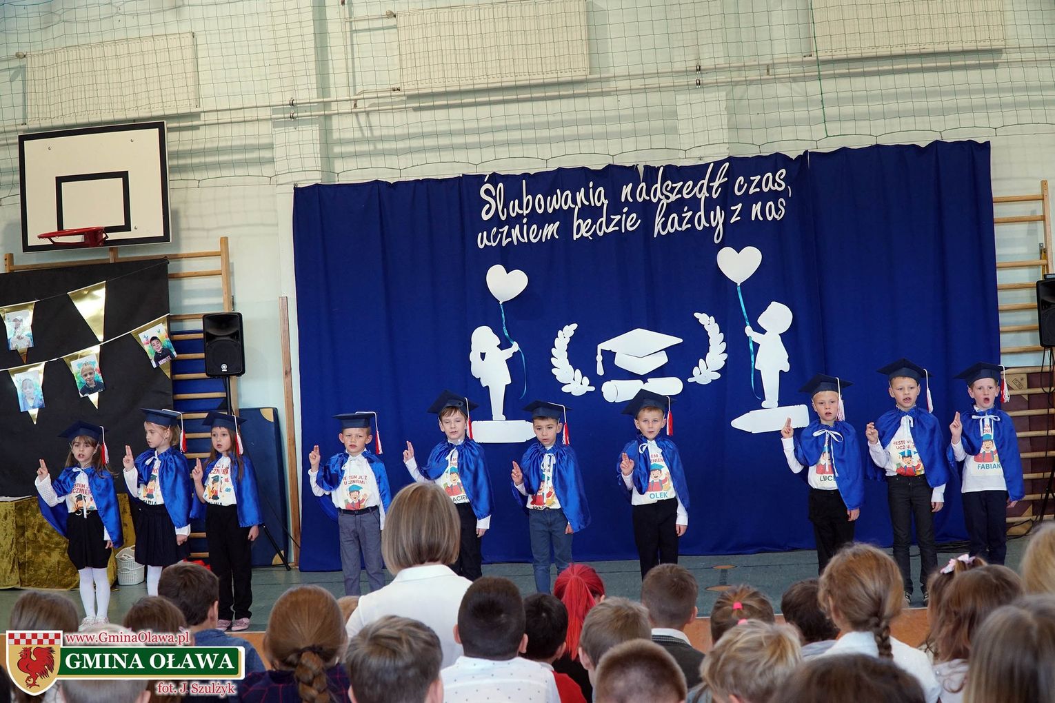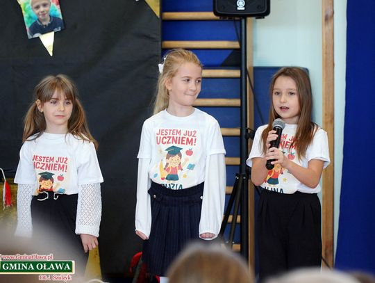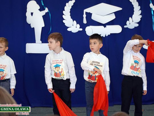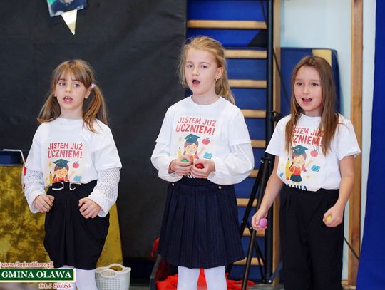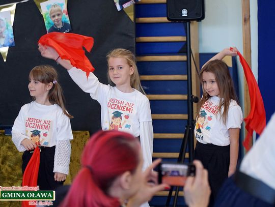 Mimo stresu związanego z pierwszym publicznym występem, uczniowie doskonale sobie poradzili i zaprezentowali swoje talenty wokalne, recytatorskie, muzyczne. Następnie złożyli ślubowanie, a dyrektor szkoły Justyna Kościelna oraz zastępca wójta Helena Masło dokonały uroczystego pasowania na ucznia oraz wręczyły dyplomy i upominki. Na koniec wprowadzono piękny tort, upieczony specjalne na tą okazję i zrobiono pamiątkowe zdjęcia.