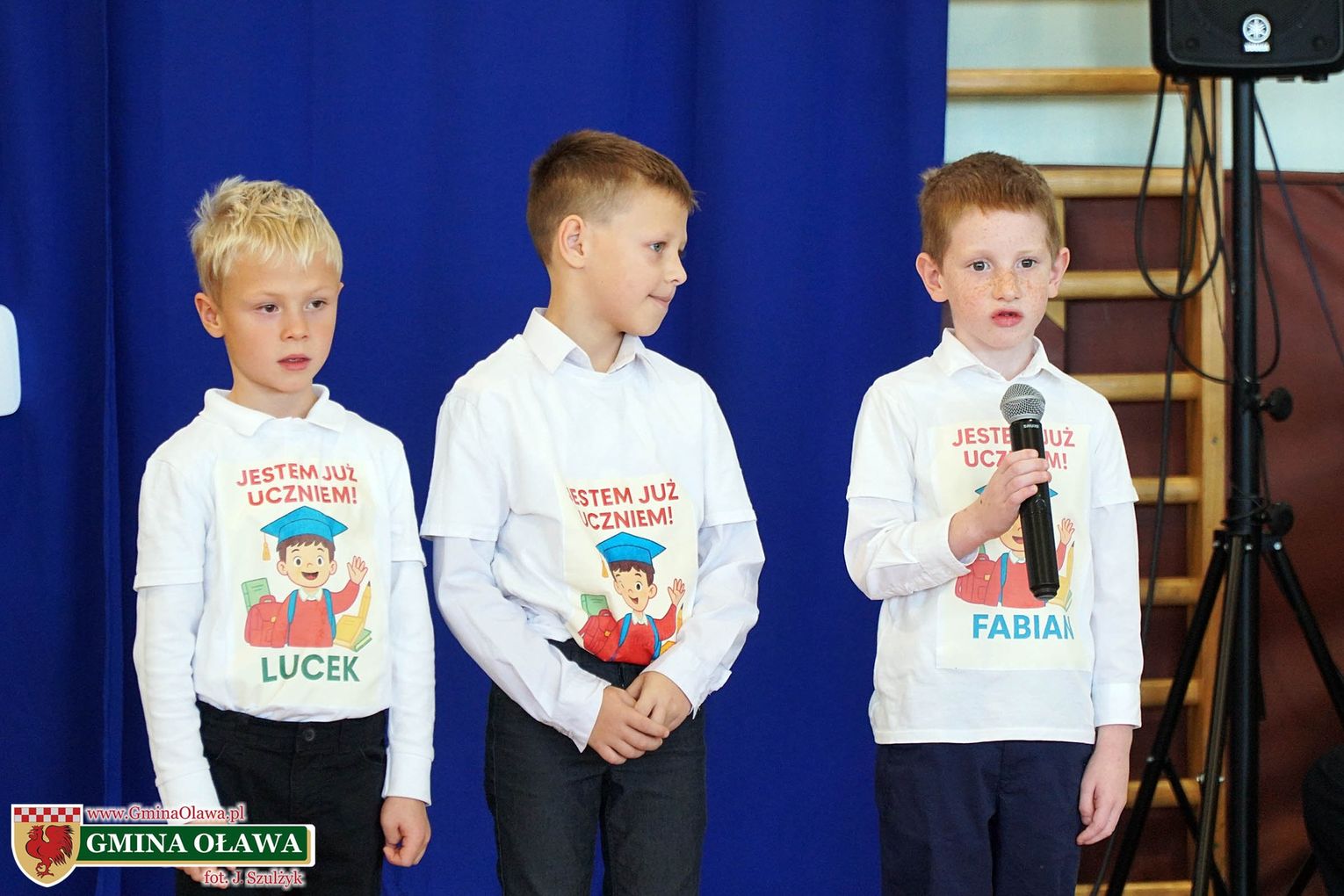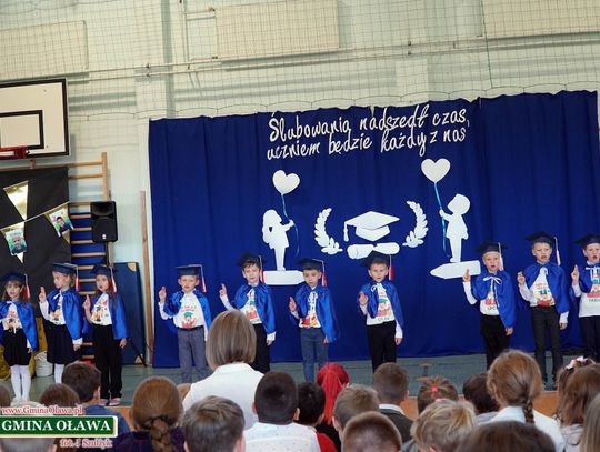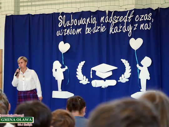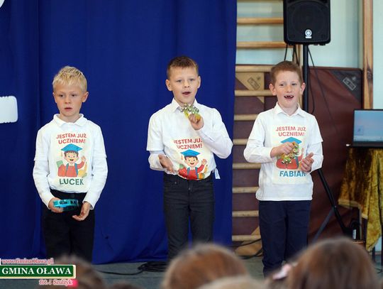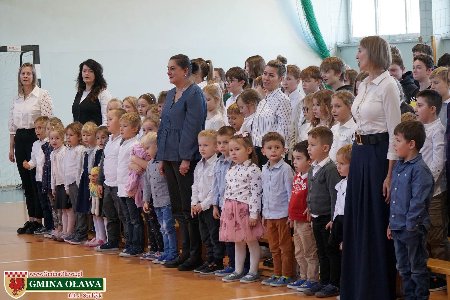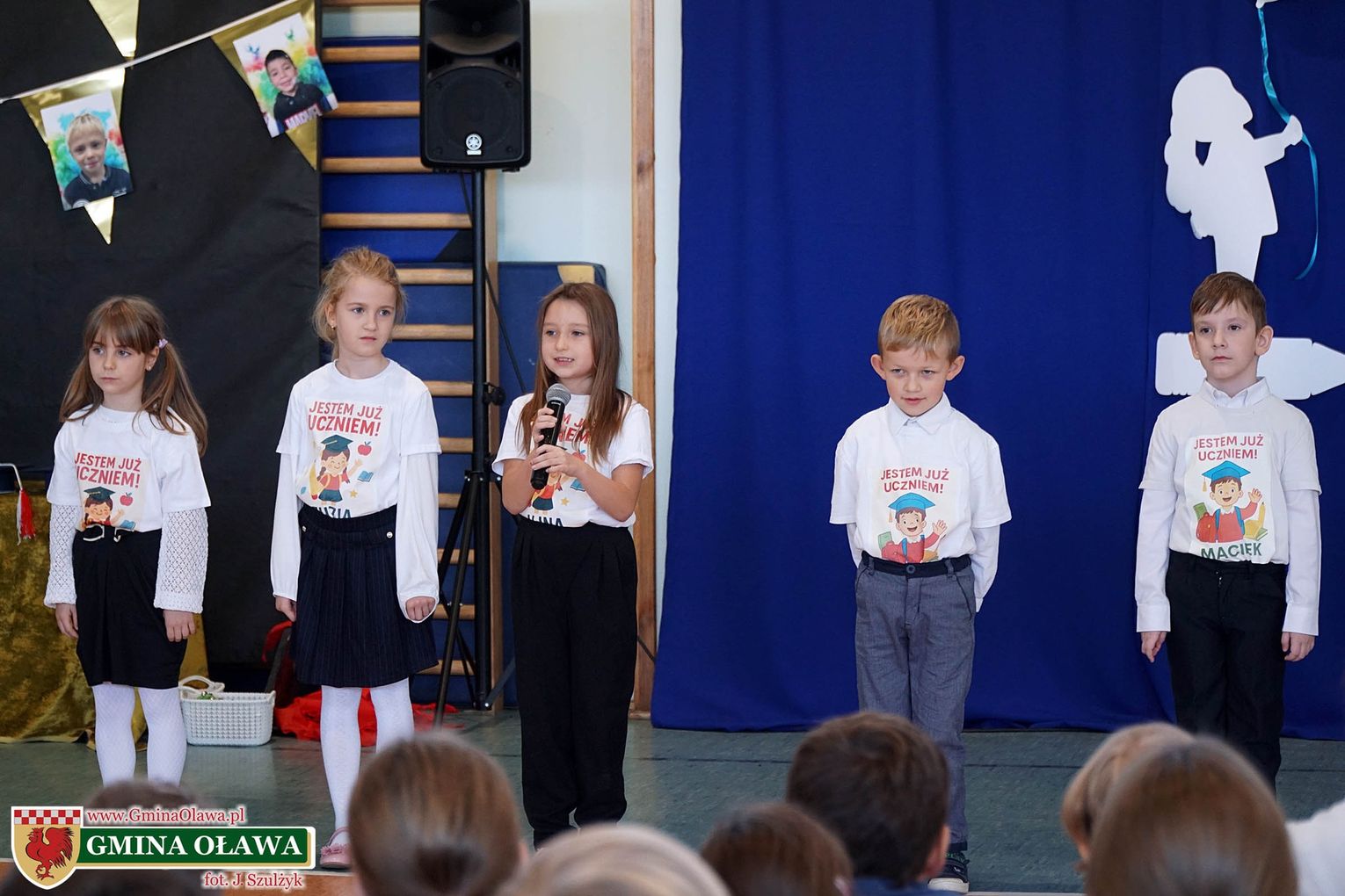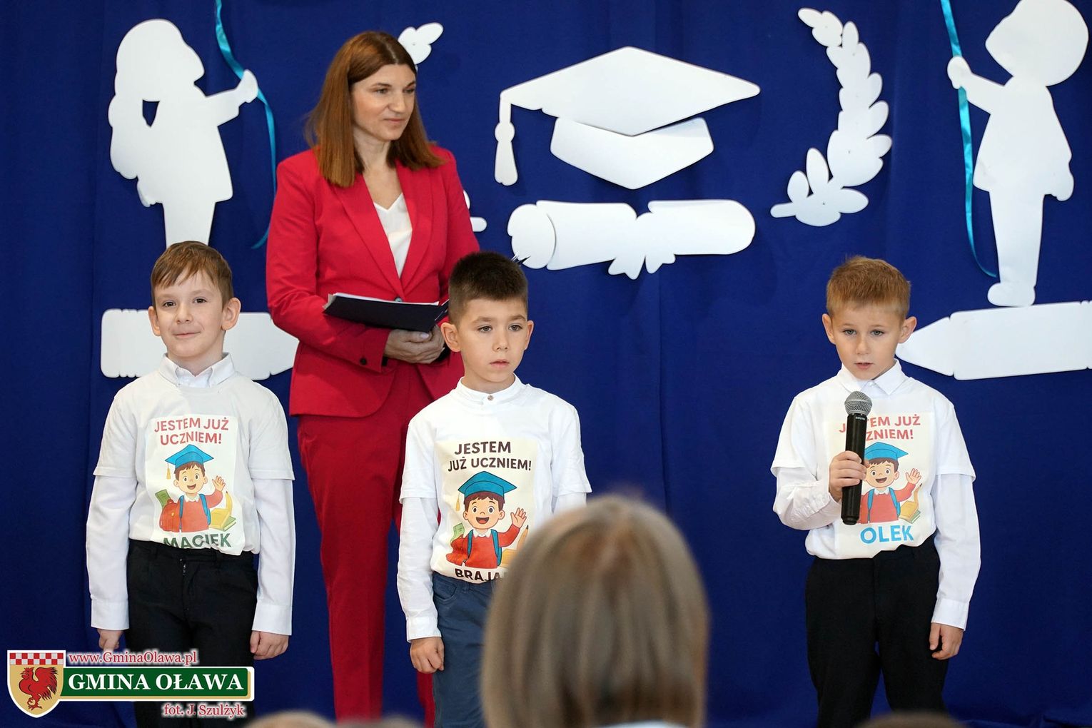 Mimo stresu związanego z pierwszym publicznym występem, uczniowie doskonale sobie poradzili i zaprezentowali swoje talenty wokalne, recytatorskie, muzyczne. Następnie złożyli ślubowanie, a dyrektor szkoły Justyna Kościelna oraz zastępca wójta Helena Masło dokonały uroczystego pasowania na ucznia oraz wręczyły dyplomy i upominki. Na koniec wprowadzono piękny tort, upieczony specjalne na tą okazję i zrobiono pamiątkowe zdjęcia.