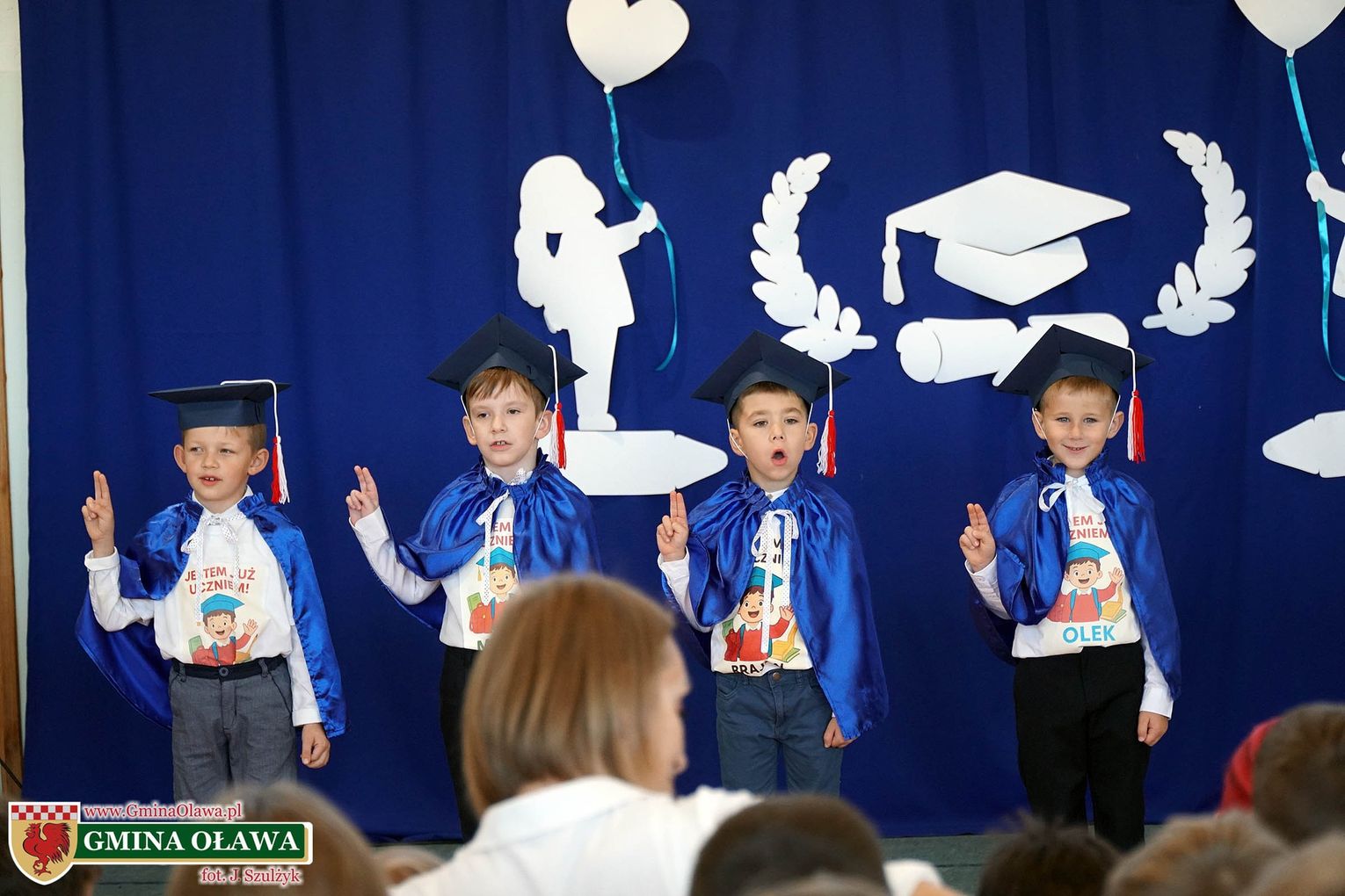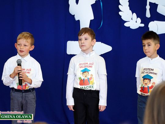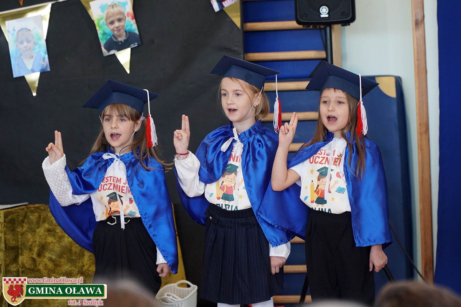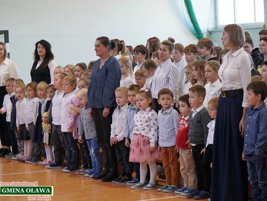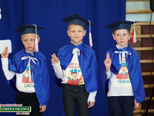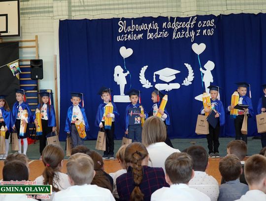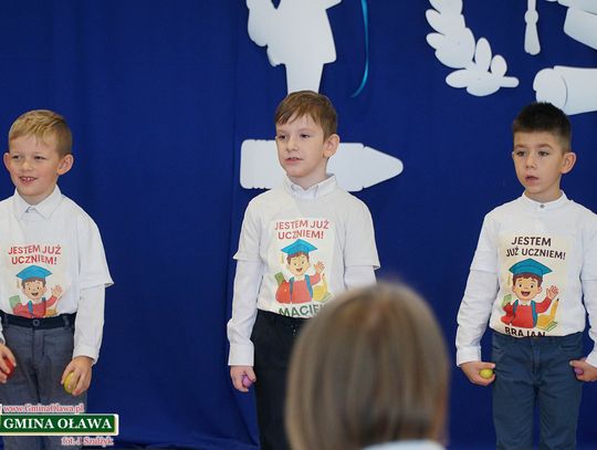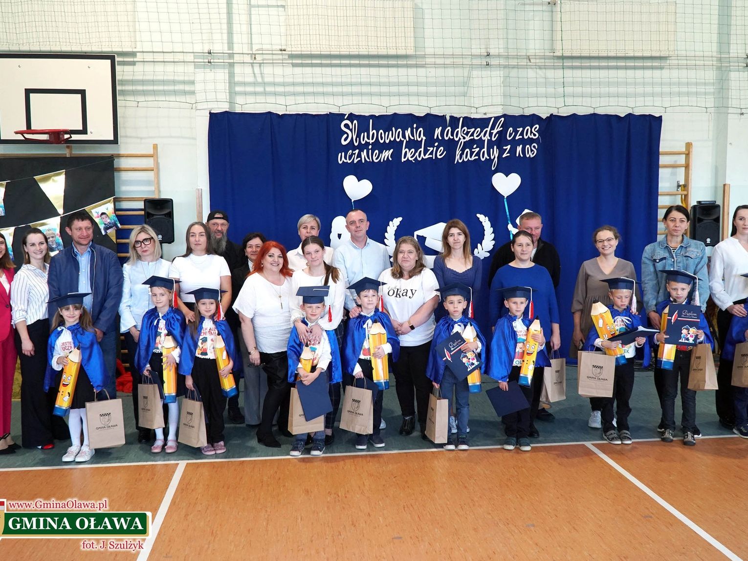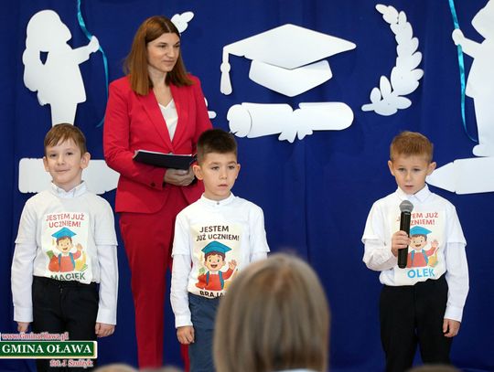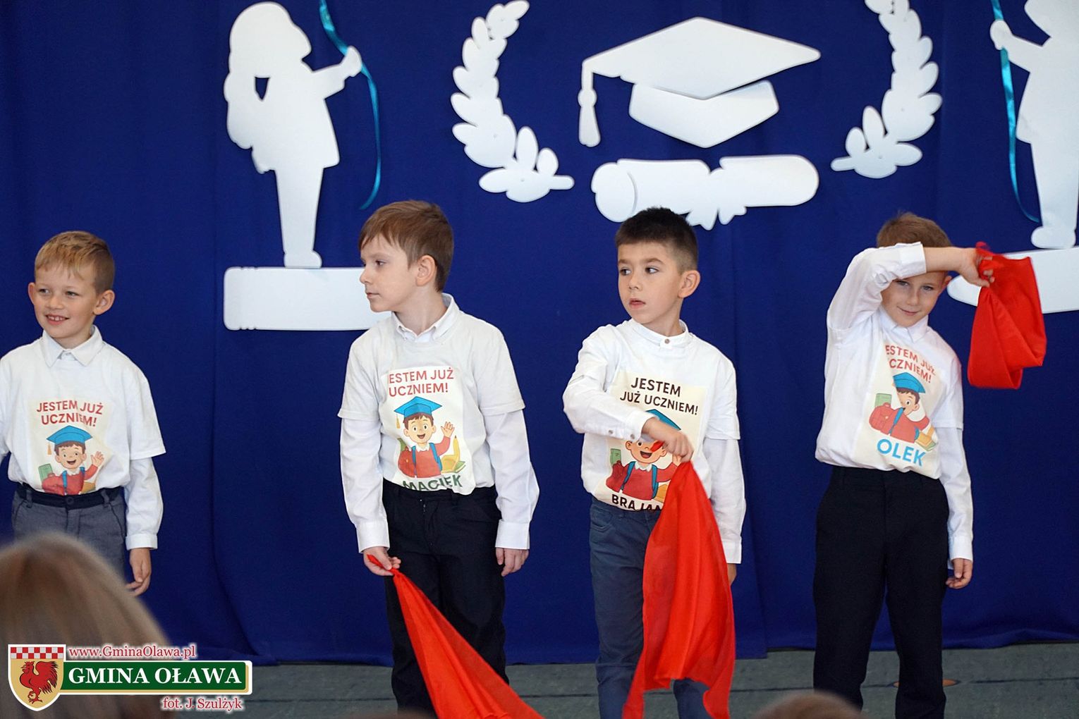 Mimo stresu związanego z pierwszym publicznym występem, uczniowie doskonale sobie poradzili i zaprezentowali swoje talenty wokalne, recytatorskie, muzyczne. Następnie złożyli ślubowanie, a dyrektor szkoły Justyna Kościelna oraz zastępca wójta Helena Masło dokonały uroczystego pasowania na ucznia oraz wręczyły dyplomy i upominki. Na koniec wprowadzono piękny tort, upieczony specjalne na tą okazję i zrobiono pamiątkowe zdjęcia.