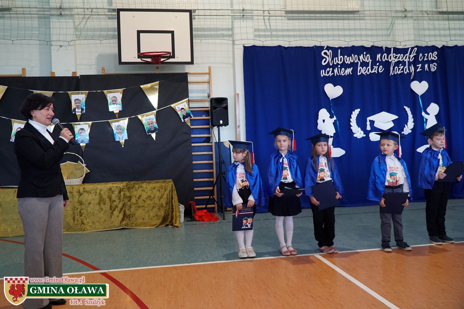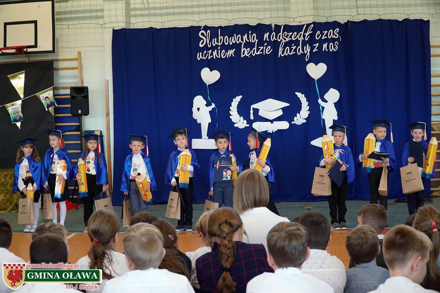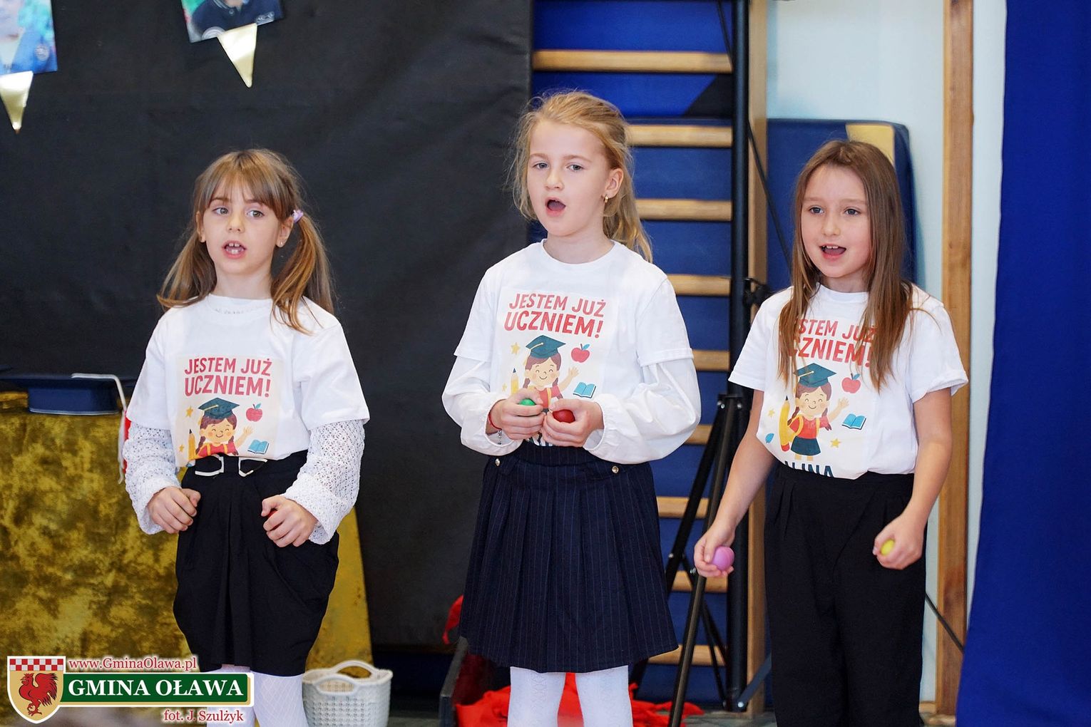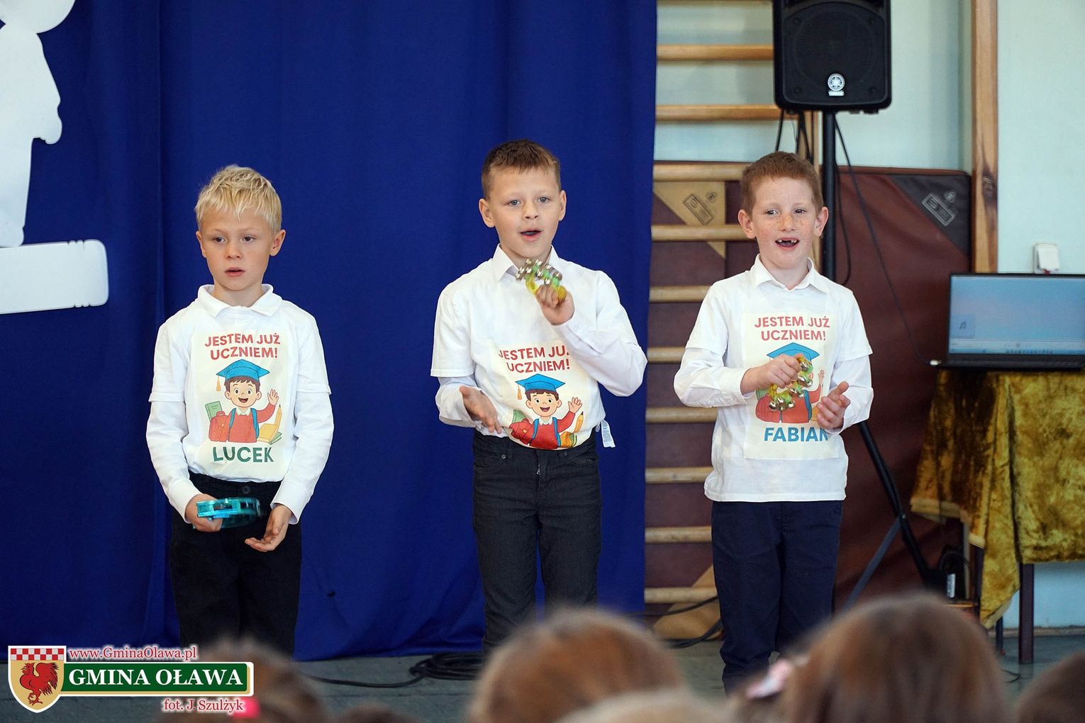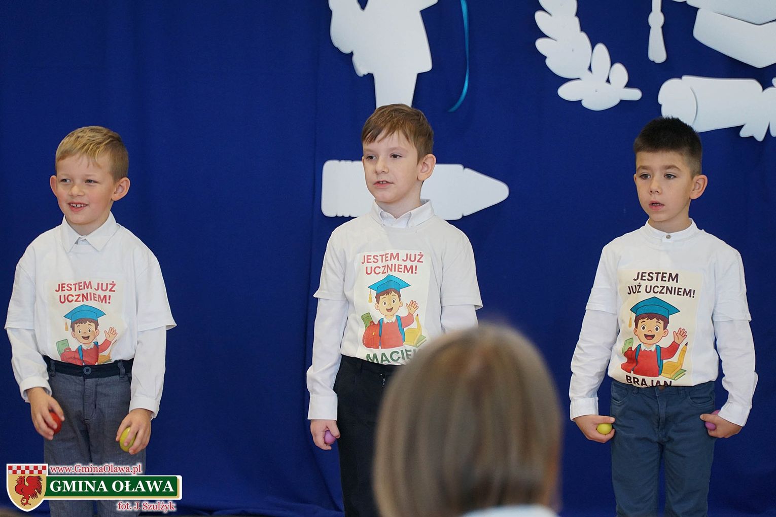 Mimo stresu związanego z pierwszym publicznym występem, uczniowie doskonale sobie poradzili i zaprezentowali swoje talenty wokalne, recytatorskie, muzyczne. Następnie złożyli ślubowanie, a dyrektor szkoły Justyna Kościelna oraz zastępca wójta Helena Masło dokonały uroczystego pasowania na ucznia oraz wręczyły dyplomy i upominki. Na koniec wprowadzono piękny tort, upieczony specjalne na tą okazję i zrobiono pamiątkowe zdjęcia.