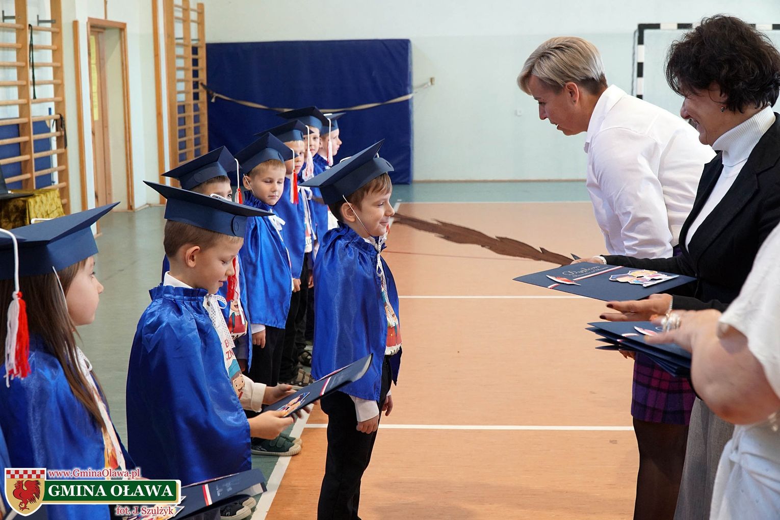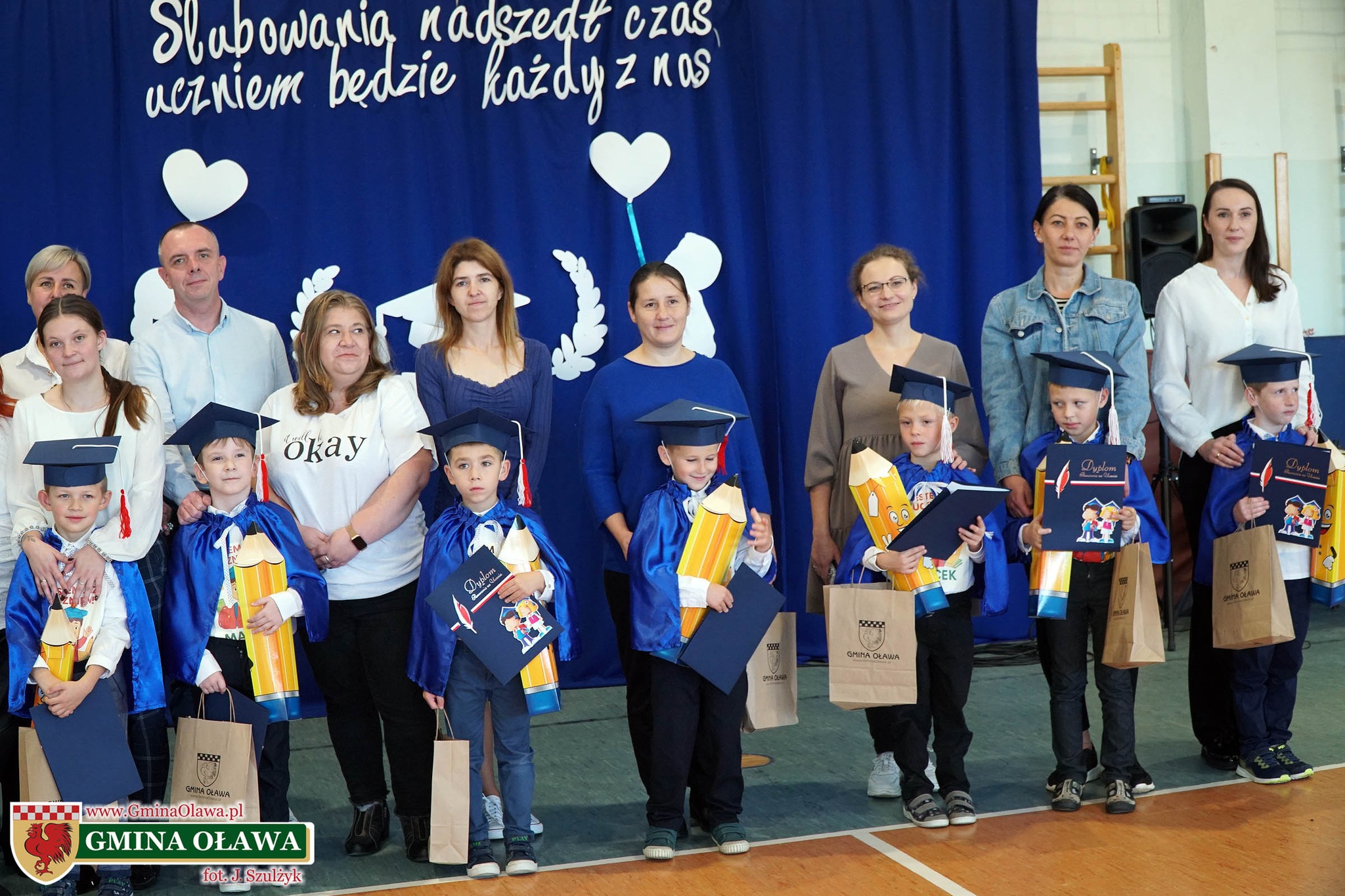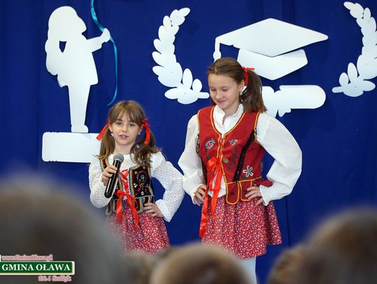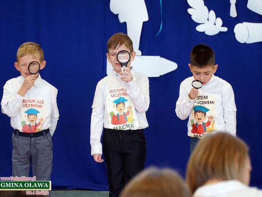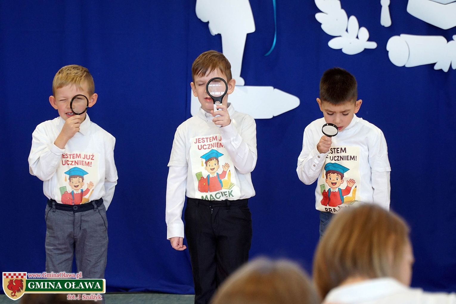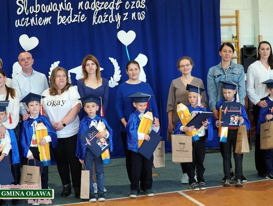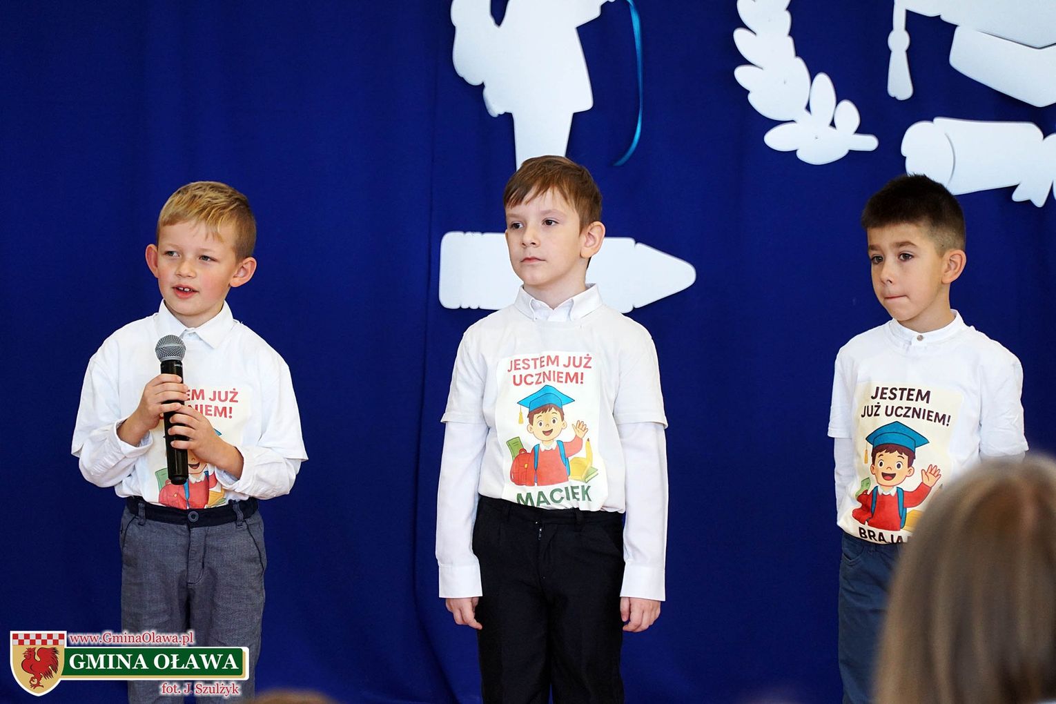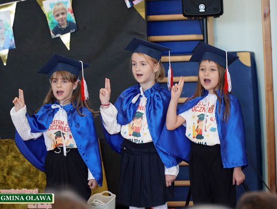 Mimo stresu związanego z pierwszym publicznym występem, uczniowie doskonale sobie poradzili i zaprezentowali swoje talenty wokalne, recytatorskie, muzyczne. Następnie złożyli ślubowanie, a dyrektor szkoły Justyna Kościelna oraz zastępca wójta Helena Masło dokonały uroczystego pasowania na ucznia oraz wręczyły dyplomy i upominki. Na koniec wprowadzono piękny tort, upieczony specjalne na tą okazję i zrobiono pamiątkowe zdjęcia.
