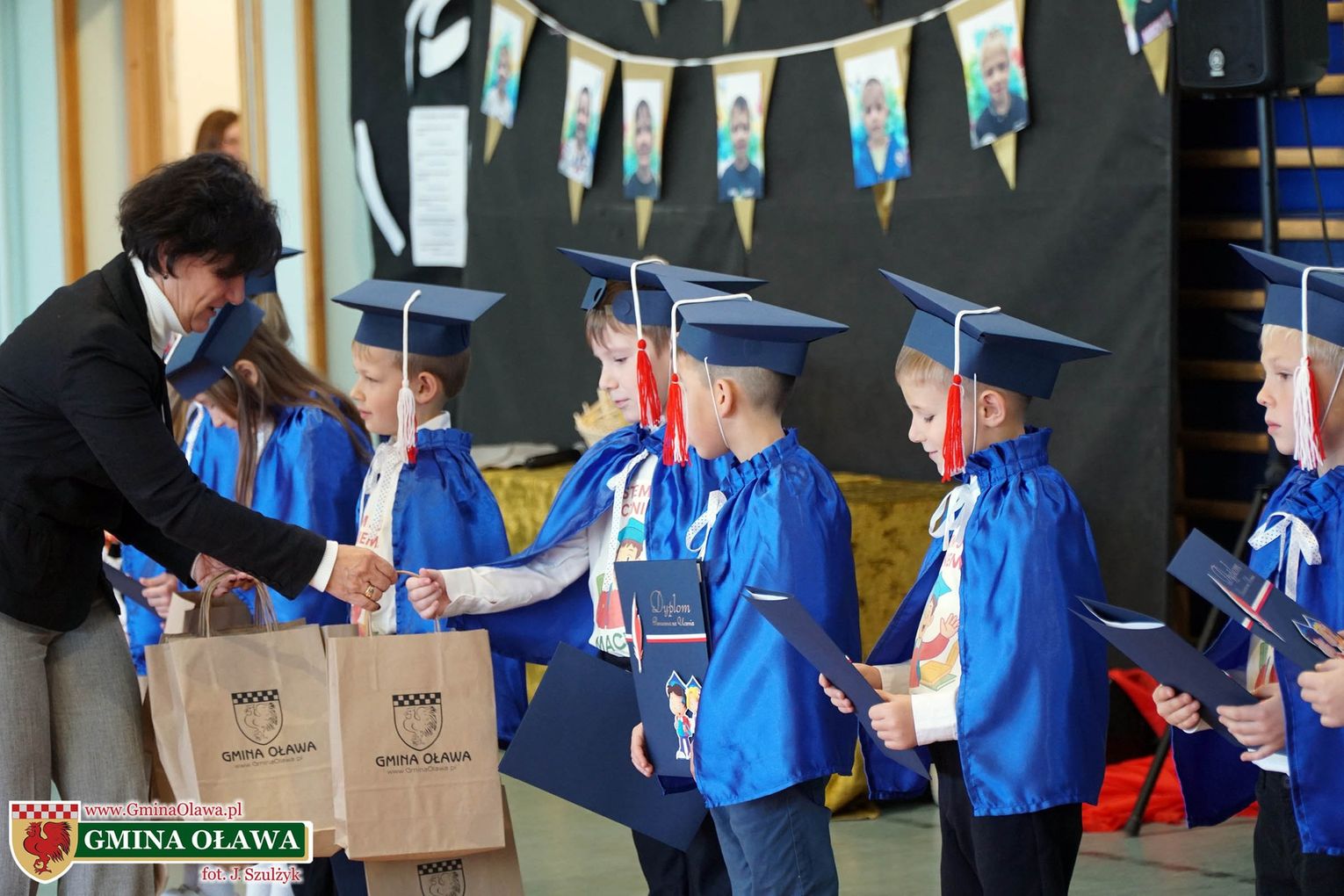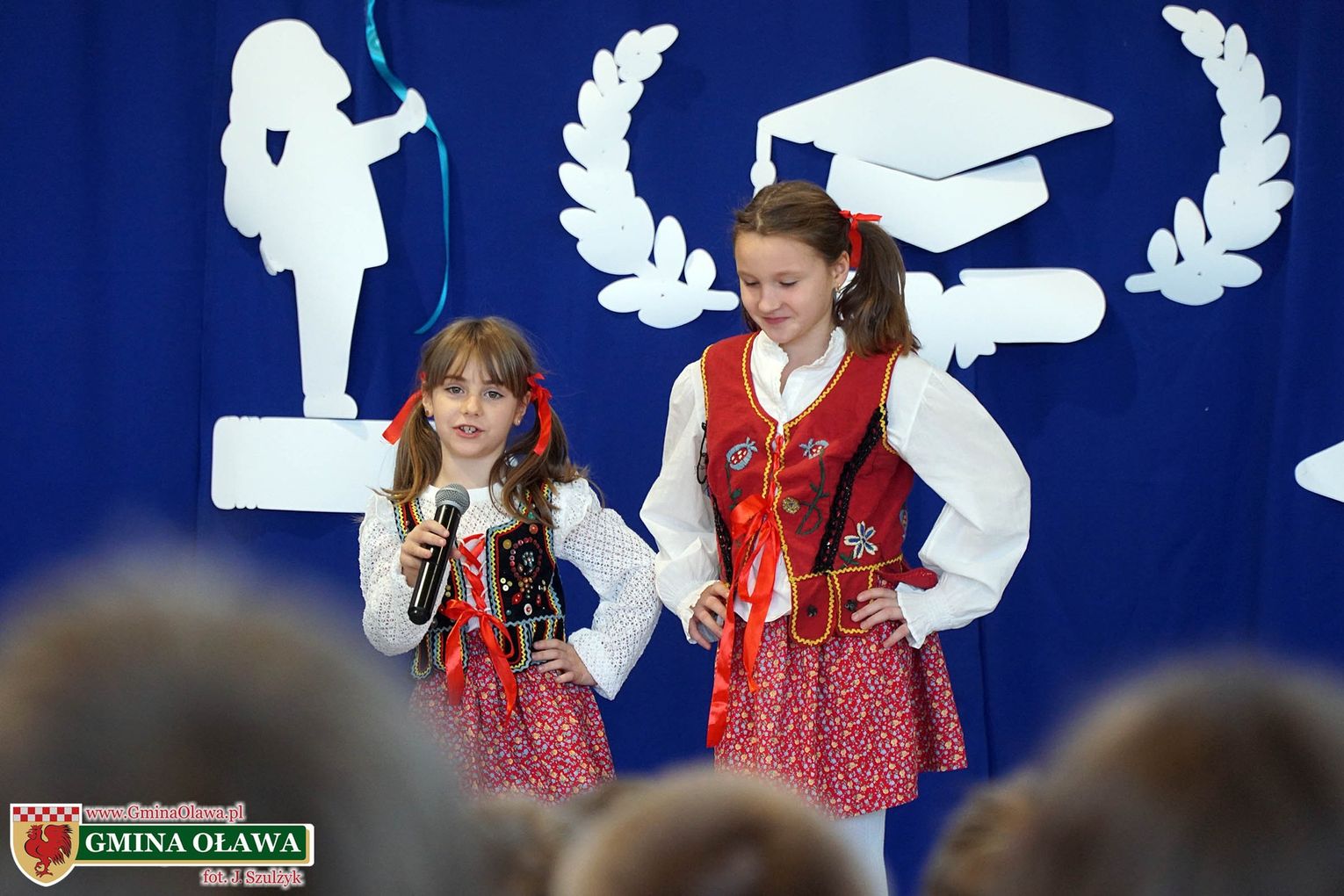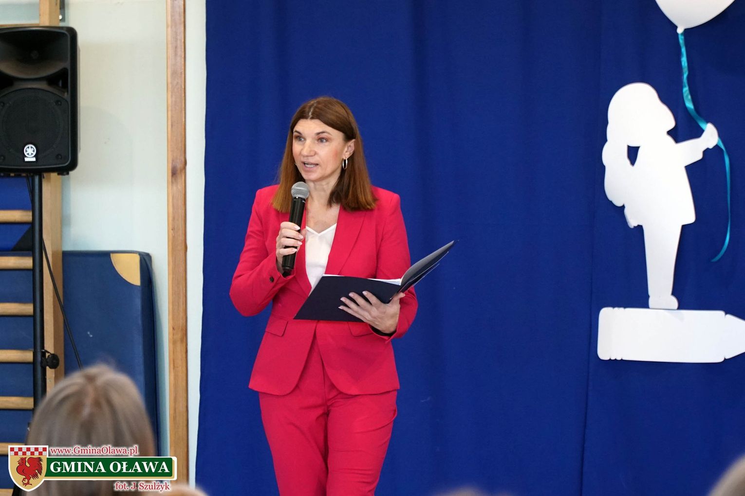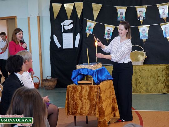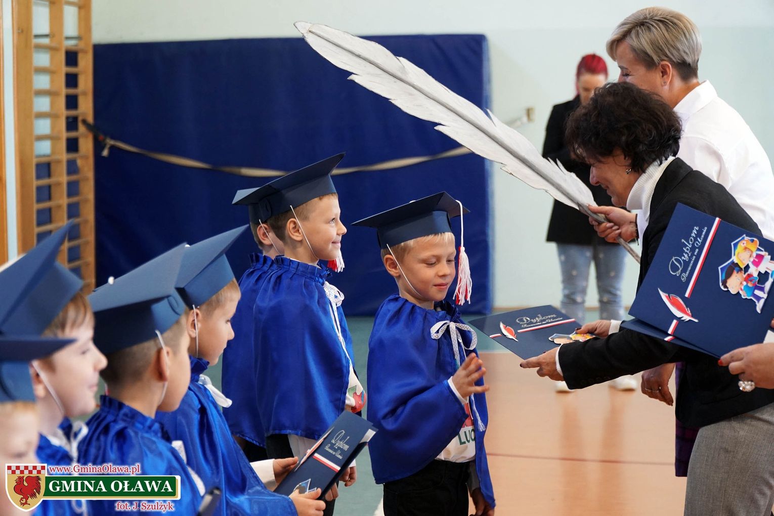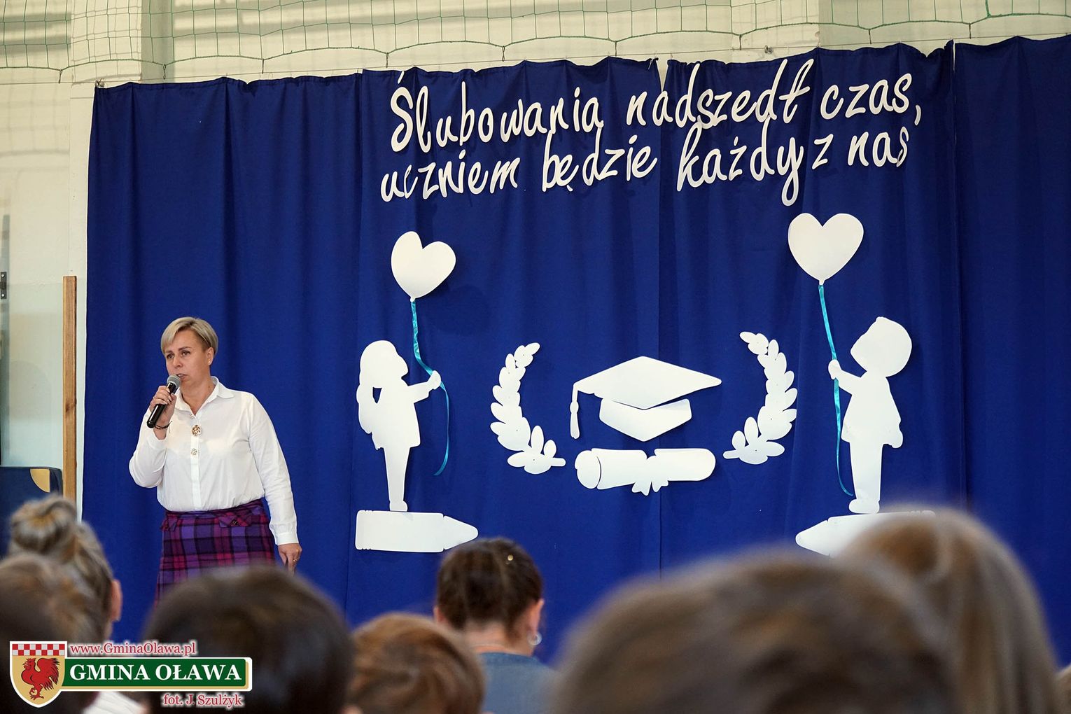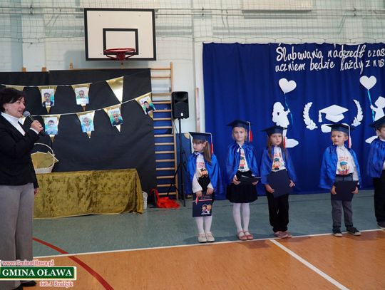 Mimo stresu związanego z pierwszym publicznym występem, uczniowie doskonale sobie poradzili i zaprezentowali swoje talenty wokalne, recytatorskie, muzyczne. Następnie złożyli ślubowanie, a dyrektor szkoły Justyna Kościelna oraz zastępca wójta Helena Masło dokonały uroczystego pasowania na ucznia oraz wręczyły dyplomy i upominki. Na koniec wprowadzono piękny tort, upieczony specjalne na tą okazję i zrobiono pamiątkowe zdjęcia.