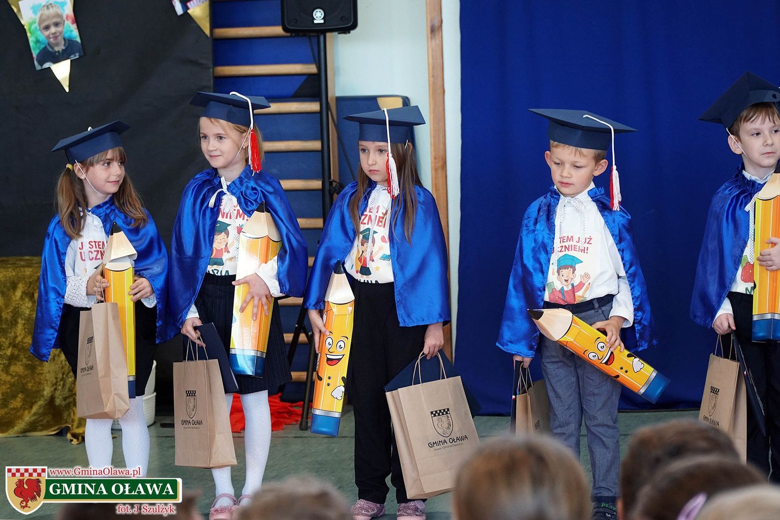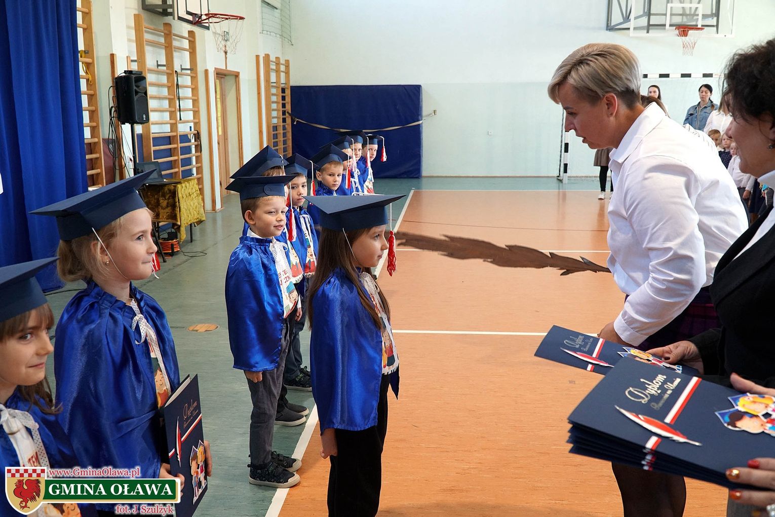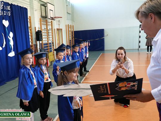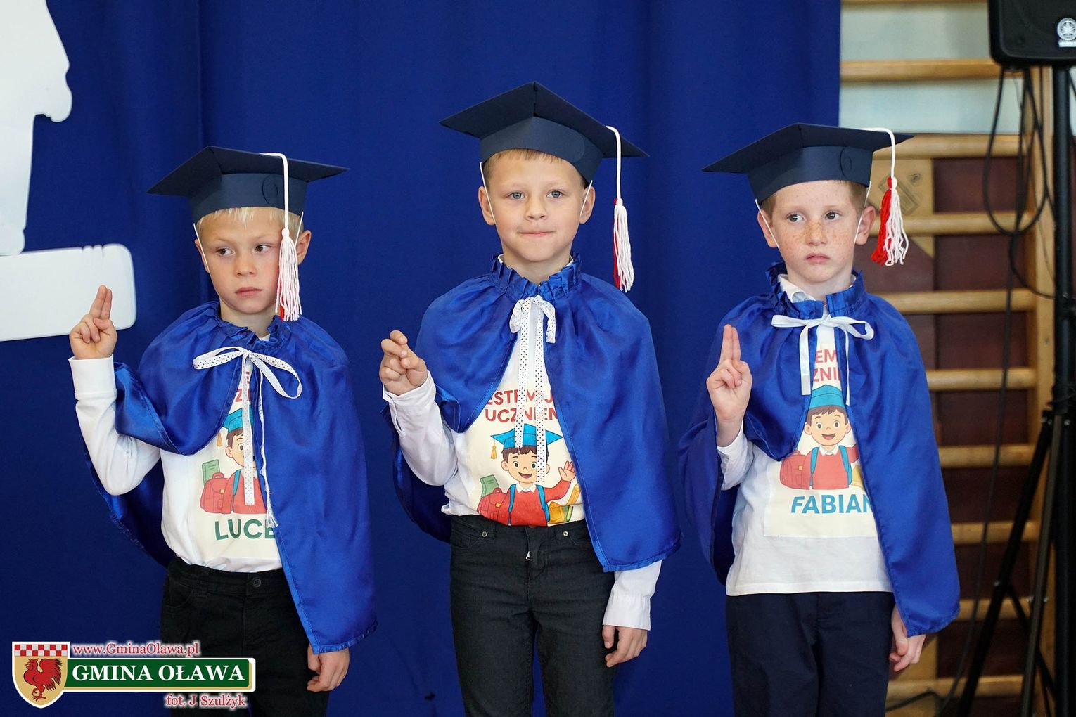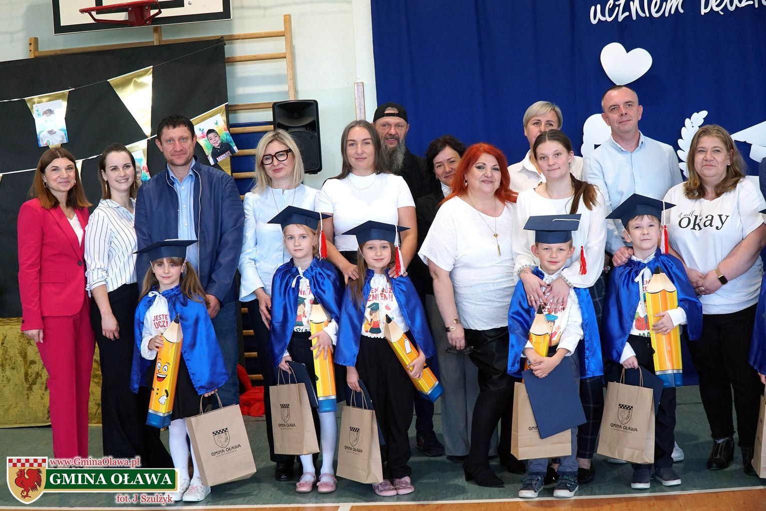 Mimo stresu związanego z pierwszym publicznym występem, uczniowie doskonale sobie poradzili i zaprezentowali swoje talenty wokalne, recytatorskie, muzyczne. Następnie złożyli ślubowanie, a dyrektor szkoły Justyna Kościelna oraz zastępca wójta Helena Masło dokonały uroczystego pasowania na ucznia oraz wręczyły dyplomy i upominki. Na koniec wprowadzono piękny tort, upieczony specjalne na tą okazję i zrobiono pamiątkowe zdjęcia.