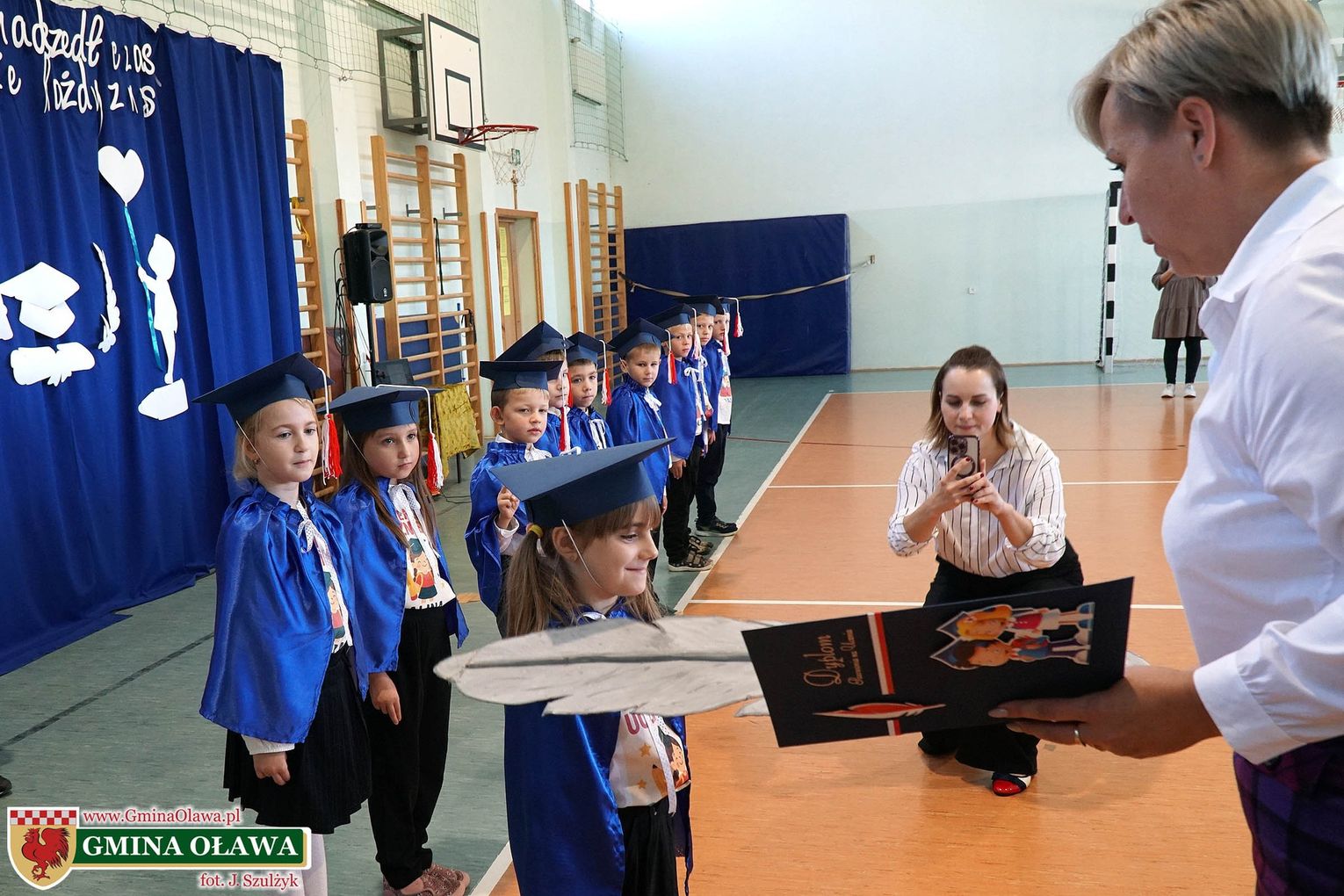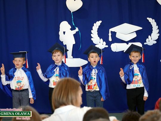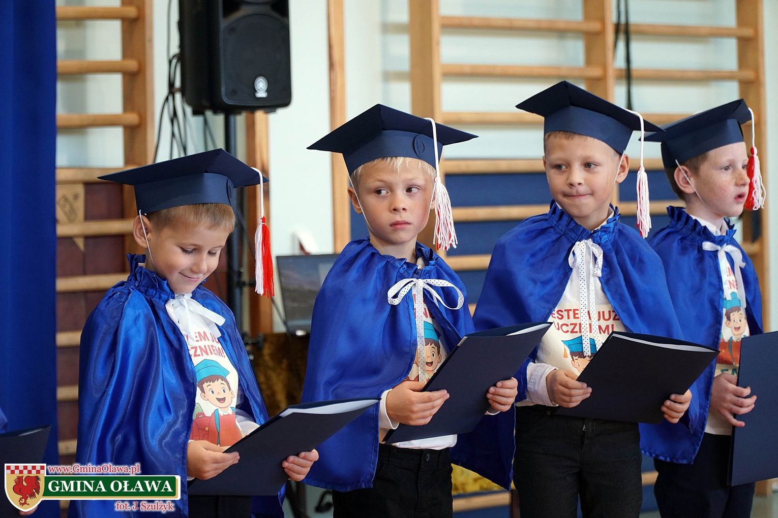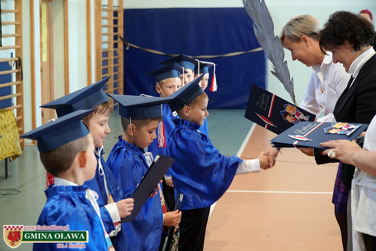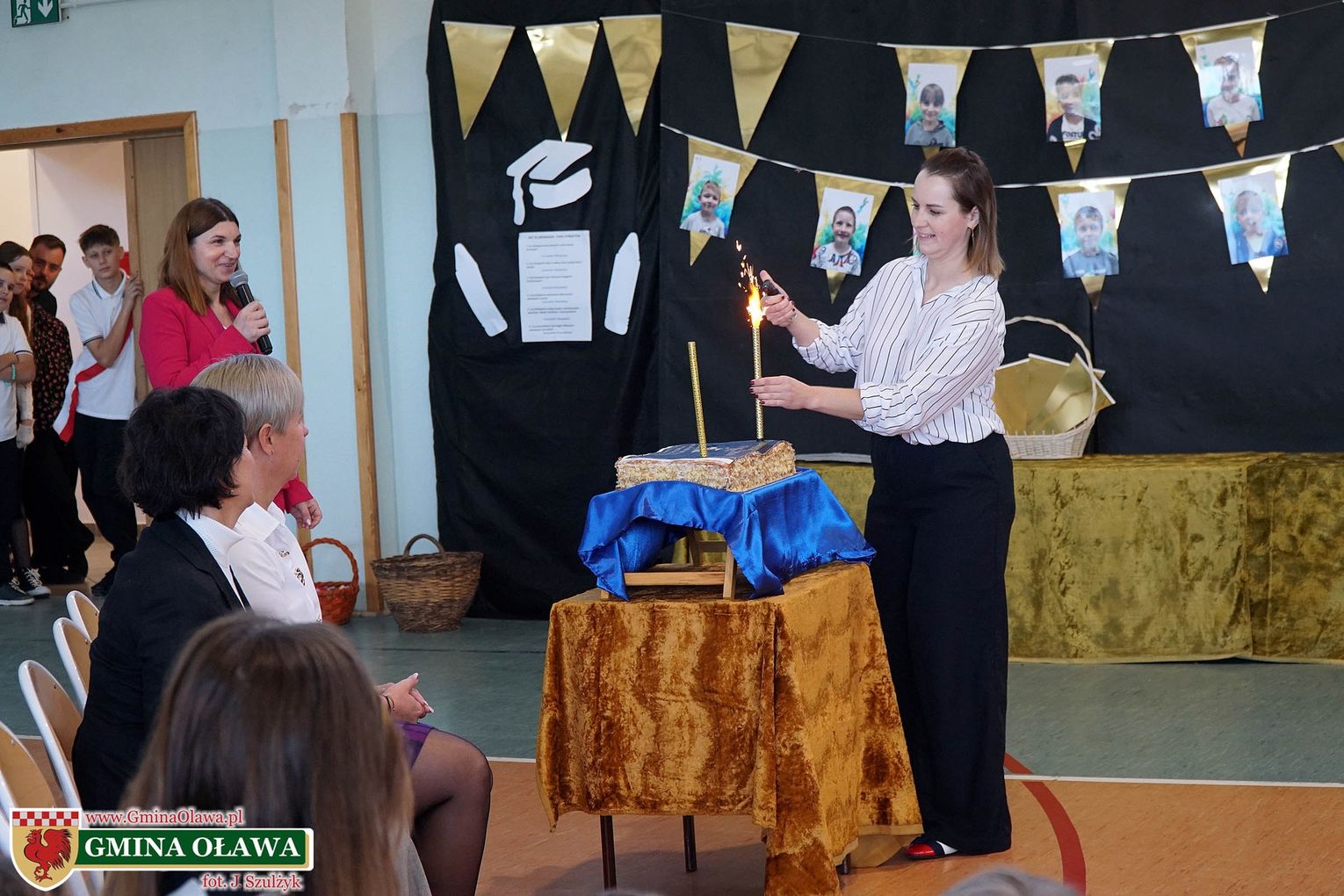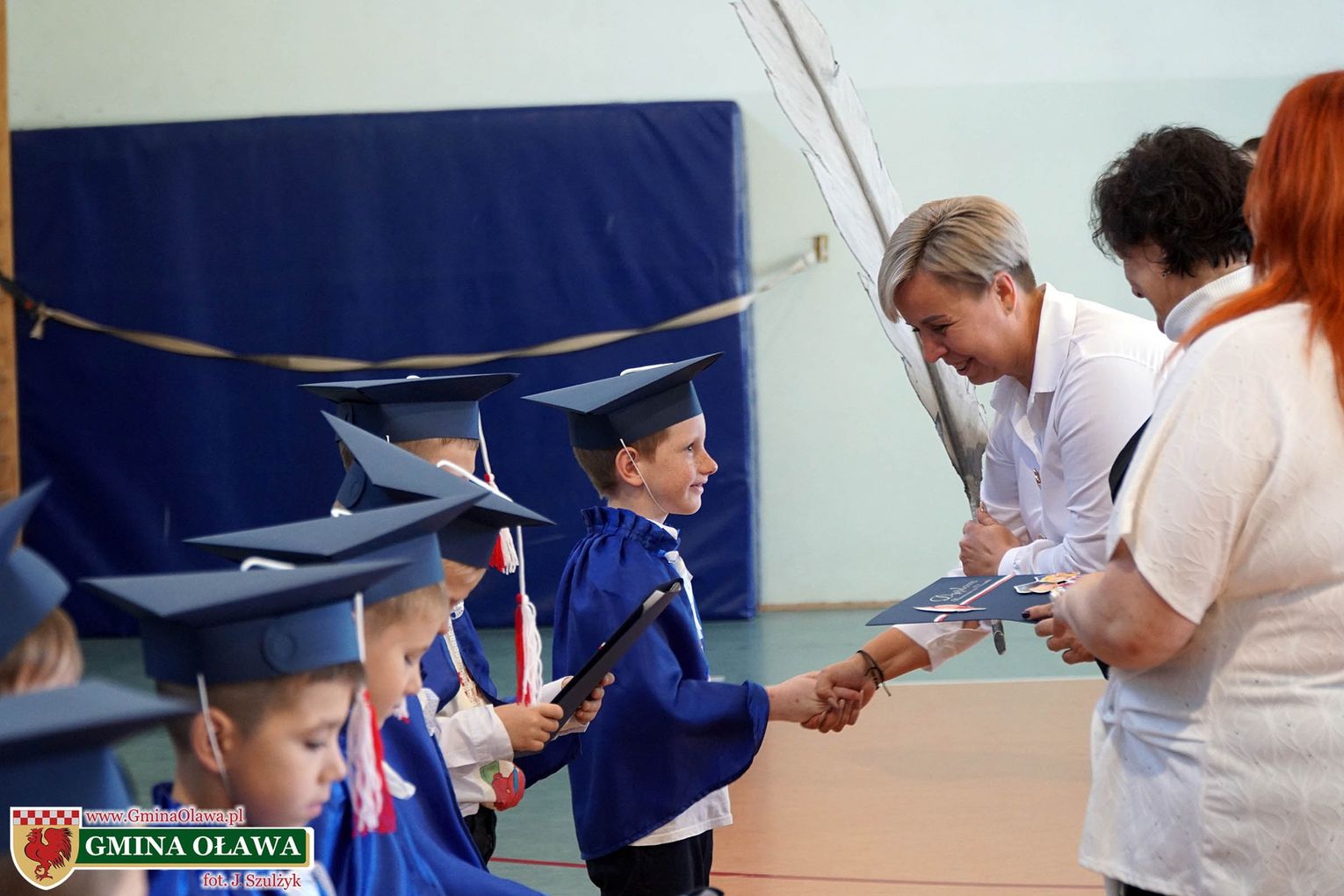 Mimo stresu związanego z pierwszym publicznym występem, uczniowie doskonale sobie poradzili i zaprezentowali swoje talenty wokalne, recytatorskie, muzyczne. Następnie złożyli ślubowanie, a dyrektor szkoły Justyna Kościelna oraz zastępca wójta Helena Masło dokonały uroczystego pasowania na ucznia oraz wręczyły dyplomy i upominki. Na koniec wprowadzono piękny tort, upieczony specjalne na tą okazję i zrobiono pamiątkowe zdjęcia.