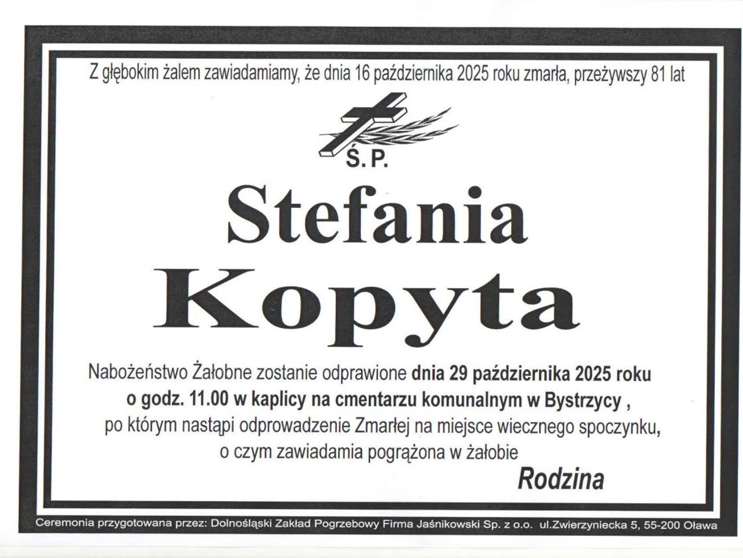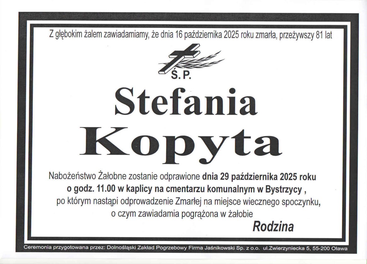 Nabożeństwo żałobne zostanie odprawione 29 października 2025 roku na cmentarzu komunalnym w Bystrzycy, po czym nastąpi odprowadzenie Zmarłej na miejsce wiecznego spoczynku, o czym zawiadamia pogrążona w żałobie
