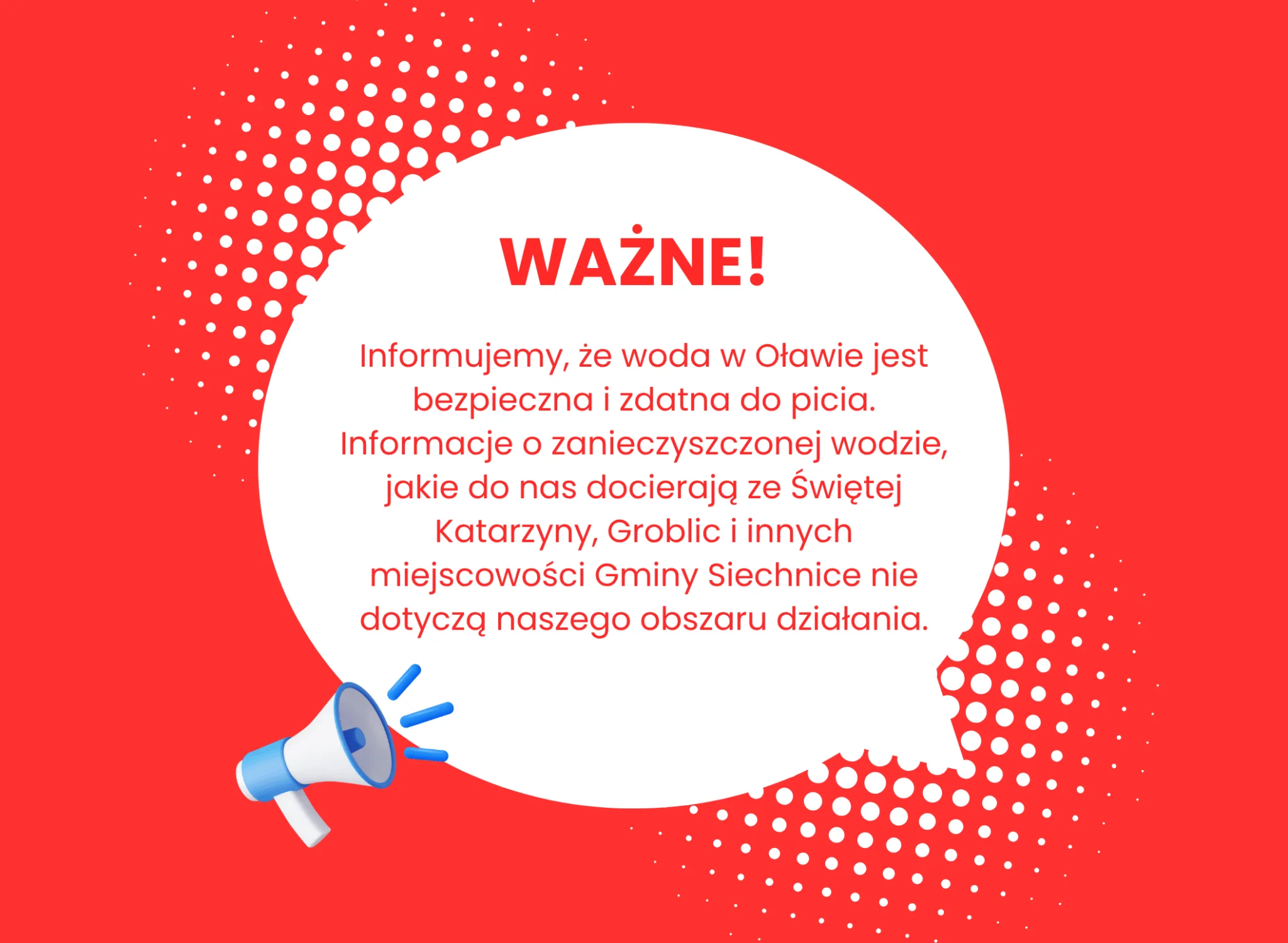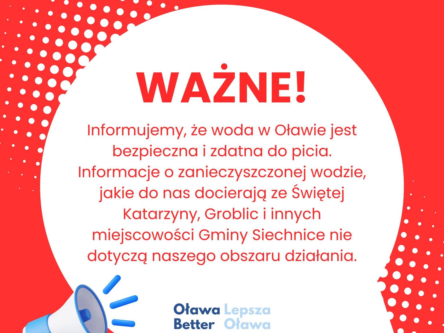Informujemy, że woda w Oławie jest bezpieczna i zdatna do picia. Informacje o zanieczyszczonej wodzie, jakie do nas docierają ze Świętej Katarzyny, Groblic i innych miejscowości Gminy Siechnice nie dotyczą naszego obszaru działania.