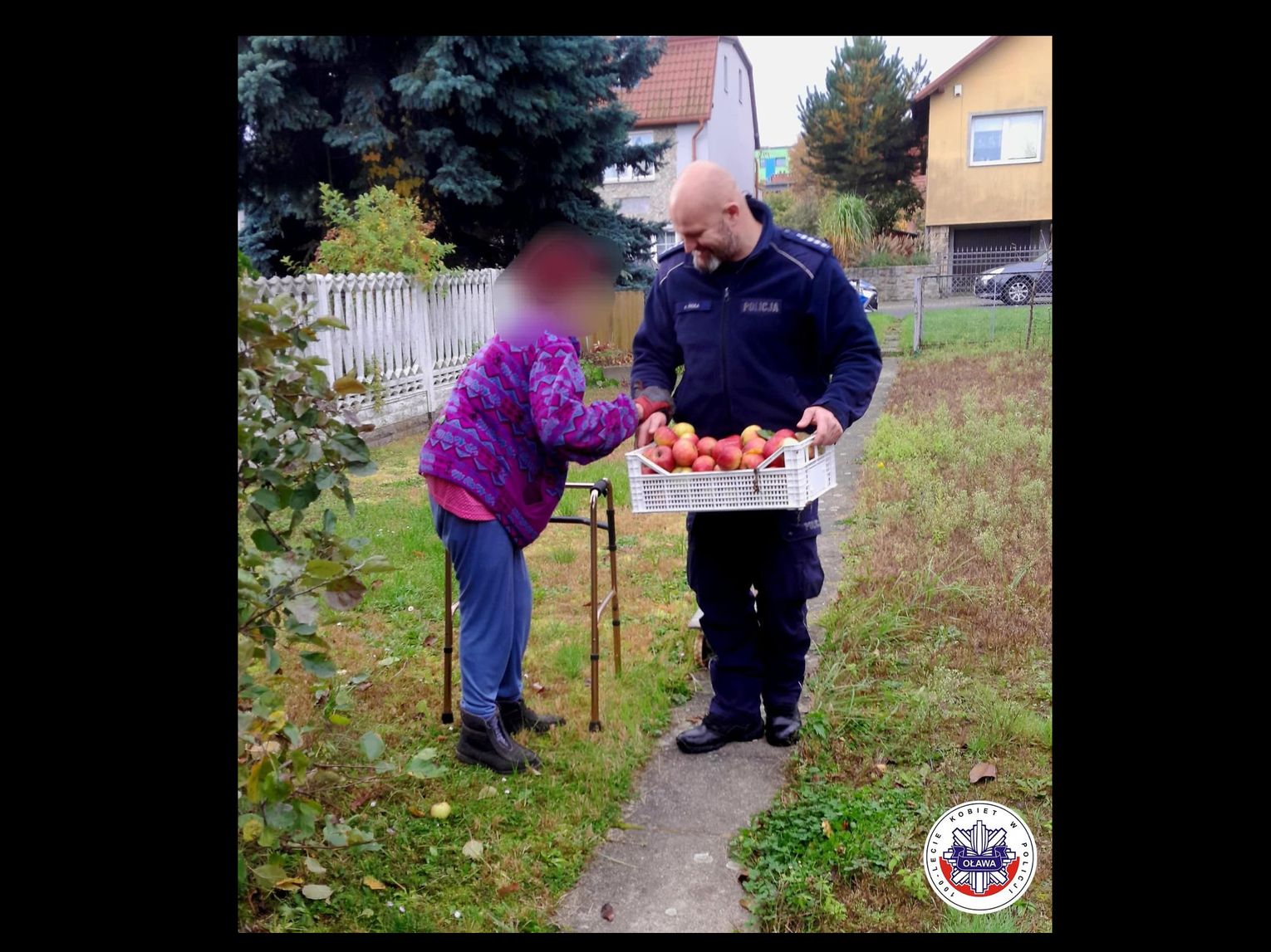 Podczas obchodu swojego rejonu dzielnicowy z Oławy, asp.szt. Krzysztof Pikuła, zauważył starszą panią, która – mimo że poruszała się o balkoniku – zbierała w ogrodzie jabłka. Kobieta, ze względu na swój wiek, miała trudność z przeniesieniem ciężkiej skrzynki do domu. Policjant bez wahania zaoferował pomoc – zaniósł owoce, chwilę porozmawiał i upewnił się, że seniorka czuje się dobrze.