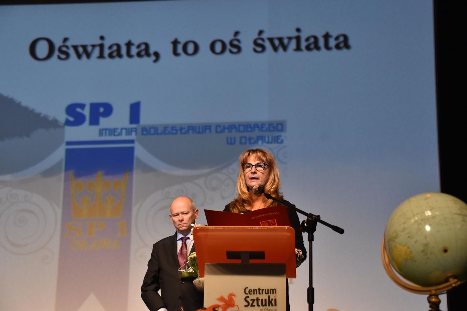 - Szanowni goście, przypadł mi w udziale niebywały zaszczyt bycia gospodarzem tej niezwykłej uroczystości w tym wyjątkowym dniu - mówiła dyrektor Dorota Salimandra-Wołowiec, witając gości na jubileuszu Szkoły Podstawowej nr 1. - Nasza szkołą obchodzi w tym roku dębowy jubileusz. Dziękuję, że jesteście z nami, by uświetnić swoją obecnością tę niezwykłą rocznicę 80-lecia szkoły Podstawowej nr 1 w Oławie i 1000. rocznicę koronacji na króla Polski jej patrona Bolesława Chrobrego. Na podobną kumulację trzeba będzie poczekać całe milenium. Jubileusze są ważne i niezwykle potrzebne. W czasach, gdy żyjemy w zawrotnym tempie, otoczeni natłokiem bodźców i informacji, chwila, kiedy możemy się zatrzymać i spojrzeć wstecz, przynosi możliwość zatopienia się we wspomnieniach. Pozwala na refleksje. Bolesław Prus nazwał rocznice "wzniesieniami w krajobrazie naszego życia". Spojrzenie w przeszłość prowokuje do pochylenia się nad teraźniejszością, ale też do snucia wizji o przyszłości. Zarówno w przeszłości jak i chwili obecnej Jedynka nigdy nie była jedynie miejscem czy instytucją - zawsze była zwarta społecznością, swoistym mikrokosmosem, stworzonym przez pokolenia uczniów, rodziców, nauczycieli, pracowników obsługi, którzy oddali jej swój czas entuzjazm i serce. Do Jedynki się wraca. Jedni wracają jako kadra pedagogiczna, inni jako rodzice przyprowadzają tu swoje dzieci, a jako dziadkowie - wnuki. Wokół naszej placówki zawsze gromadziły się osoby twórcze, kreatywne, poszukujące najlepszych rozwiązań oraz otwarte i wrażliwe na potrzeby dzieci. Długa jest lista, tych którzy na trwałe zaznaczyli swoją obecność w historii naszej szkoły. Wielu z nich dzisiaj tutaj nie ma, jednak pozostawili po sobie niezatarty ślad swojego istnienia.