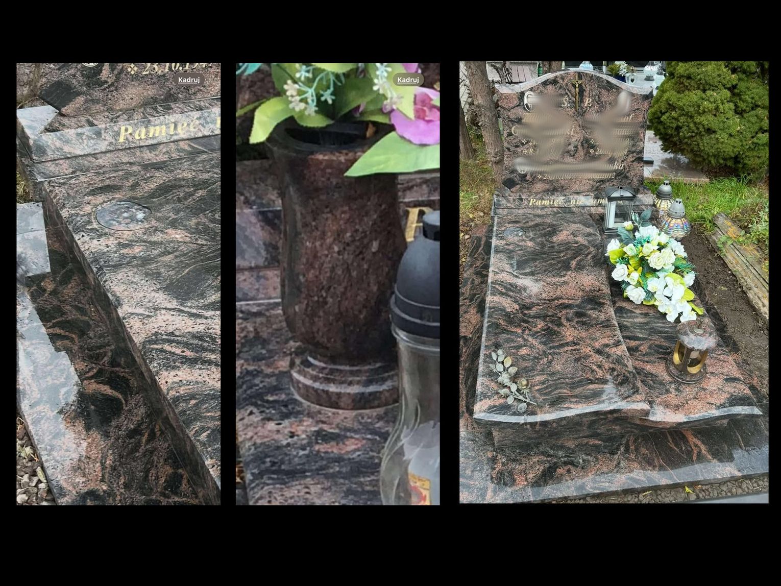 - Skradziono mi z pomnika rodziców i szwagra wazon z kamienia w kolorze pomnika (przymocowany oryginalnie i zamawiany w komplecie razem z pomnikiem) - opisuje mieszkanka Oławy. - Może komuś proponowano sprzedaż takiego kamiennego wazonu albo ktoś zobaczy gdzieś na jakimś grobie, to pojadę zobaczyć. Wazon i pomnik są ze specyficznego koloru i wzoru kamienia, więc się wyróżniają. Mało jest w tym kolorze i wzorze pomników, stąd rzuca się w oczy. Bardzo proszę o wszelkie informacje i udostępnianie. Pomnik najważniejszych dla mnie osób bez tego wazonu już nie jest taki sam. Wszystko zamawiane w komplecie kilka lat temu i zależy mi na tym, żeby go odzyskać, bo nie wiem, czy po tylu latach uda mi się dokładnie taki sam zamówić, żeby pasował do reszty. Załączam kilka zdjęć wazonu i pomnika oraz zdjęcia z wczoraj tego, co po nim zostało. Będę wdzięczna za każdą informację. Kontakt przez messenger lub nr 664996633.