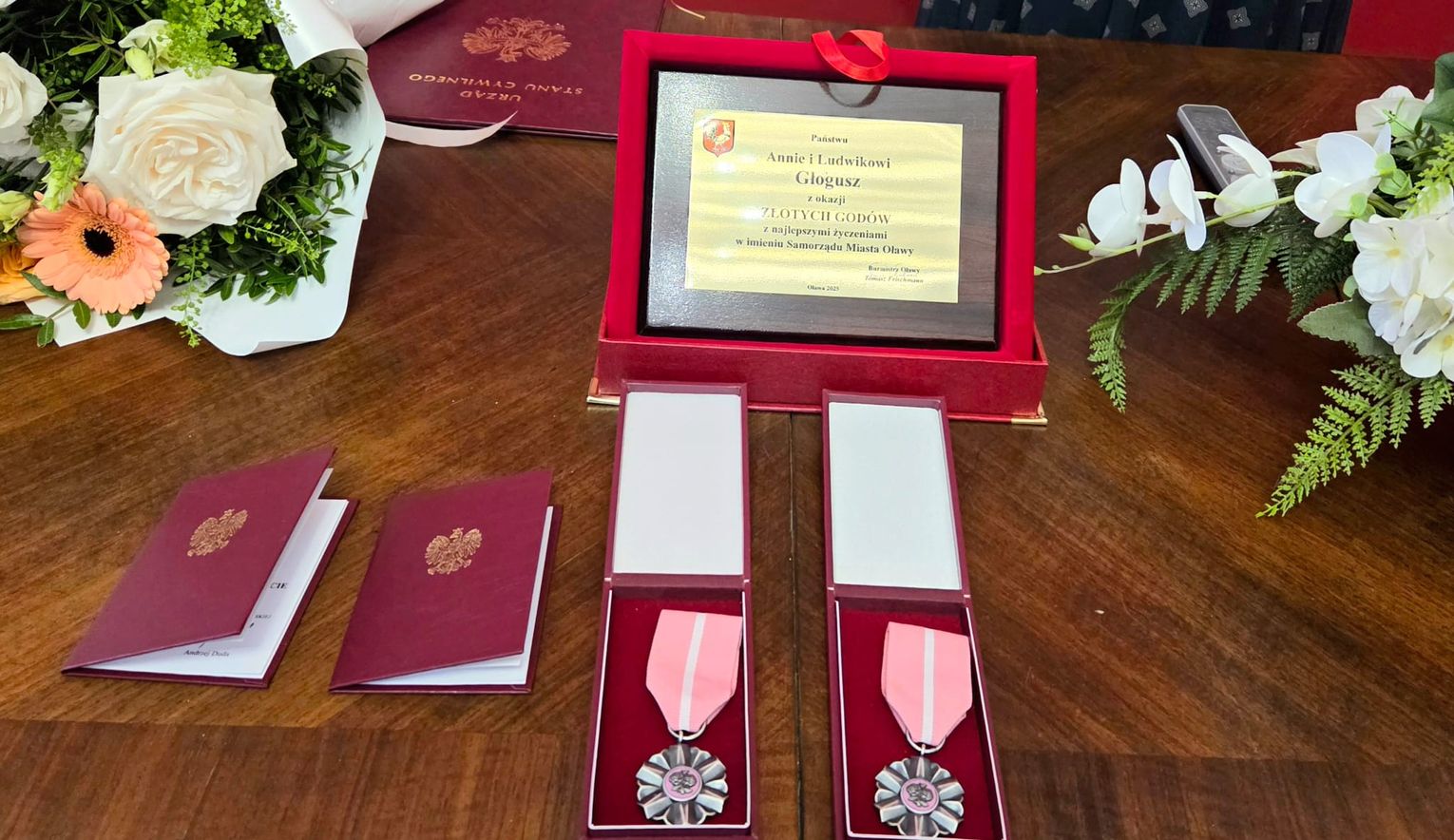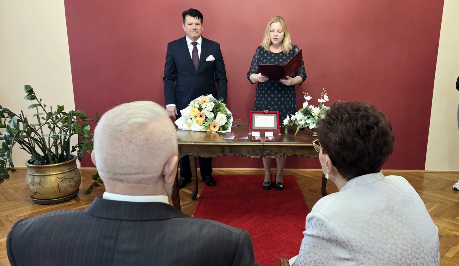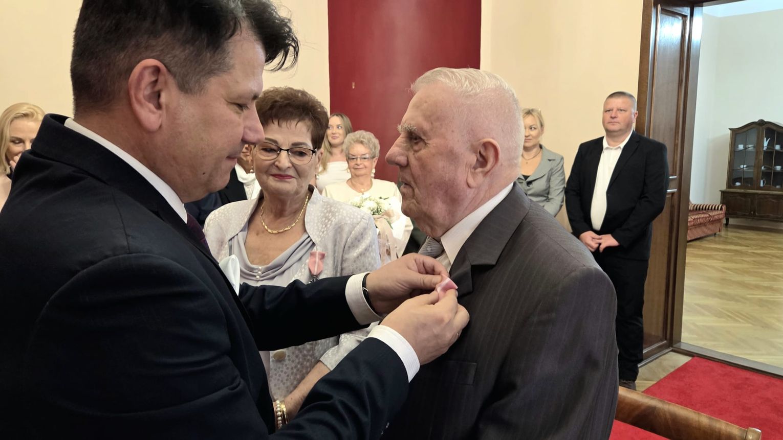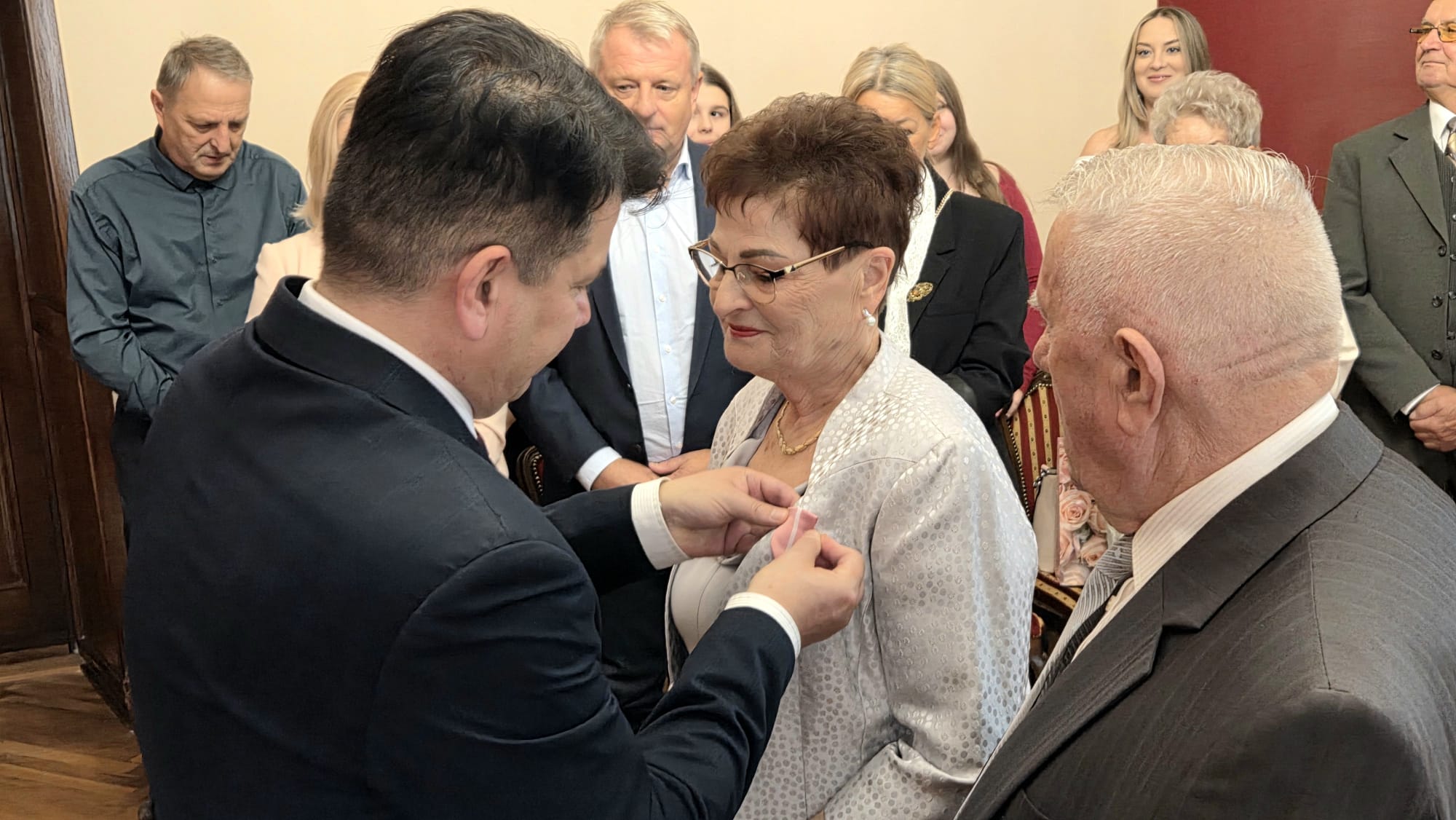 W imieniu Prezydenta RP medale jubilatom wręczył burmistrz Oławy Tomasz Frischmann, który jako pierwszy pogratulował też małżonkom i przekazał życzenia dalszych lat szczęścia. W imieniu swoim oraz lokalnej społeczności przekazał też bukiet kwiatów i okolicznościowy grawerton.