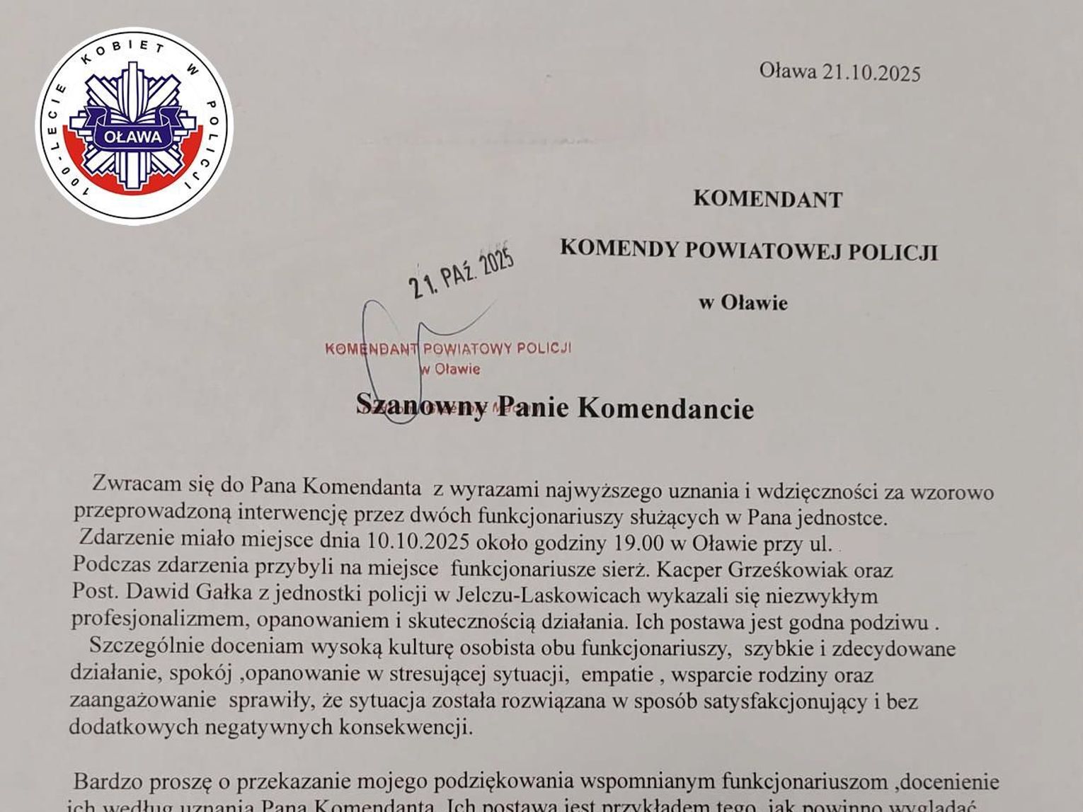 Kobieta przekazała słowa uznania dla policjantów z Ogniwa Patrolowo–Interwencyjnego Komisariatu Policji w Jelczu-Laskowicach – sierż. Kacpra Grześkowiaka oraz post. Dawida Gałka, doceniając ich profesjonalizm, empatię i wsparcie okazane podczas interwencji.