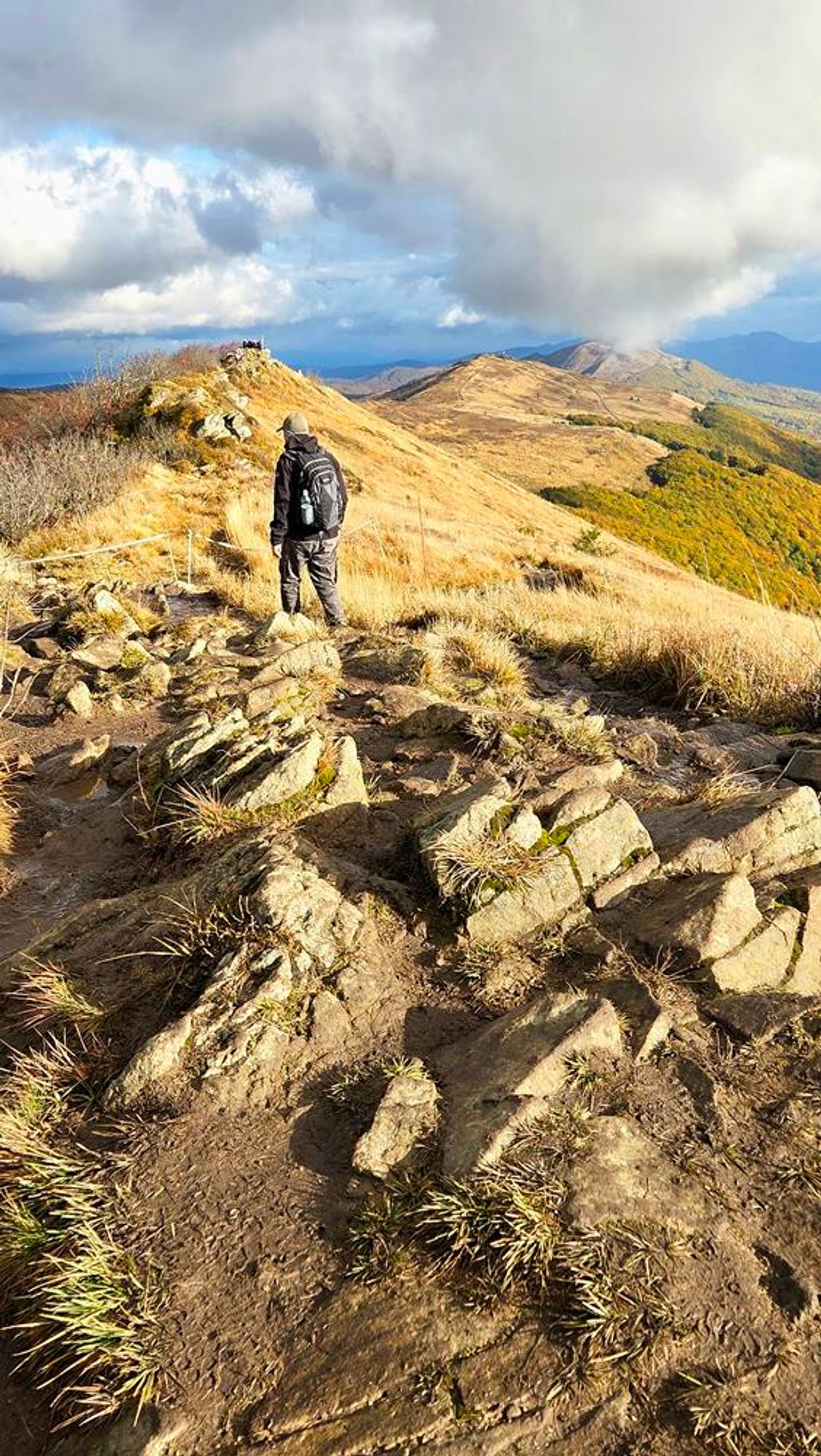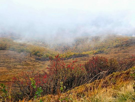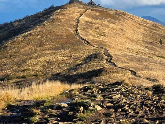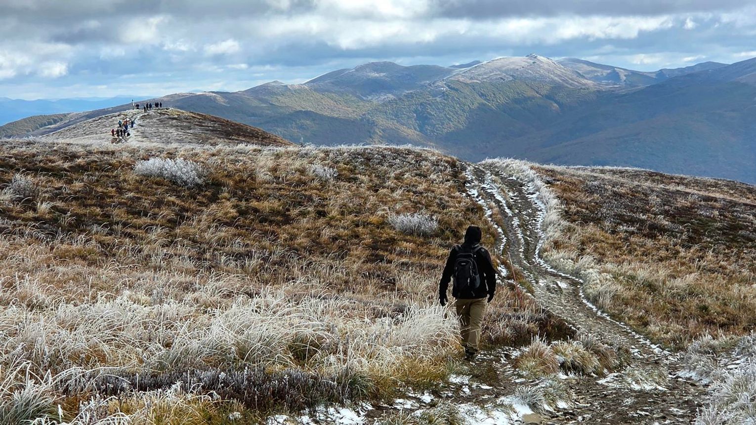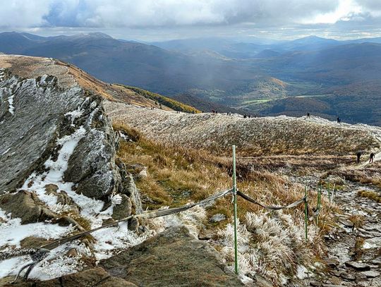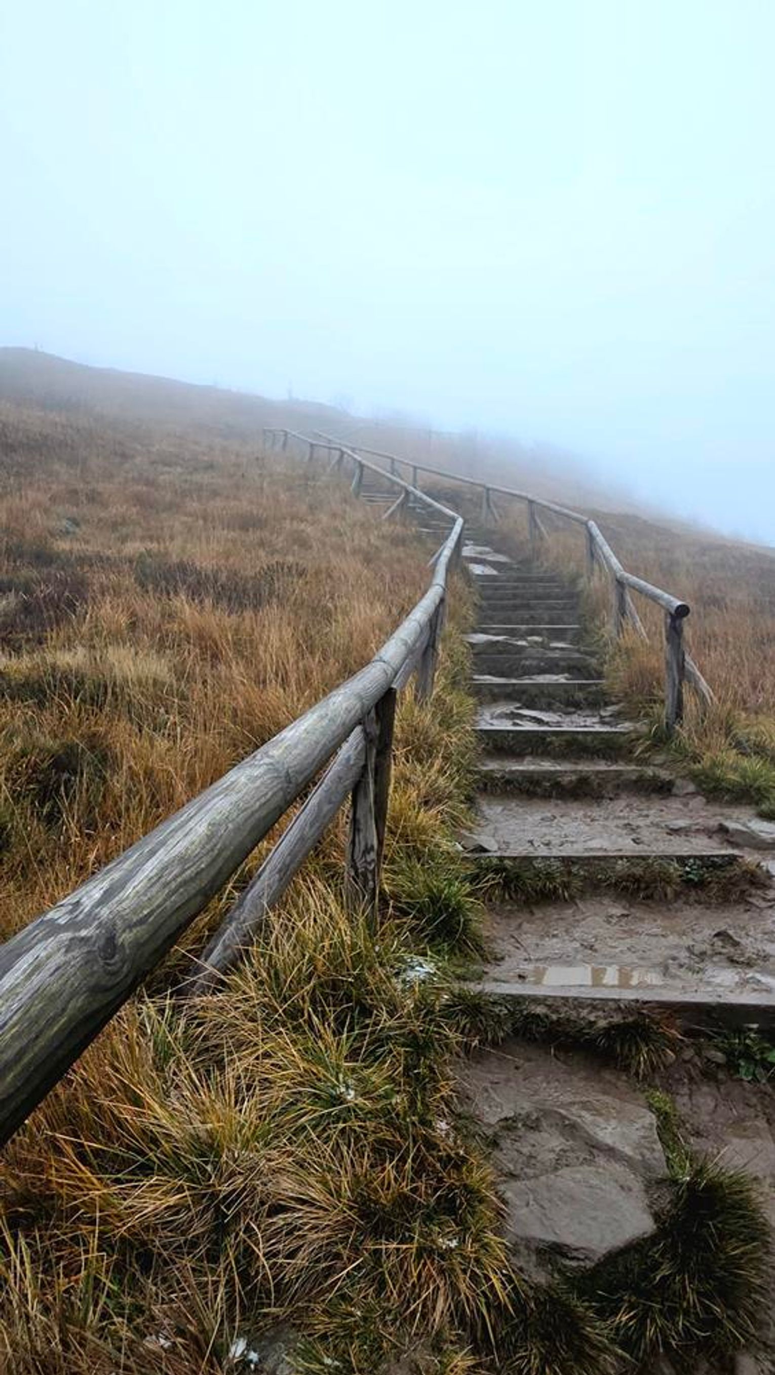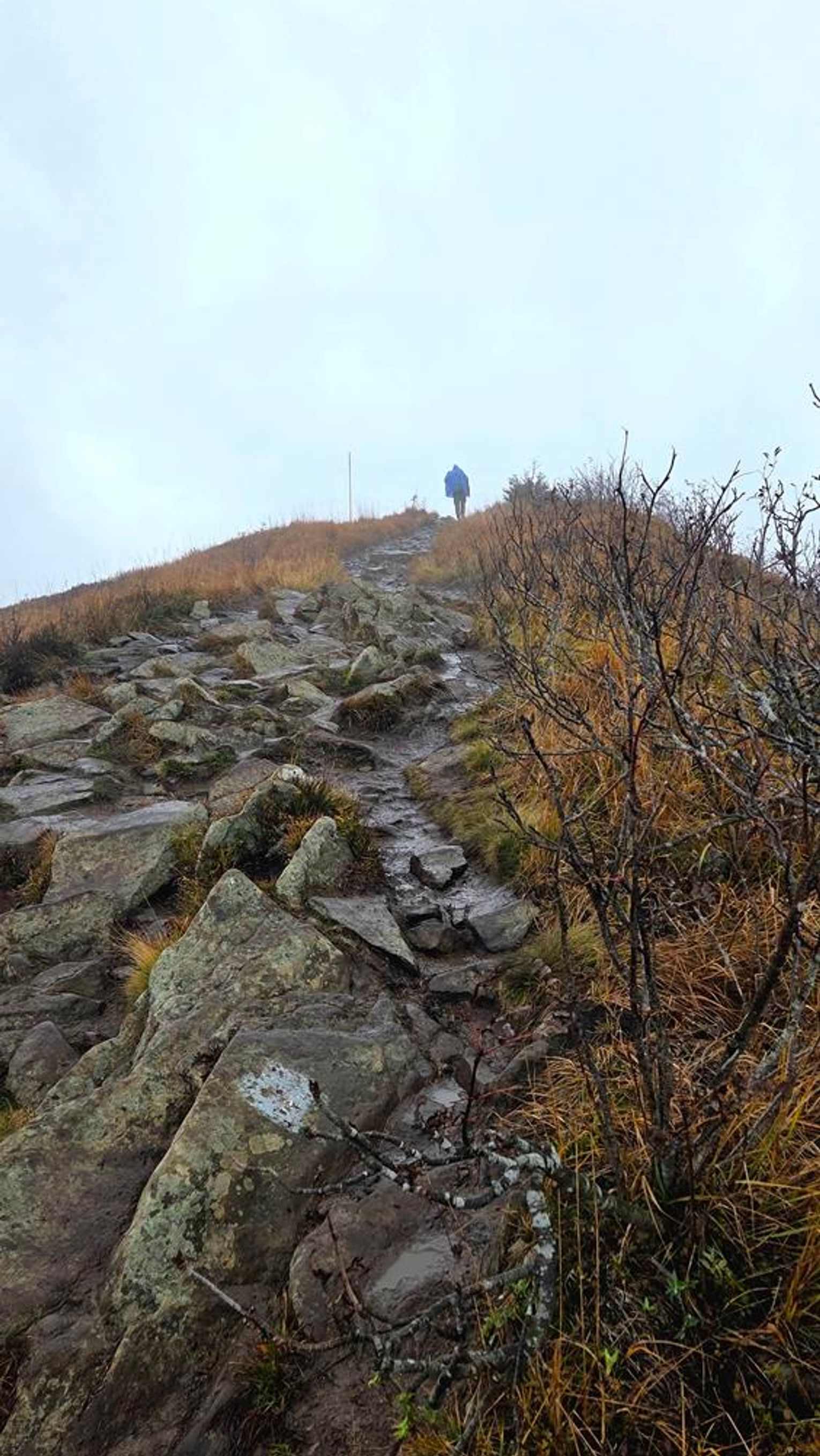 Na rozgrzewkę Połonina Wetlińska i Chatka Puchatka. Wyruszyłam rano i już po kilkunastu metrach dopadał mnie deszcz, który dalej przekształcił się w krupy śniegu. Z każdym kolejnym krokiem nasilał się też wiatr. Chmury zasłaniały wszystko. Kilka razy zastanawiałam się, czy zawrócić, zwłaszcza że błoto na trasie nie ułatwiało wędrówki. Z prognozy pogody wynikało jednak, że pogoda się zmieni. Będzie kilkugodzinne okienko pogodowe, więc... skoro już wyszłam na szlak, a wraz ze mną gro innych ludzi, którzy twardo parli do góry, uznałam, że może jednak ja też się nie poddam. I - kolejny raz powtórzę - było warto. Chmury i śnieg towarzyszyły mi do schroniska Chatka Puchatka. Po około godzinie spędzonej tam wraz z tłumem innych oczekujących na poprawę pogody, naszym oczom ukazała się Połonina Wetlińska. W pełnej okazałości, z odległym horyzontem, tylko miejscami poprzecinana cienkimi chmurami łączącymi kolorowe górskie zbocza z błękitnym niebem. Niezapomniany widok i to dziwne uczucie wszechogarniającego spokoju. Każdy kolejny krok po połoninie był więc już tylko przyjemnością.