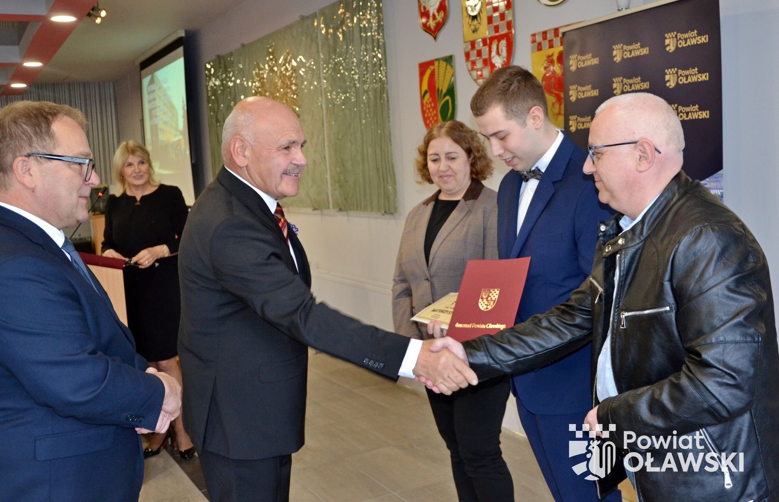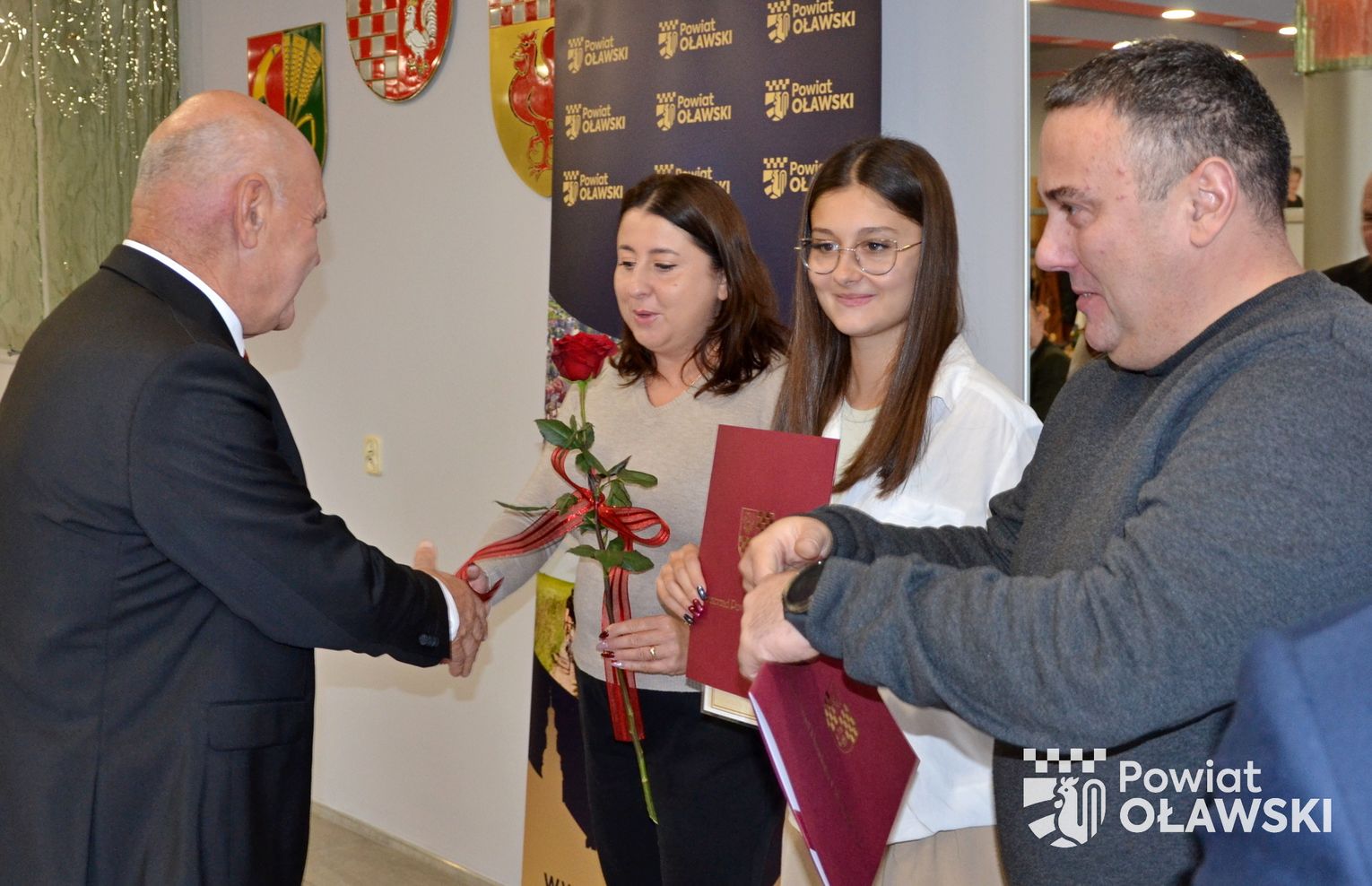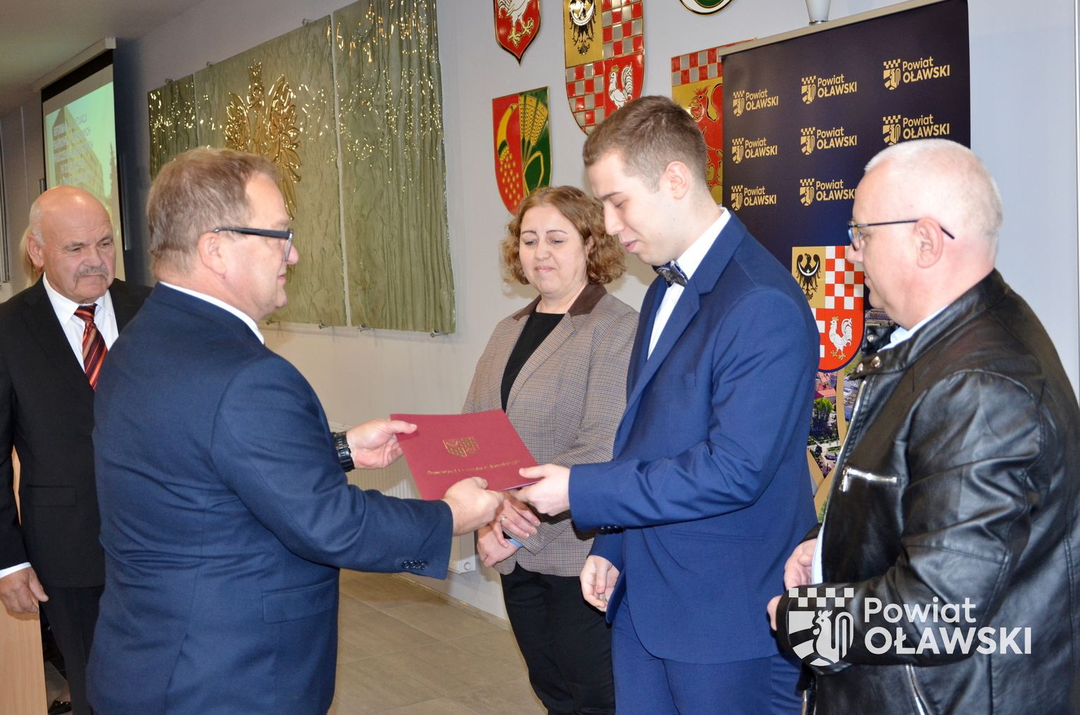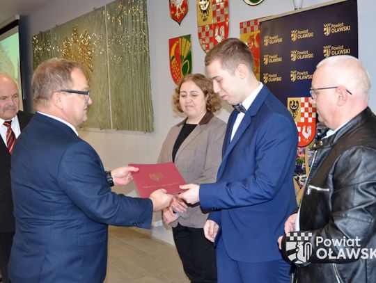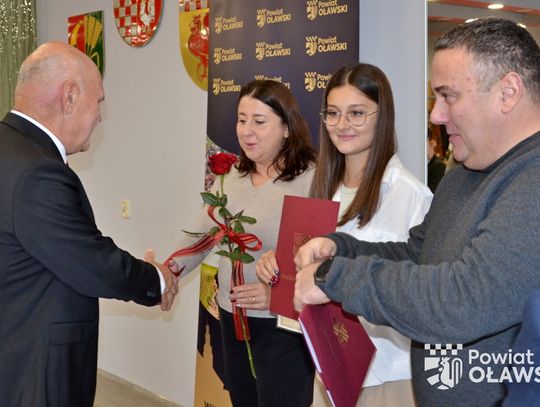 Listy gratulacyjne i nagrody, wręczyli uczniom w obecności radnych, Marek Szponar - Starosta Oławski oraz przewodniczący Rady Powiatu Józef Hołyński. Przedstawiciele samorządu powiatowego pogratulowali zaproszonym na sesję rodzicom wyróżnionych uczniów i podziękowali za trud wychowawczy, który zaprocentował takimi wspaniałymi rezultatami.