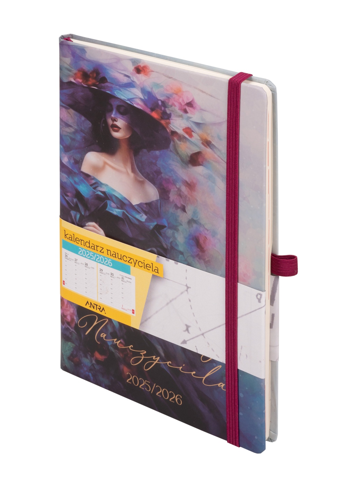 Jeśli szukasz modelu, który będzie zachwycał swoją unikalną, artystyczną prezencją, zdecydowanie warto wybrać kalendarz TDW Kobieta. Format A5 to jeden z najbardziej popularnych, najwygodniejszych. Zmieści się do każdej nauczycielskiej teczki czy torebki. Wnętrze kalendarza zostało specjalnie zaprojektowane z myślą o wykonywaniu zawodu nauczyciela. Dodatkowo dostępny jest także tygodniowy podgląd, miejsce na własne notatki, a także koperta, w której można przechowywać różne ważne dokumenty. Kalendarz zamykany jest na pionową gumkę w kolorze bordo. Na szczególną uwagę zasługuje wyjątkowa okładka, na której znajduje się artystyczny portret kobiety w sukni i kapeluszu oplecionej kwiatami.