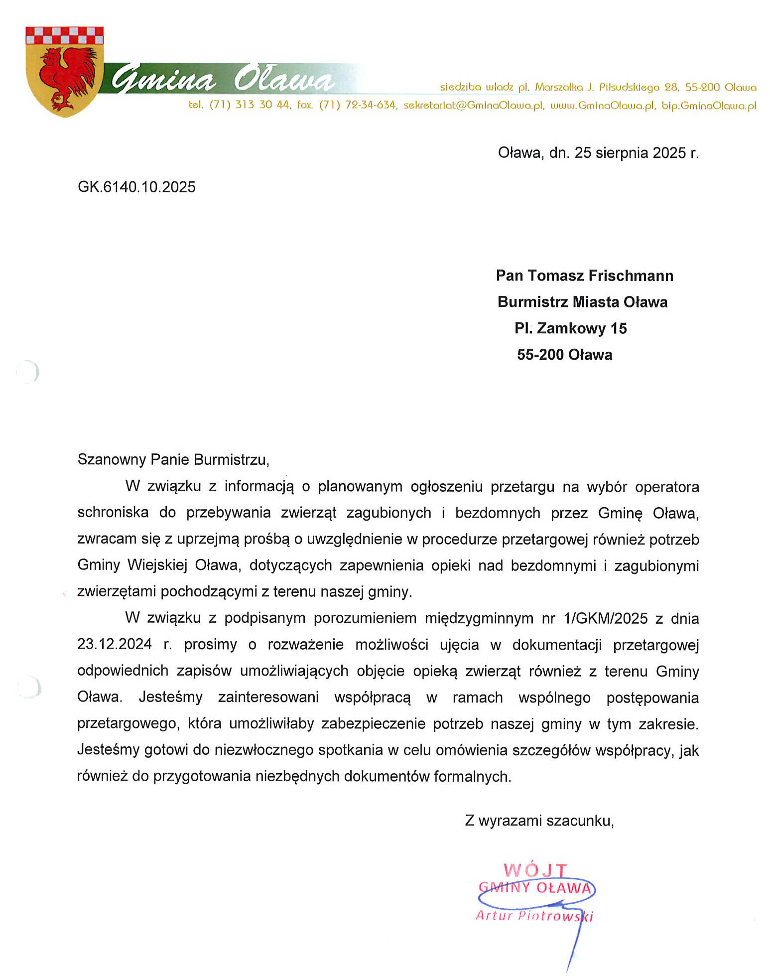 W trosce o dobro zwierząt Wójt Gminy Oława wystosował do Burmistrza Miasta Oława pismo z prośbą o uwzględnienie Gminy Oława w procedurze przetargowej, aby umożliwić kontynuowanie dotychczasowego systemu opieki nad zwierzętami w schronisku w Oławie (pismo w załączeniu). Z uwagi na brak odpowiedzi ze strony Burmistrza, mimo wielu monitów ze strony władz Gminy, a także w związku z koniecznością zapewnienia ciągłości opieki nad bezdomnymi zwierzętami, Wójt Gminy Oława ogłosił zapytanie ofertowe na świadczenie usług opieki nad bezdomnymi zwierzętami do końca 2025 roku.