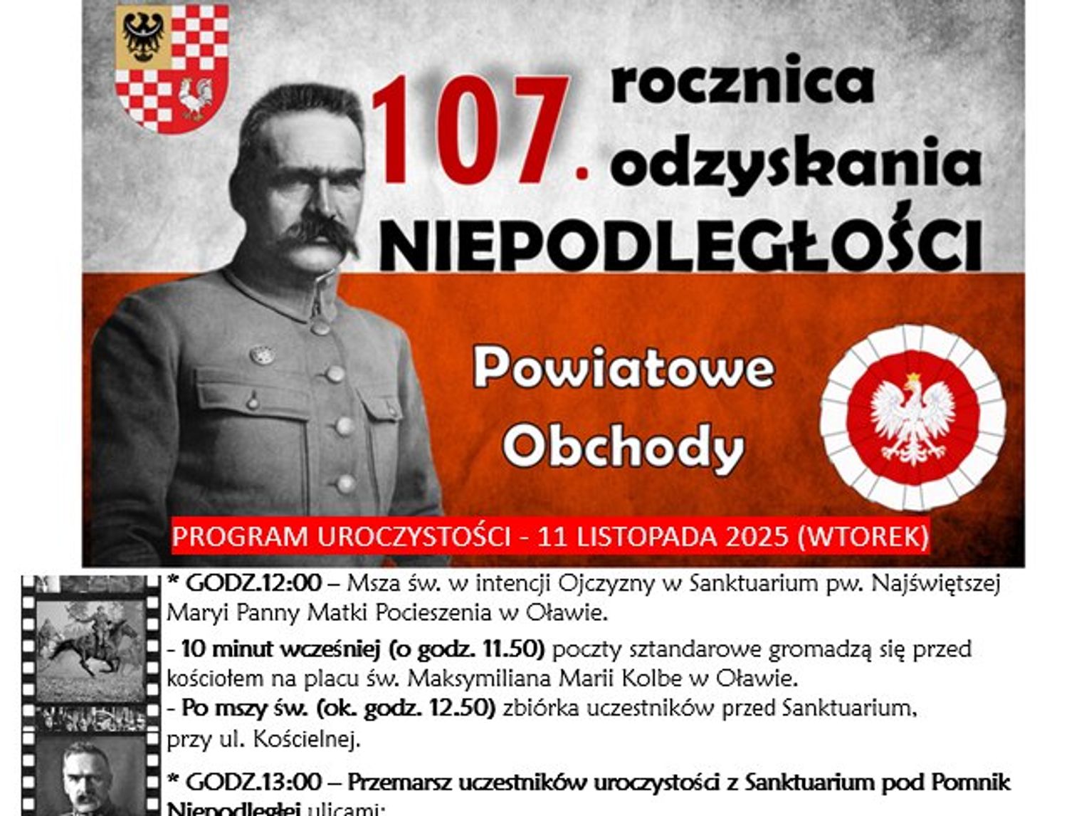 Mszą Świętą w Sanktuarium pw. Najświętszej Maryi Panny Matki Pocieszenia, przemarszem ulicami miasta oraz złożeniem kwiatów pod Pomnikiem Niepodległej, u zbiegu ulic 1 Maja i Spacerowej, gdzie odbędą się główne obchody, mieszkańcy powiatu oławskiego uczczą wtorek 11 listopada bliskie sercu każdego Polaka Narodowe Święto Niepodległości.