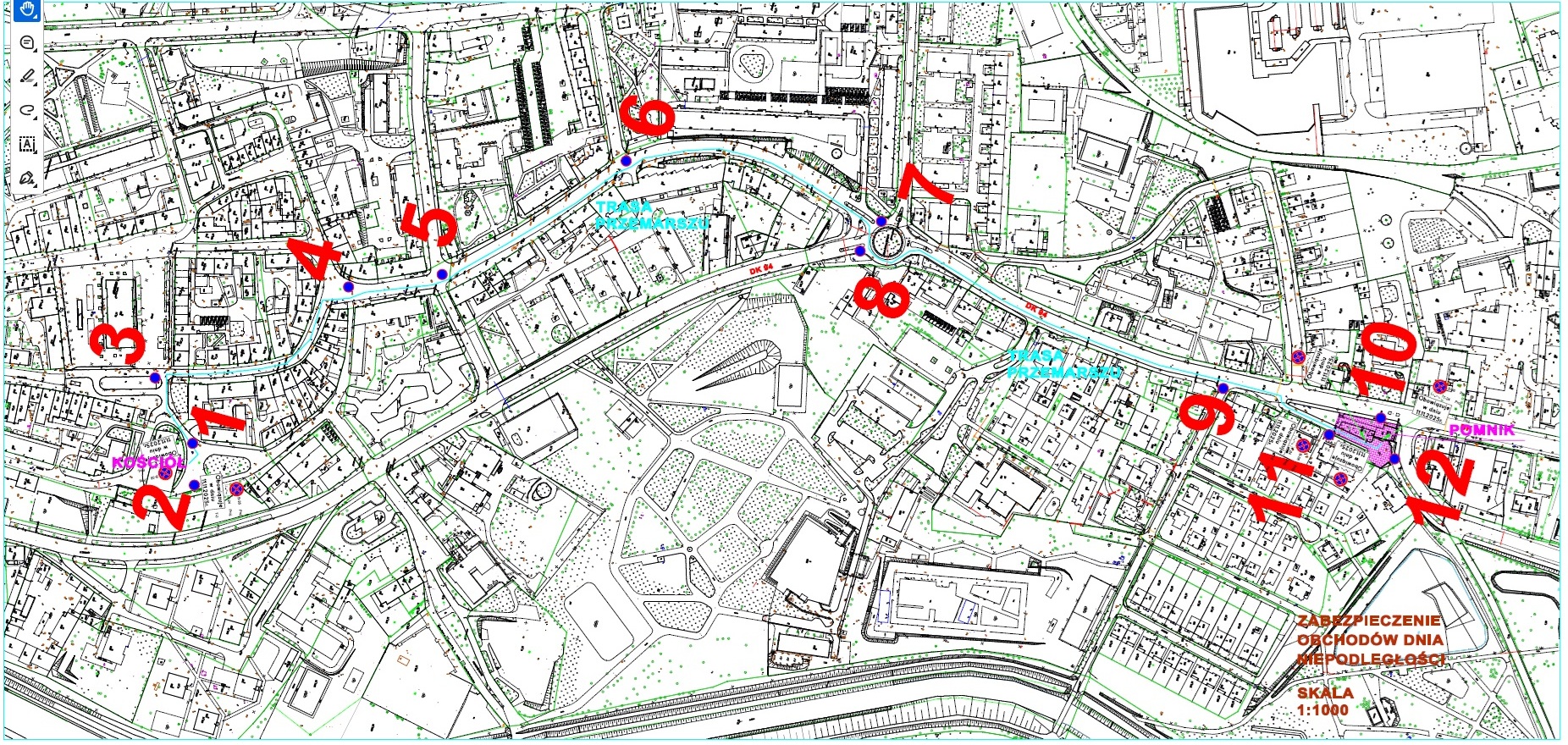 - Kościelną, - Brzeską, - 1 Maja, - przez Rondo Żołnierzy Wyklętych, - a następnie wzdłuż Drogi Krajowej 94 - do skrzyżowania ulic 1 Maja i Spacerowej, na plac przed pomnikiem, gdzie odbędą się główne uroczystości.