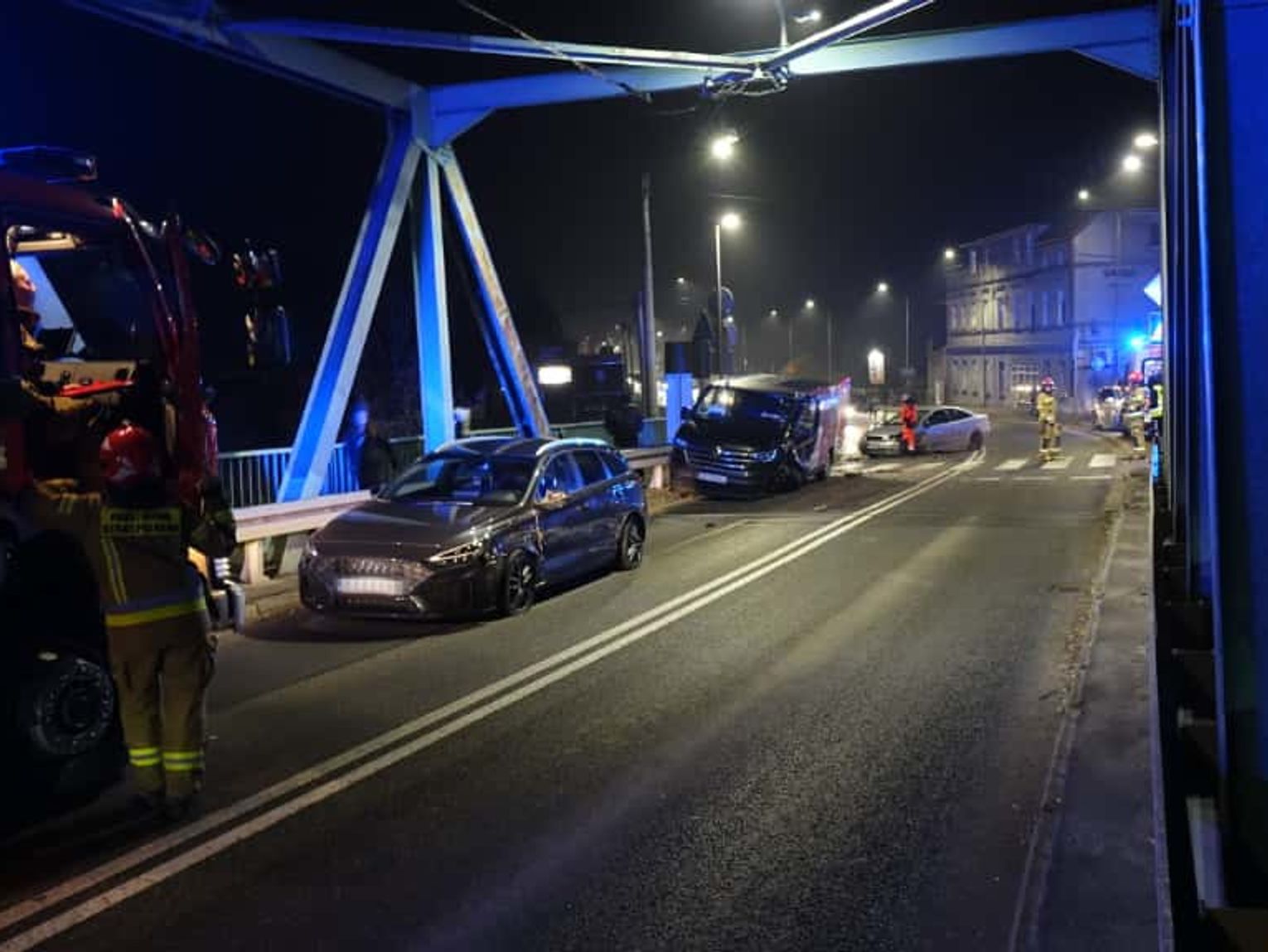 43-letni mieszkaniec powiatu oławskiego jadący srebrnym oplem astrą na opolskich numerach z kierunku Oławy przez most na Odrze nie zachował należytej ostrożności i po drodze zahaczył dwa samochody wjeżdżające na most z przeciwnej strony (jeden na oławskich numerach, drugi na opolskich). W wyniku zderzenia srebrne auto obróciło w drugą stronę. Patrząc na uszkodzenia wszystkich aut biorących udział w zdarzeniu, widać że siła uderzenia musiała być znaczna.