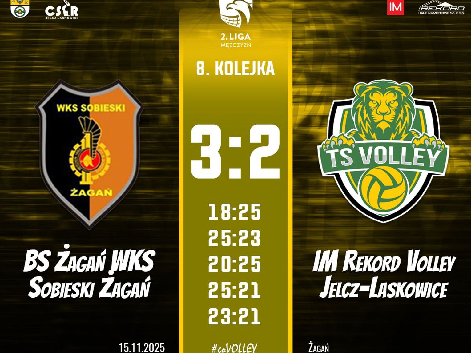 We mediach społecznościowych IM Rekord Volley Jelcz-Laskowice czytamy: Po wielkich emocjach ulegamy zespołowi BS ŻAGAŃ WKS Sobieski Żagań 2:3. To było kolejne długie i ciężkie spotkanie. Tym razem ostatnia piłka i zwycięstwo należały jednak do rywali, którym gratulujemy wygranej. Spotkanie obfitowało w wielkie emocje, a ich kulminacją był tie-break. Mimo piłek meczowych dla Jelczańskich Lwów lepsi okazali się rywale. Dziękujemy za doping kibicom, którzy licznie dopingowali nas z trybun w dalekim Żaganiu. A naszym siatkarzom dziękujemy za walkę do ostatniej piłki.