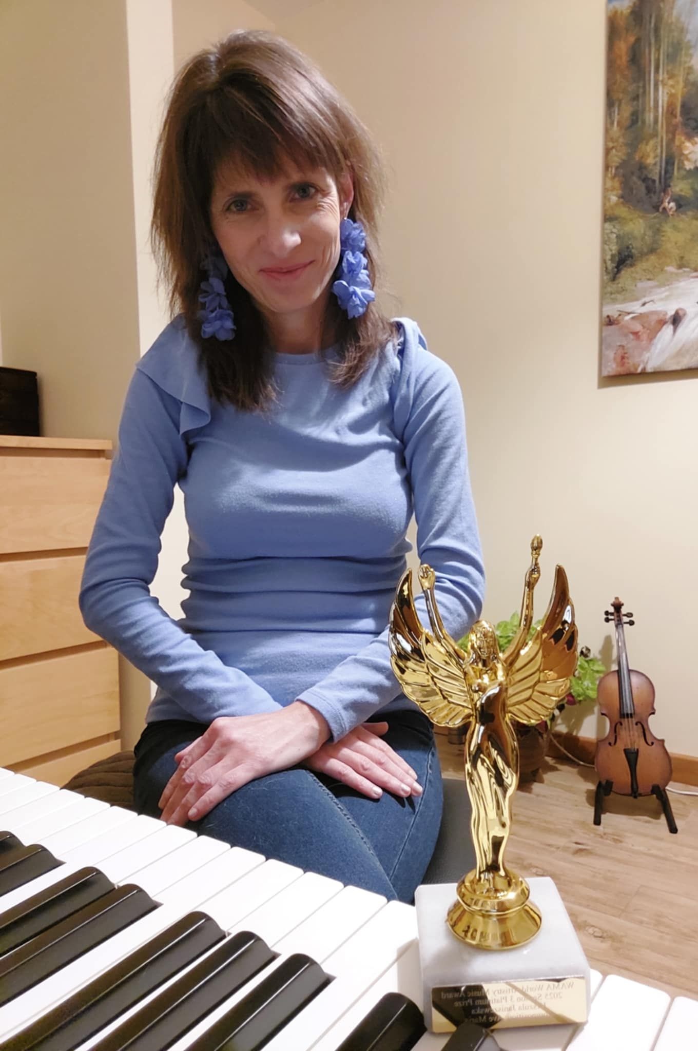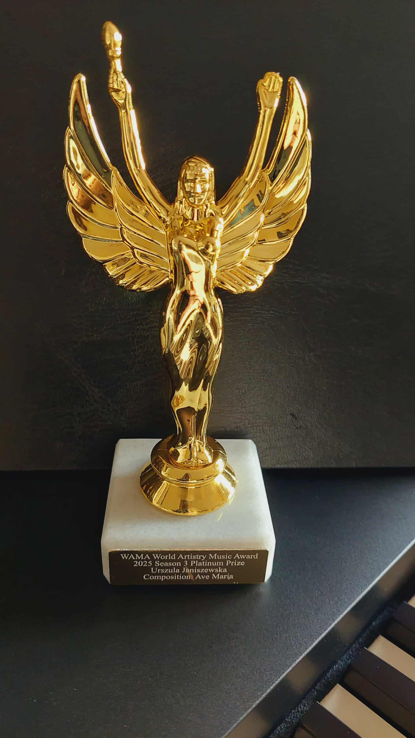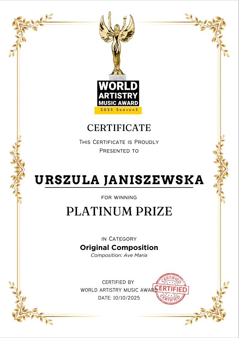 Urszula Janiszewska to kompozytorka, pianistka i skrzypaczka, która za swoje kompozycje zdobyła już ponad 70 nagród na międzynarodowych konkursach muzycznych. Ostatnia kompozycja "Ave Maria" zyskała już 3 nagrody na międzynarodowych konkursach: PLATYNA na World Artistry Music Award, I MIEJSCE na Beethoven International Music Competition, I MIEJSCE w ramach Concours International de Musique Jean-Philippe Rameau. Dodatkowo kompozytorka za wspomniany utwór otrzymała statuetkę, która dotarła z samego Londynu.
