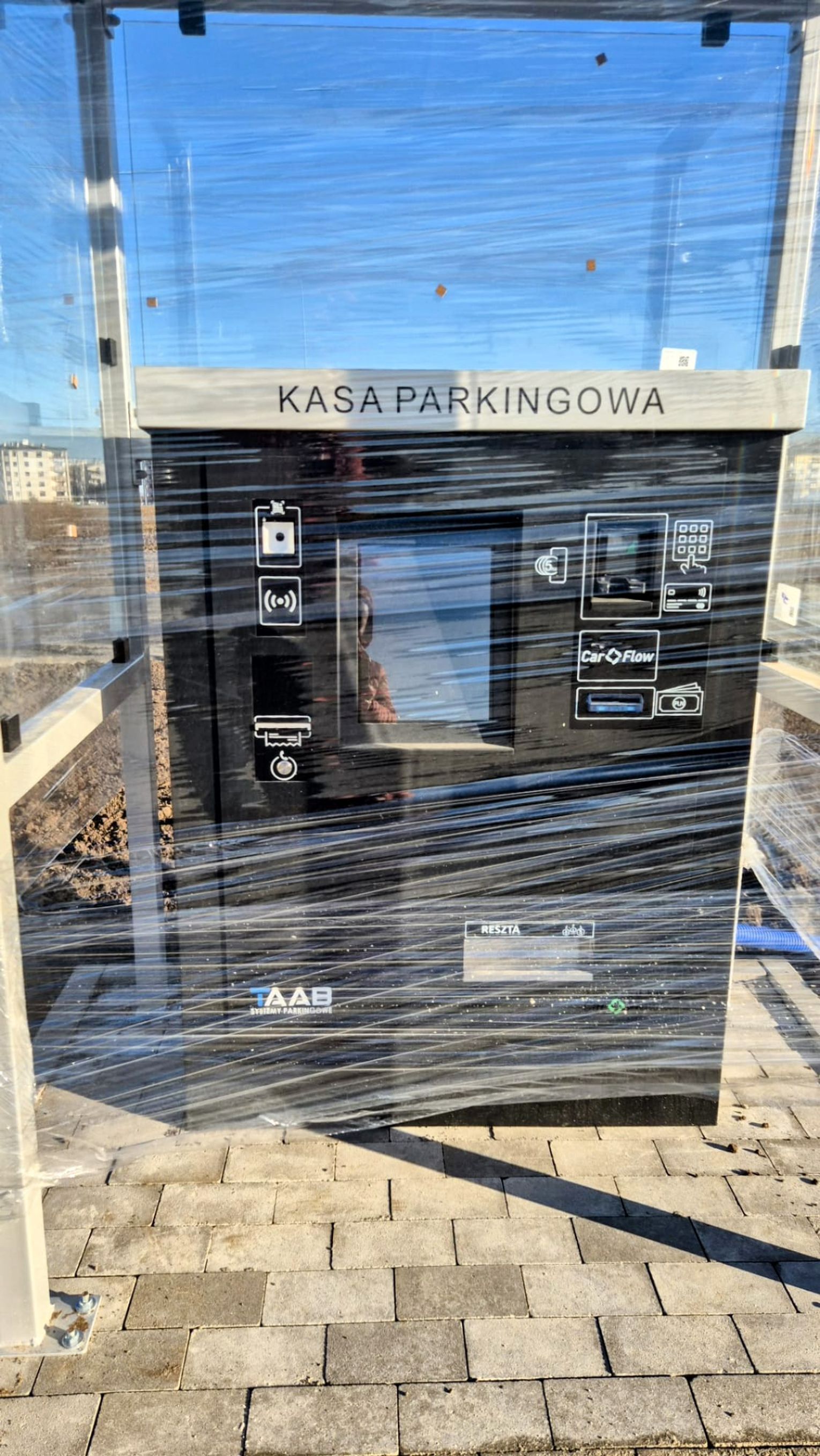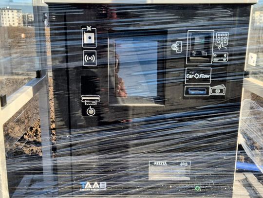 3 kasy parkingowe zlokalizowane na parkingu z zadaszeniem oraz oświetleniem solarnym/fotowoltaicznym w tym jedna przystosowana do korzystania przez osoby z niepełnosprawnościami